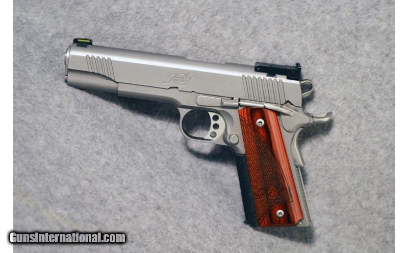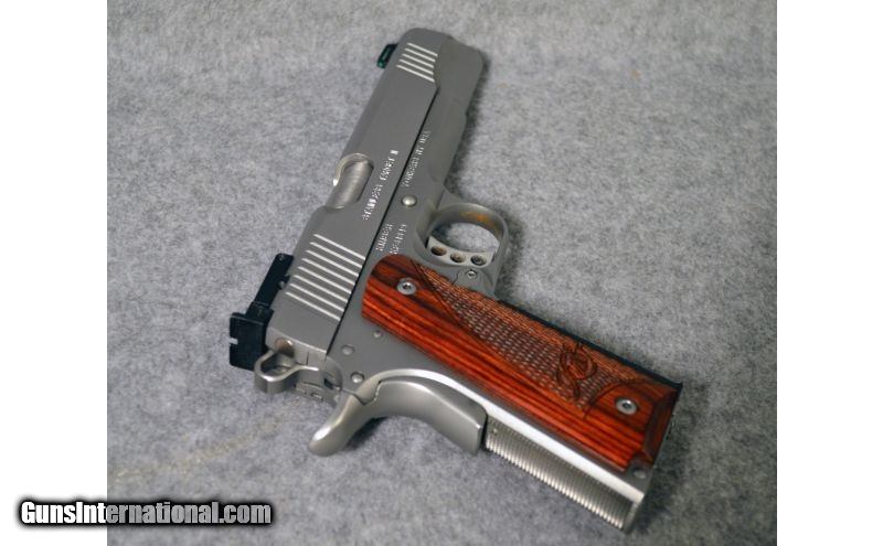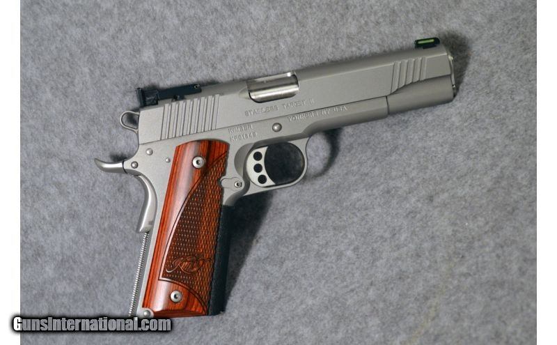 Description: A very nice Kimber Stainless Target II in 9mm Luger caliber, Metal is in excellent condition as are the wood grips. Adjustable rear sight with a fiber front glow sight. Last owner added sandpaper grip to front, which can be removed easily. SOLD Manufacturer: Recent. Caliber Info: (mm Luger. Chambers: Semi-automatic, magazine fed. Metal Condition: Very good. Bore Condition: Very good. Barrels: 5" stainless steel. Triggers: Single serrated. Weight: 42 Oz. Sights: Adjustable rear, fiber front. Extras: Comes with original case and paperwork. Item Location: Lexington, KY |