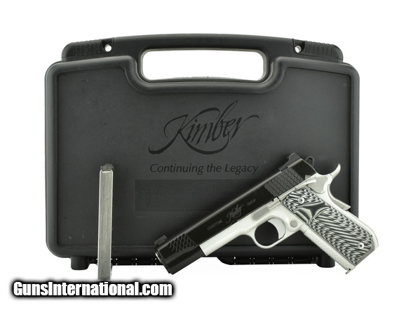 Description: Kimber Super Carry Custom 45 ACP Caliber Pistol. 2-Tone model with front and rear scale serrations and ambi-safety with night sights, box and magazine. Excellent condition.