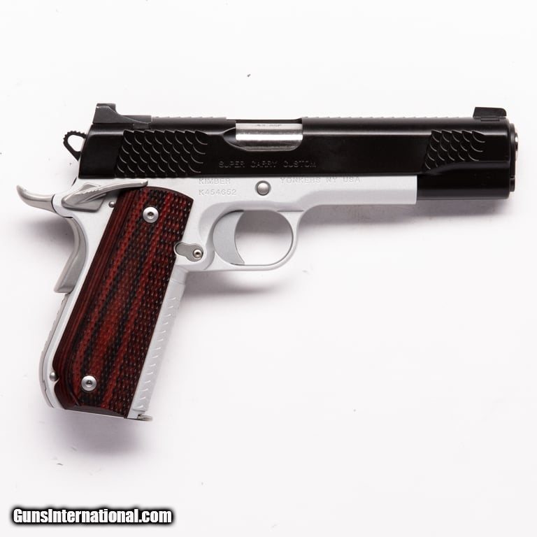 Description: Guns Listing ID: prod6945 The Kimber Super Carry is a semi-automatic 1911 pistol. It features a satin silver finish aluminum round heel frame with checkered front strap matte black KimPro II finish stainless steel slide with rear serrations match grade steel 3\", 4\", or 5\" barrel fixed low-profile tritium night sights with cocking shoulder Micartalaminated wood grips match grade solid aluminum trigger full-length guide rod and recoil spring. The Supper Carry is available in four models Ultra Ultra Plus Custom and Pro. SOLD Manufacturer: KIMBER Model: SUPER CARRY CUSTOM Caliber Info: .45 ACP Condition: new Barrels: 5 BARREL |