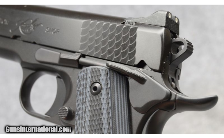 Description: SOLD Caliber Info: .45 ACP Metal Condition: Few fine scratches in the factory black finish Bore Condition: Bright and shiny Barrels: 5" Stainless steel Triggers: Serrated aluminum trigger Stock: G10 black and grey checkered grips Weight: 39 oz Sights: Dove tailed 2 dot tritium rear sight with dove tailed tritium front sight Extras: Includes plastic case Item Location: Fort Worth, TX |