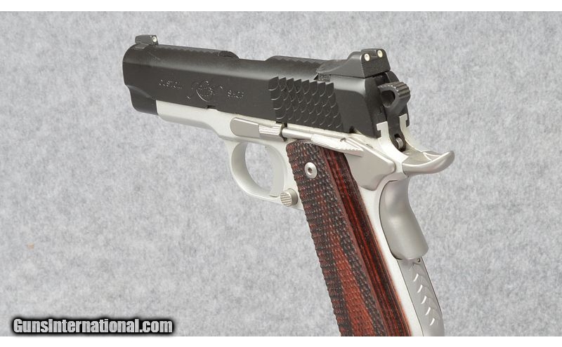 Description: Alloy frame with silver KimPro II finish, Satin black stainless slide. Pre-owned in near new condition and includes in factory carton. SOLD Caliber Info: 45 Acp Metal Condition: Couple minimal imperfections Wood Condition: Excellent Bore Condition: Bright and Sharp Barrels: 4 Inch Match Grade Barrel Triggers: Aluminum Match Grade Stock: Checkered Rosewood Panels Weight: 29 Ozs Sights: Tritium Night Sights Item Location: Buda, TX |