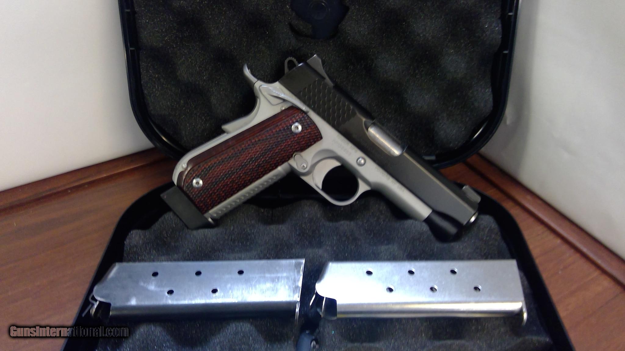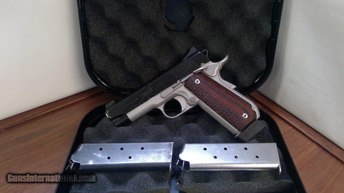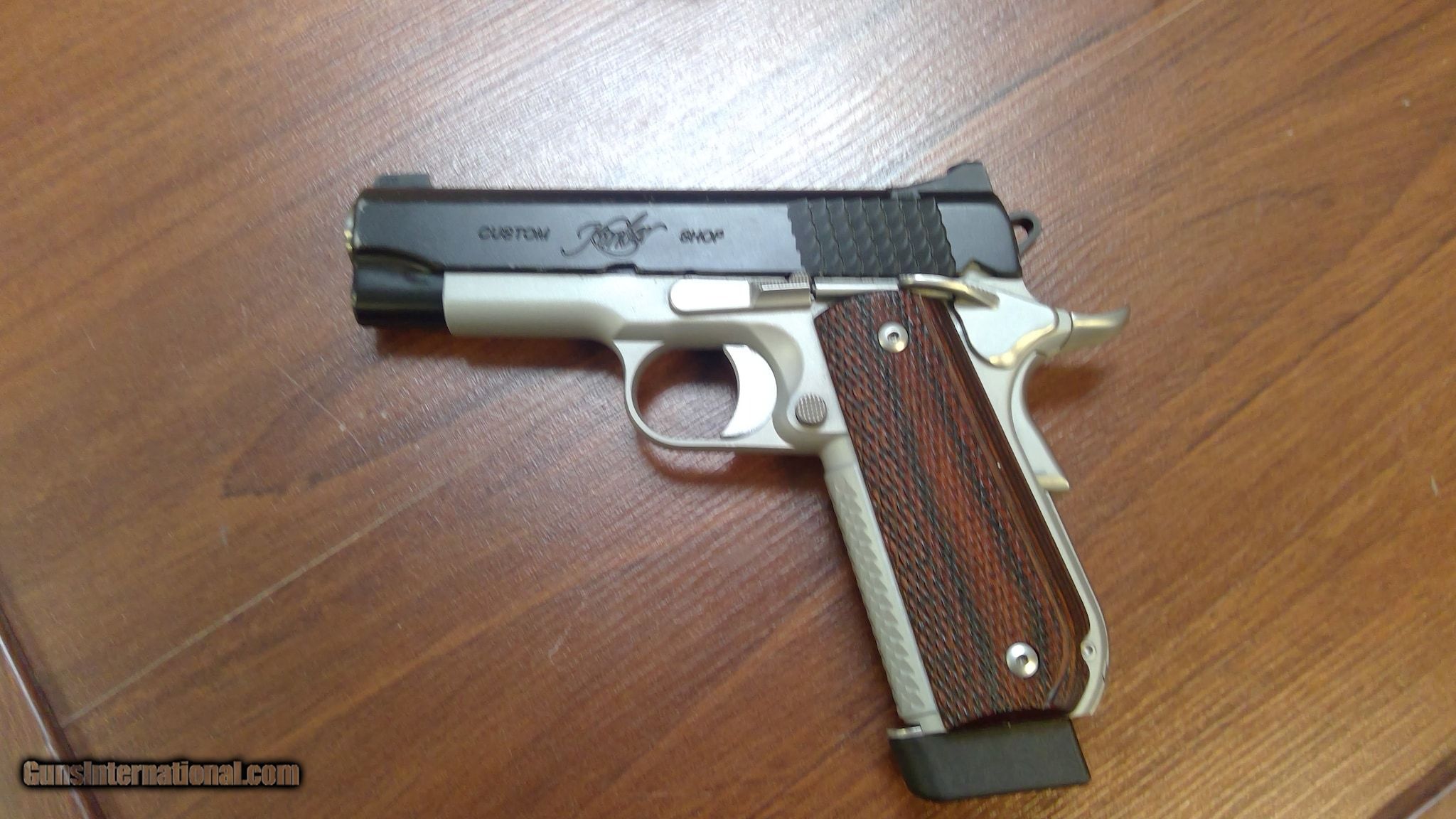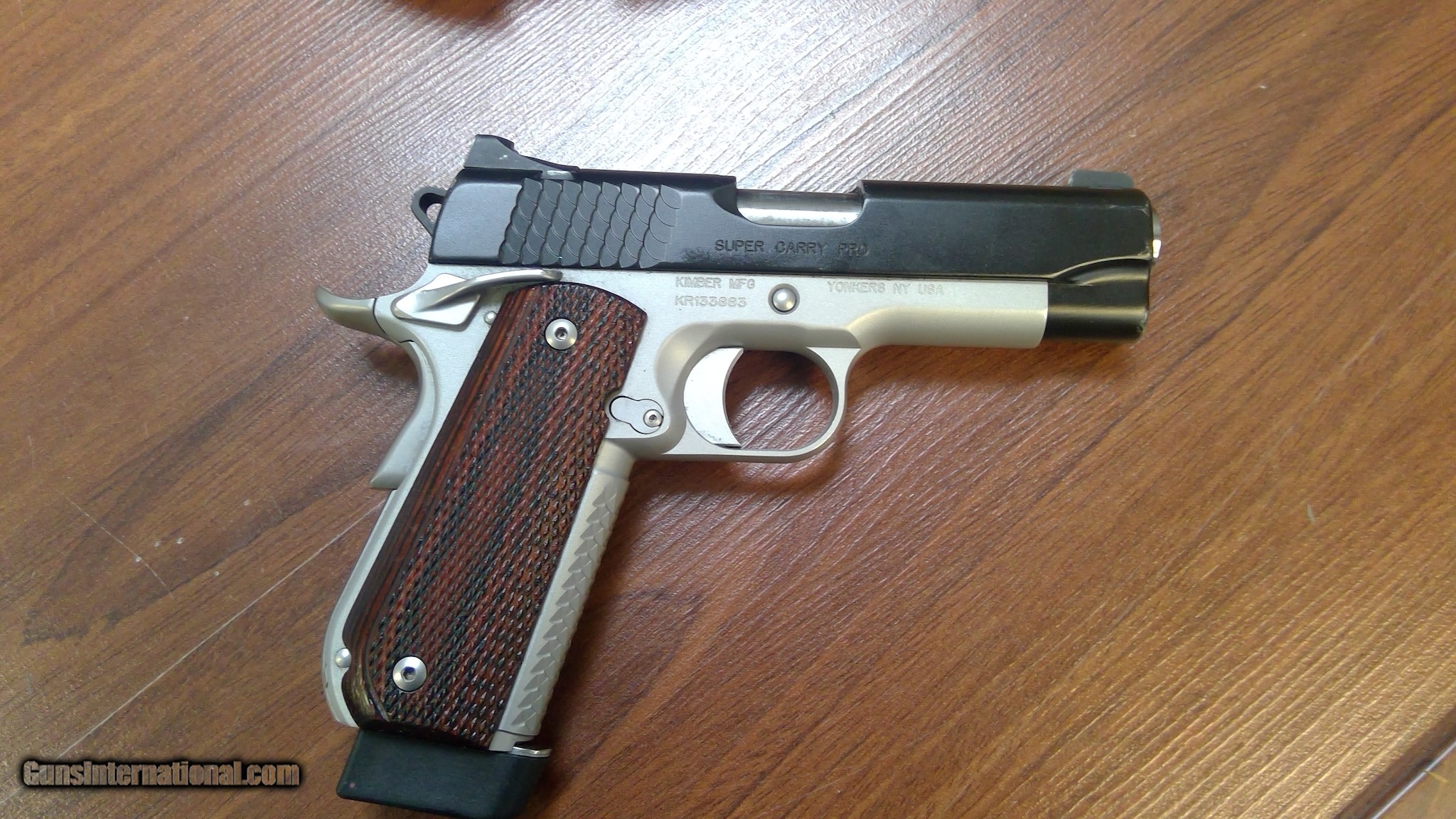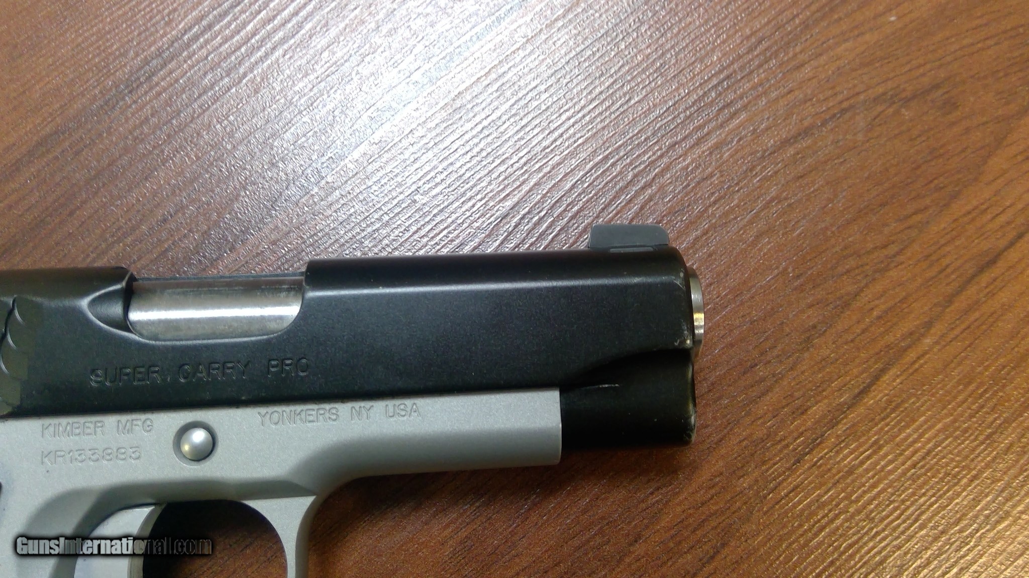 Description: Guns Listing ID: 332162 Comes with Three mags (one Kimber, one Colt, and one no-name) In a Glock hard case Has some wear marks on slide (see pictures) Night Sights SOLD Manufacturer: KIMBER Model: Super Carry Pro Caliber Info: .45 ACP Condition: Used - Non-Certified Barrels: 4 BARREL Finish: TWO TONE. BLACK/SILV |