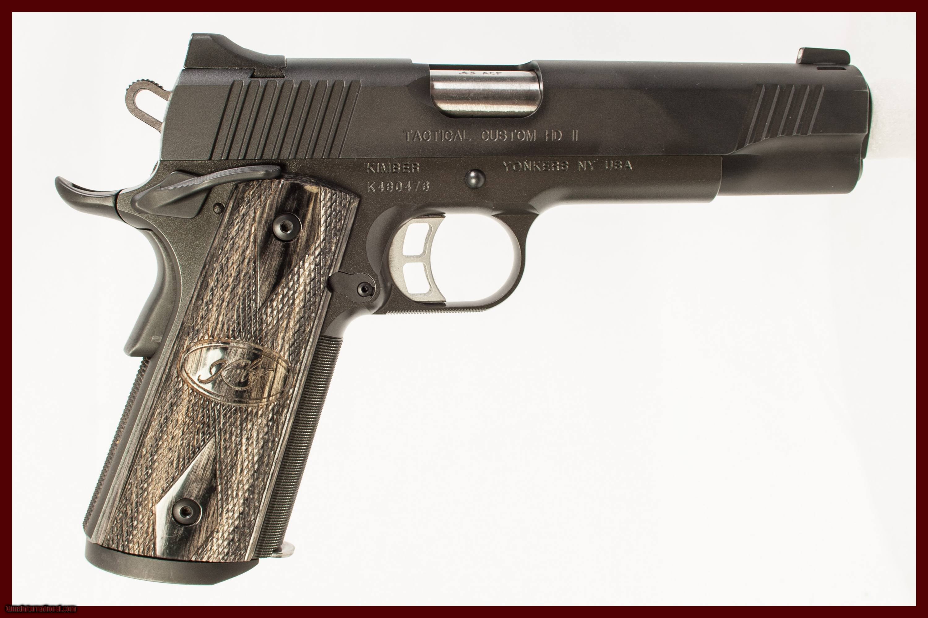 KIMBER TACTICAL CUSTOM HD II CHAMBERED IN 45ACP WITH A 5 INCH BARREL COMES WITH 1 EXTRA MAG. THIS GUN IS IN EXCELLENT CONDITION AND IS COVERED BY DURY'S LIFETIME WARRANTY.