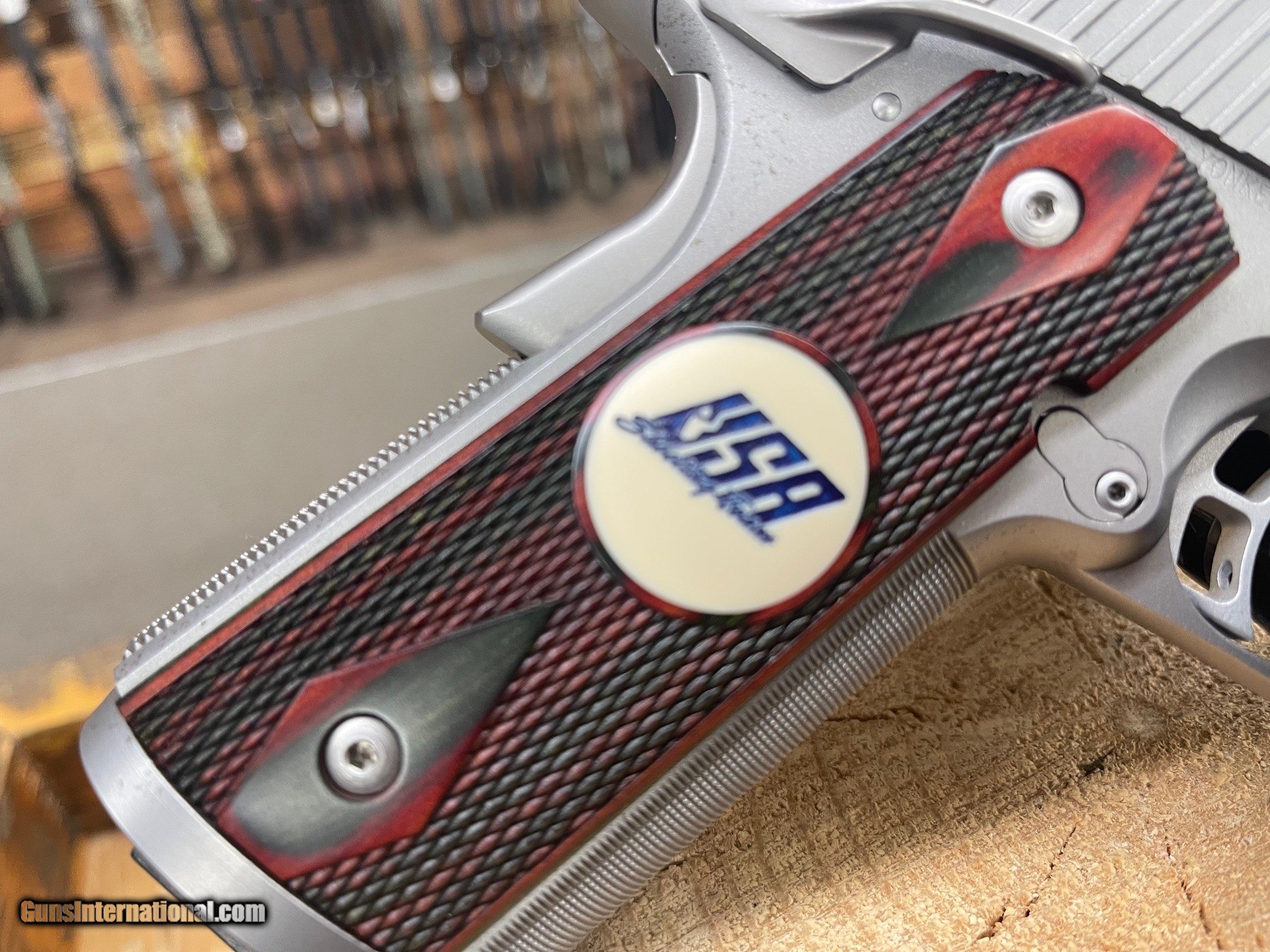 Description: Guns Listing ID: 501517 Features: From the Kimber Custom Shop™-the finest all-around pistol ever offered by Kimber®. 38 Super Specifications: Height (inches) 90° to barrel: 5.5 Weight (ounces) with empty magazine: 38 Length (inches): 8.7 Magazine capacity: 8 Magazine well Ambidextrous thumb safety Recoil spring (pounds): 16 Full length guide rod Accuracy Guarantee: 5-shot, 25-yard group 1-inch or less Full blade rear sight SOLD Manufacturer: KIMBER Model: TEAM MATCH II Caliber Info: .38 SUPER +P Condition: Used - Non-Certified Barrels: 5 Action: SEMI AUTOMATIC Finish: silver and walnut |