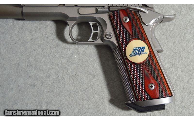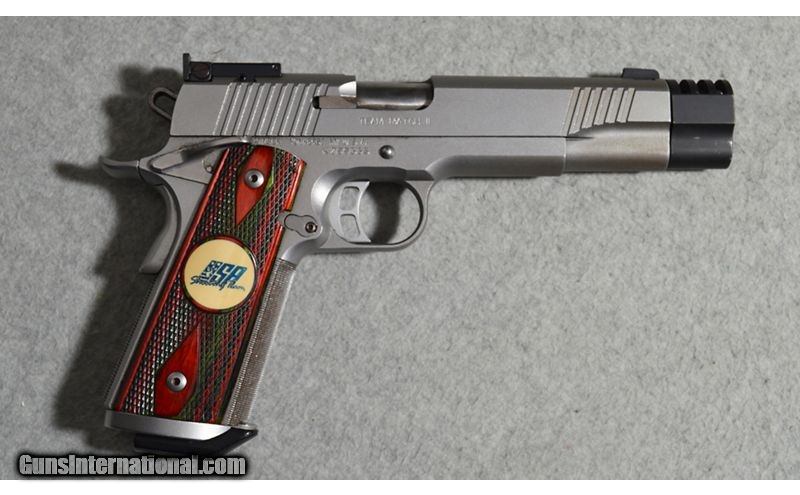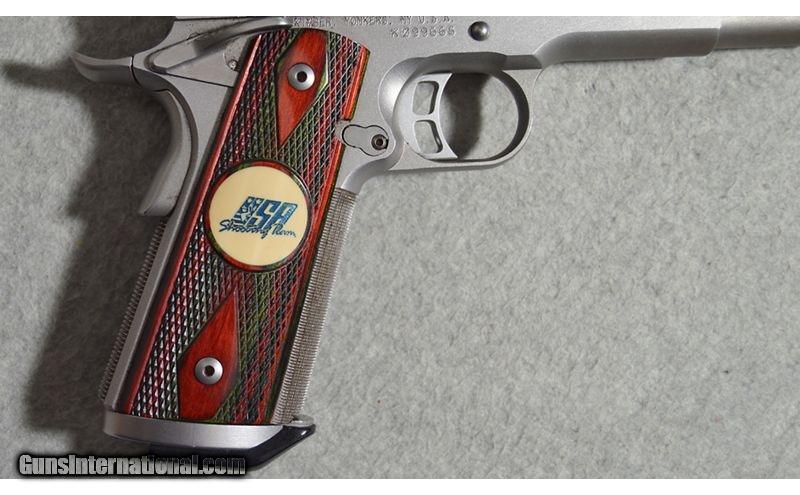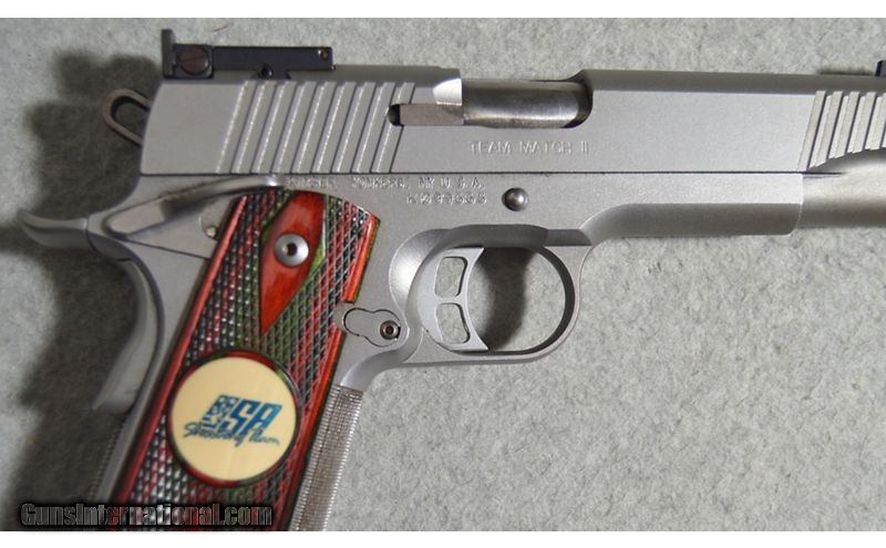 Description: The Team Match II .45 ACP is used by the U.S.A. Shooting Rapid Fire Pistol Team to train for Olympic competition. The gun was not made for the Olympics. It's purpose is to be legal in as many matches possible, so the Team could get in as many matches under their belts as possible, before the Olympics. This used gun has its original box included. .45 Auto SOLD Metal Condition: Very good with minor handling marks Wood Condition: Very good with minor wear and handling marks Very good with minor wear and handling marks Bore Condition: Bright and clear with good rifling Barrels: Aftermarket compensator affixed to tip Stock Dimensions: USA Shooting Team rosewood grips Weight: 2 LB 11 OZ Sights: Rear notch/front blade Item Location: Fort Worth, TX |