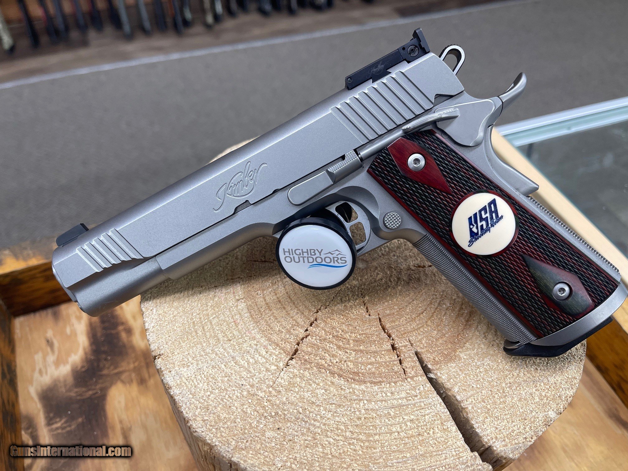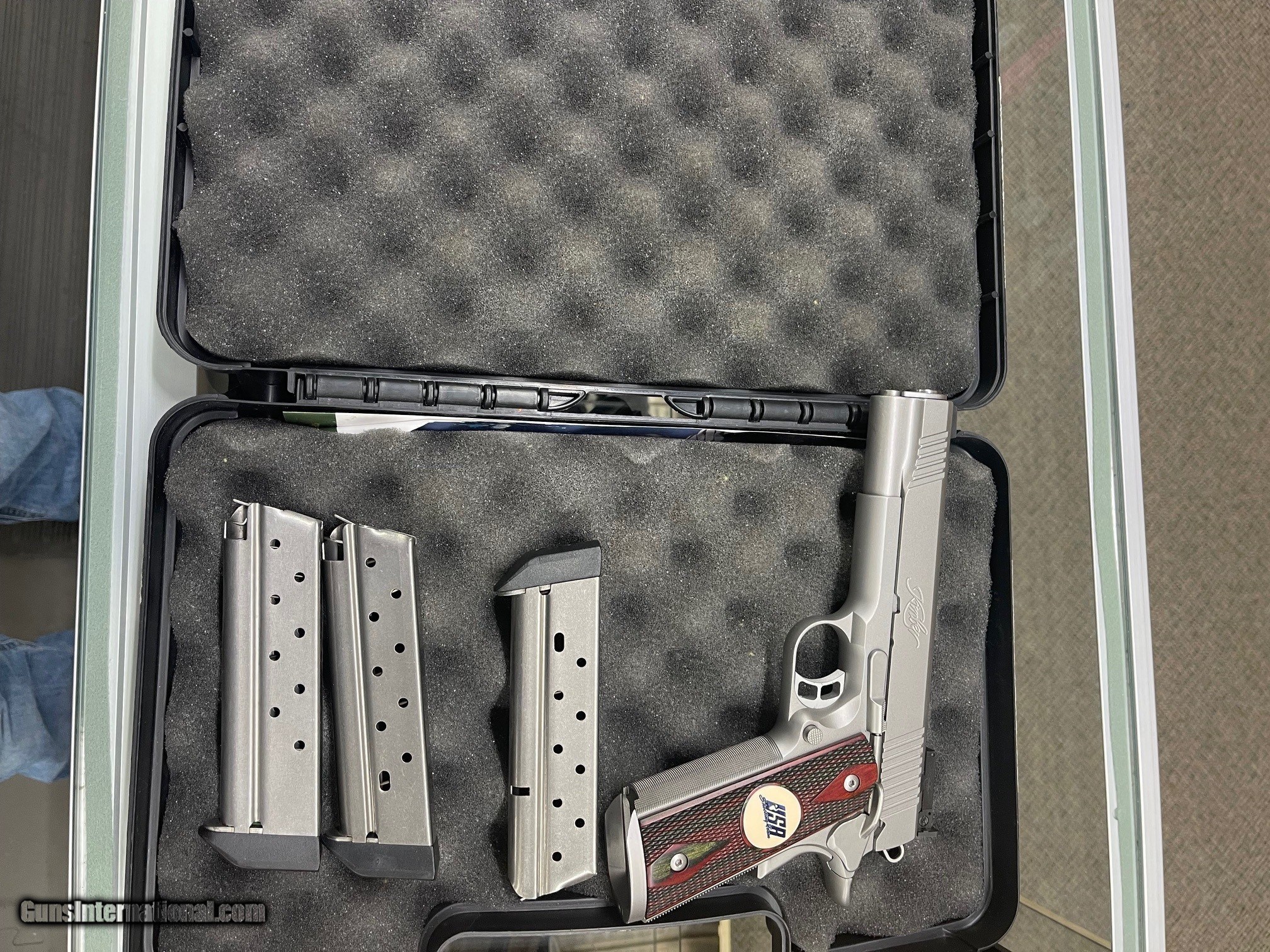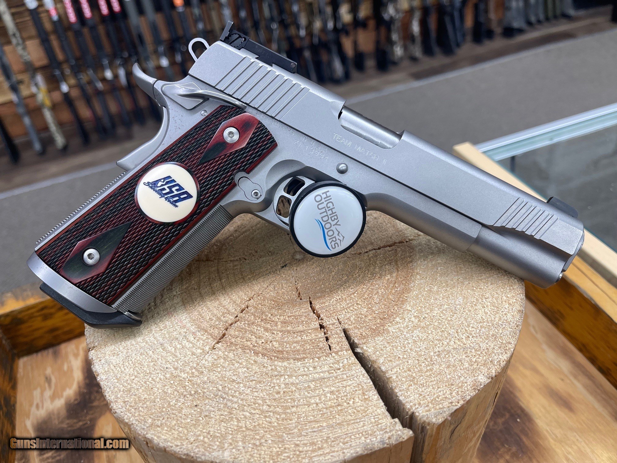 Description: Features: From the Kimber Custom Shop™-the finest all-around pistol ever offered by Kimber® . 38 Super Specifications: Height (inches) 90° to barrel: 5.5 Weight (ounces) with empty magazine: 38 Length (inches): 8.7 Magazine capacity: 8 Magazine well Ambidextrous thumb safety Recoil spring (pounds): 16 Full length guide rod Accuracy Guarantee: 5-shot, 25-yard group 1-inch or less Full blade rear sight SOLD Handgun Caliber: .38 Super Auto Manufacturer: Kimber Model: Team Match II Barrel Length: 5 |