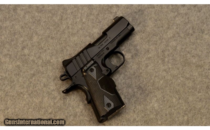 Description: This is a pre-owned Kimber Ultra Aegis II. SOLD Caliber Info: 9mm Metal Condition: Excellent condition. Wood Condition: Excellent condition. Bore Condition: Clean with bright lands. Barrels: 3 inch Triggers: Match grade solid aluminum. Stock: Crimson Trace black and grey laser grips. Weight: 1 3/4 lbs. Sights: XS style large dot front sight with low mount black rear sight. Extras: Comes with the factory case, manual, 1 Kimber 9 round magazine, and a set of Crimson Trace laser grips. Item Location: Glendale, AZ |