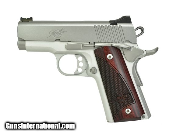 Description: Kimber Ultra Carry II .45 ACP caliber pistol. Stainless 3” carry gun. Has fiber optic sight and wood grips. Excellent condition with box.
