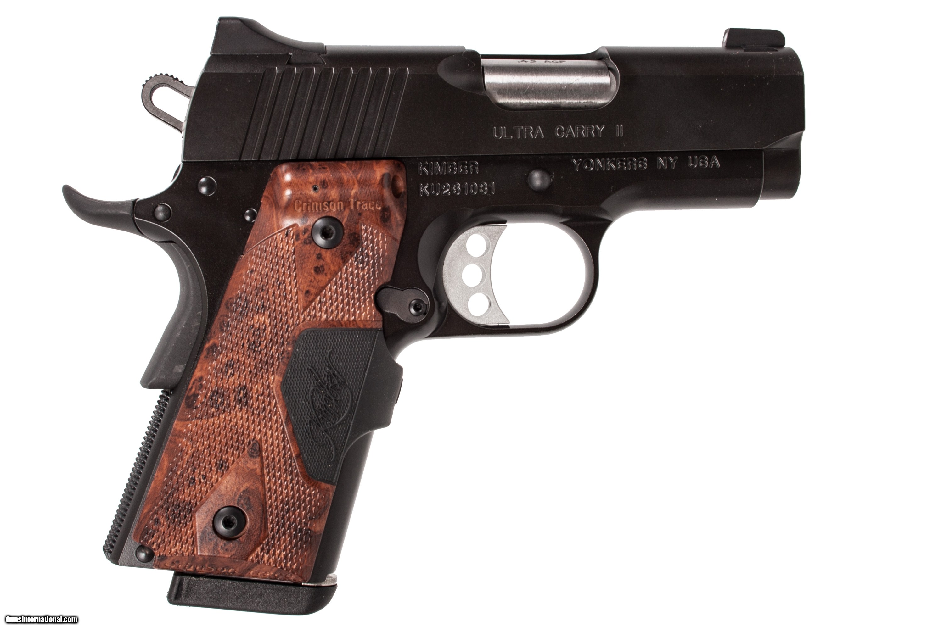 Kimber Ultra Carry II chambered in 45 acp with a 3 inch barrel case and Crimson Trace laser grips. This gun is in excellent condition and is covered by Dury's Lifetime Warranty.