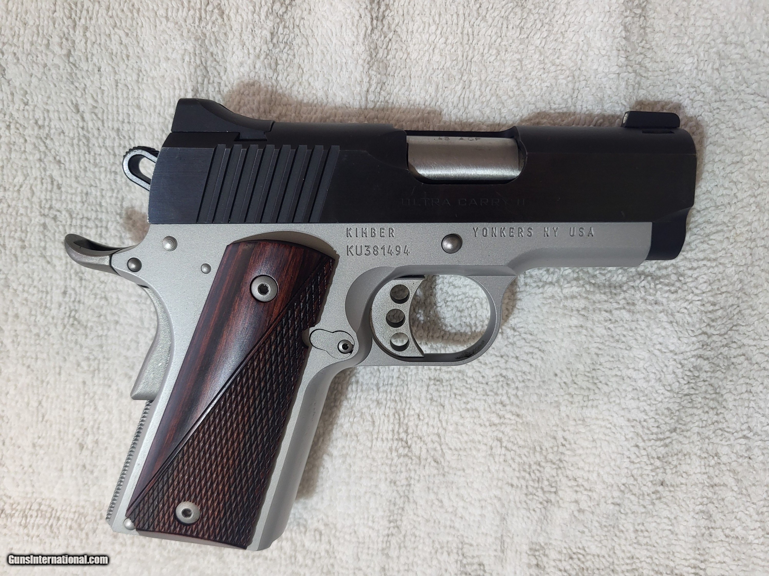 Description: Up for sale or best offer is a Kimber Ultra Carry II .45 ACP pistol . Got this in a recent trade . Pistol comes with original box , 5 Magazines "see pictures" , lock , manual , and has the action tuned to 2.8 ,lbs pull., 400 rounds of Monarch 230 gr FMJ Ammo . Appearance is 95 % except for a few tics on the left hand of the slide. Functions perfectly. Call with any questions as texting has been spotty both receiving and sending . SOLD Handgun Caliber: .45 ACP (.45 Auto) Manufacturer: Kimber Model: Ultra Carry II Serial Number: KU381494 Bore: Excellent Condition: Very Good / Excellent Metal Condition: Excellent Action: DA Finish: Silver / Blue |