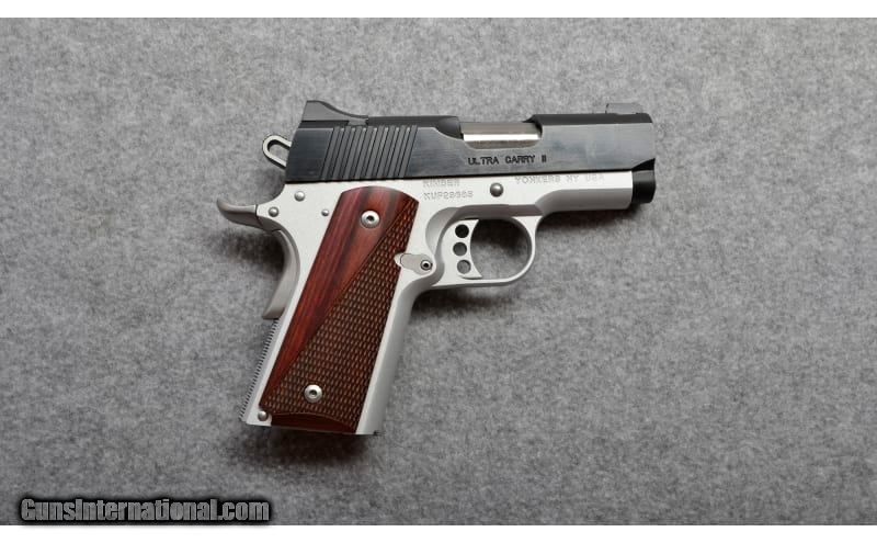 Description: Pre-owned Kimber Ultra Carry II chambered in 9MM, 3" barrel, steel slide, low profile sights, checkered rosewood grips, aluminum 3-hole trigger. 9mm Luger SOLD Metal Condition: Very Good Condition Wood Condition: Very Good Condition Bore Condition: Bright and shiny with very good rifling Barrels: 3 Inches. Weight: 25 oz Sights: 3-white dot sights Item Location: Springfield, OR |