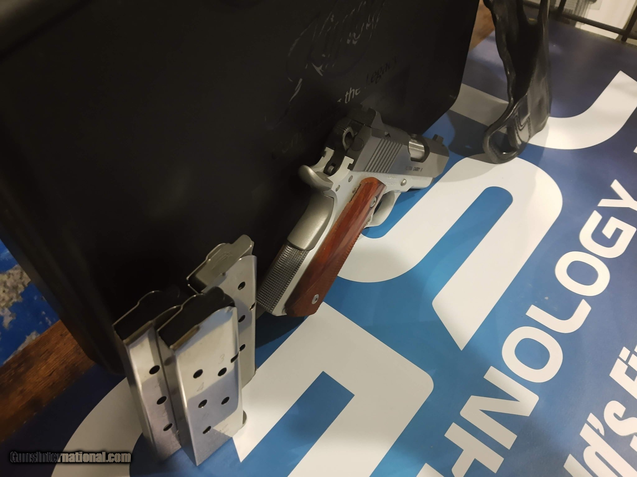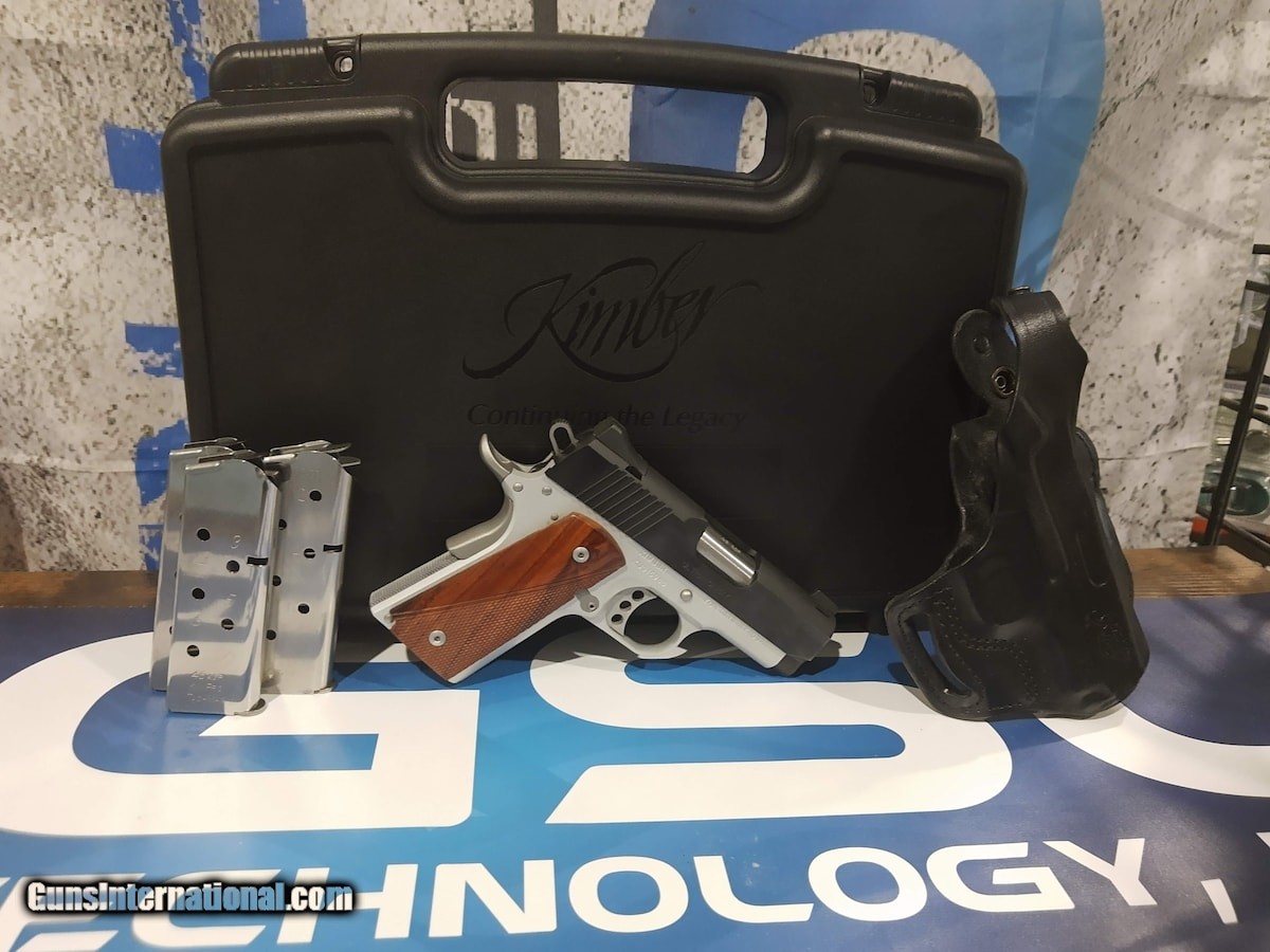 Description: Guns Listing ID: 448574 This is a gently used Kimber Ultra Carry II in very good condition. It comes with the original box, 4 magazines, and a leather OWB holster. The Ultra Carry II (Two-Tone) is a hallmark of Kimber quality, complete with a brushed-polished carbon slide, aluminum frame and smooth/checkered rosewood grips. SPECIFICATIONS Height (inches) 90° to barrel: 4.75 Weight (ounces) with empty magazine: 25 Length (inches): 6.8 Magazine capacity: 7 Recoil spring (pounds): 18.0 Full-length guide rod FRAME Material: Aluminum Finish: Satin silver Width (inches): 1.28 SLIDE Material: Steel Finish: Matte black, brush-polished BARREL Length (inches): 3 Material: Stainless steel, match grade Stainless steel match grade bushing Twist rate (left hand): 16 Ramped SIGHTS Fixed low profile Radius (inches): 4.8 GRIPS Smooth/checkered rosewood TRIGGER Aluminum, three hole standard Factory setting (approximate pounds): 4.0 - 5.0 PRODUCT CODE Product #: 3200321 UPC: 669278323213 SOLD Manufacturer: KIMBER Model: Ultra Carry II (Two Tone) Caliber Info: 45ACP Condition: Used - Non-Certified Barrels: 3 BARREL Finish: TWO-TONE |