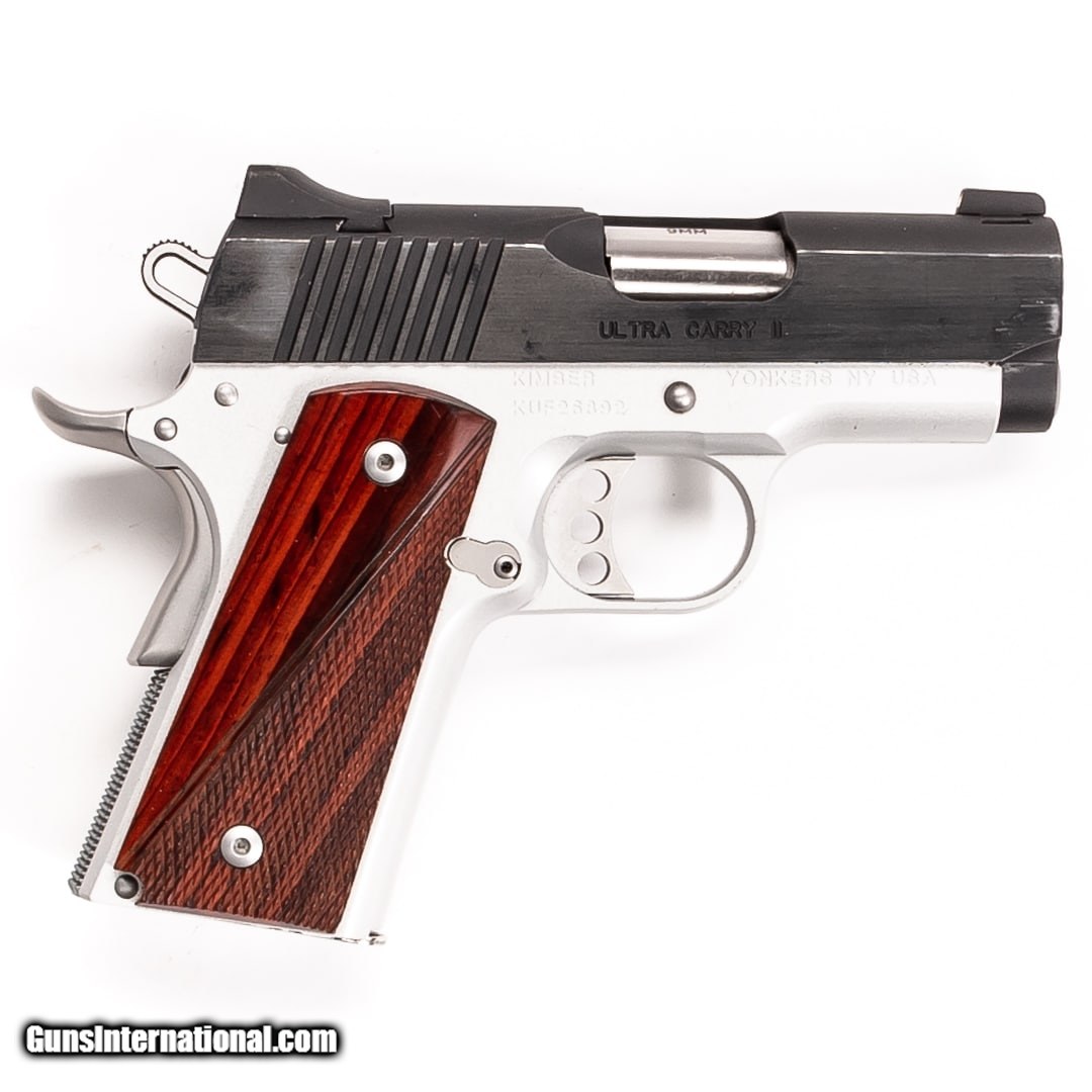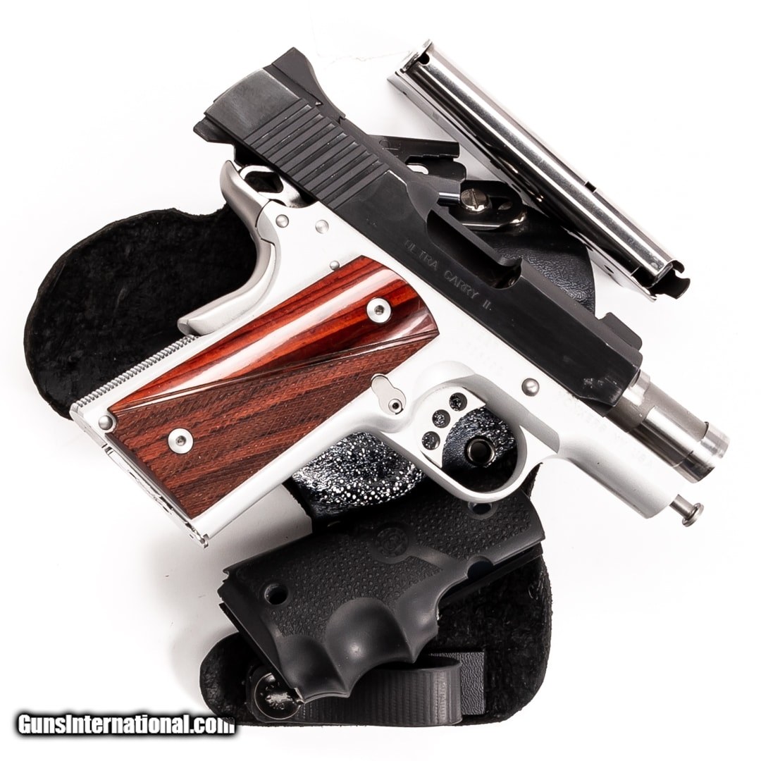 Description: Guns Listing ID: 295212 The Kimber Ultra Carry II is a premium-grade compact 1911 that's packed full of features. With a match-grade barrel, low-profile sights, a match-grade trigger, and Rosewood grips, this scaled down 1911 is a perfect choice for personal protection, home-defense, and as a backup duty sidearm. 2-8 round magazines, a leather holster, additional rubber grips, and the original paperwork are included. There is holster wear on this Kimber from daily carrying. SOLD Manufacturer: KIMBER Model: ULTRA CARRY II Caliber Info: 9MM LUGER (9X19 PARA) Condition: Used - Certified Barrels: 3 BARREL Finish: TWO-TONE STAINLESS |