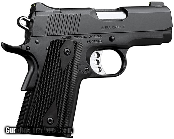 Description: Guns Listing ID: 604198 The Kimber Ultra Carry II is a semi automatic handgun available in 9mm and .45 ACP. A hallmark of Kimber quality, the Ultra Carry II features a brushed-polished carbon slide, aluminum frame with satin silver finish and smooth/checkered rosewood grips. It‚‚s reduced dimensions and light weight make this pistol a great option for concealed carry. This model is chambered in .45 ACP, features a matte black finish for both frame and slide, and has black synthetic double diamond grips SOLD Manufacturer: KIMBER Model: ULTRA CARRY II Caliber Info: .45 ACP Condition: new Barrels: 3 BARREL |