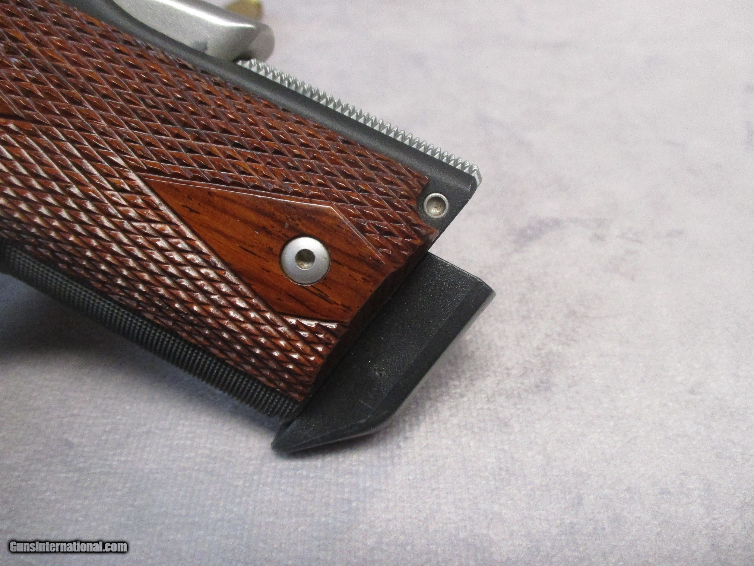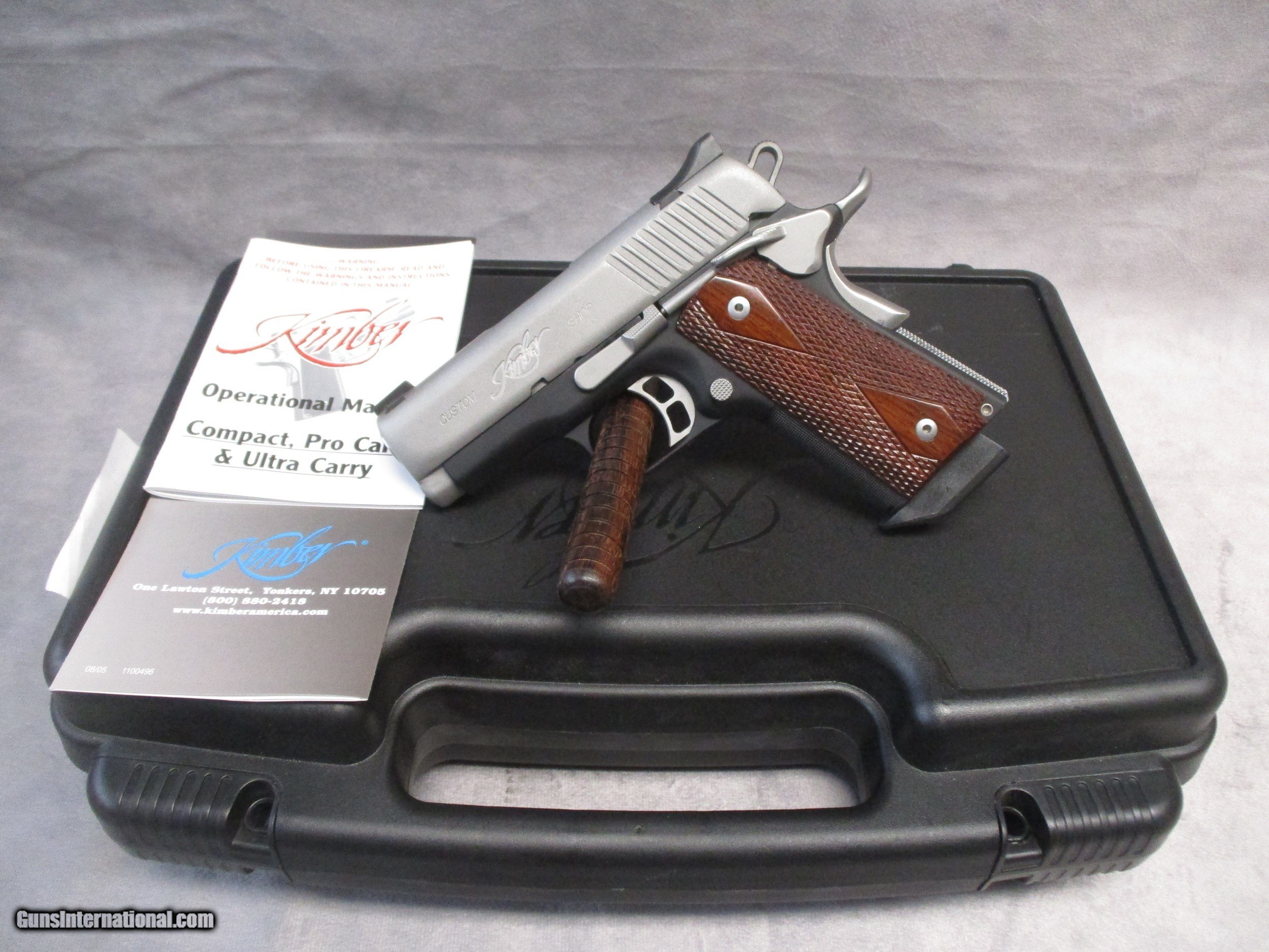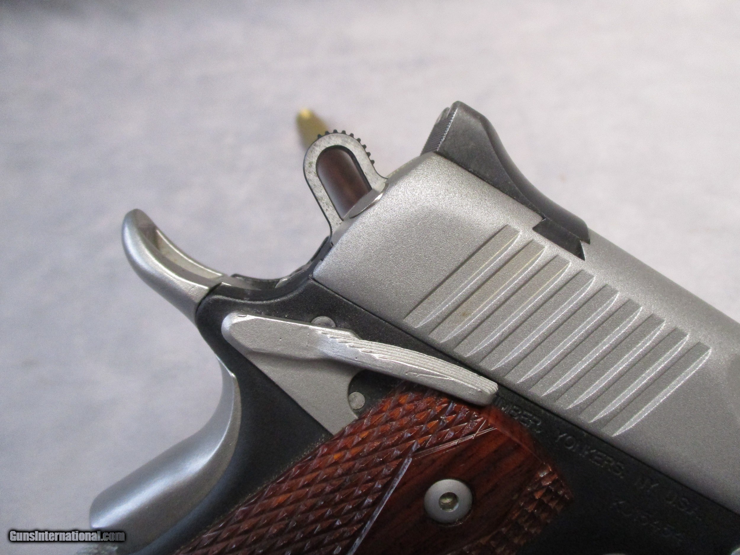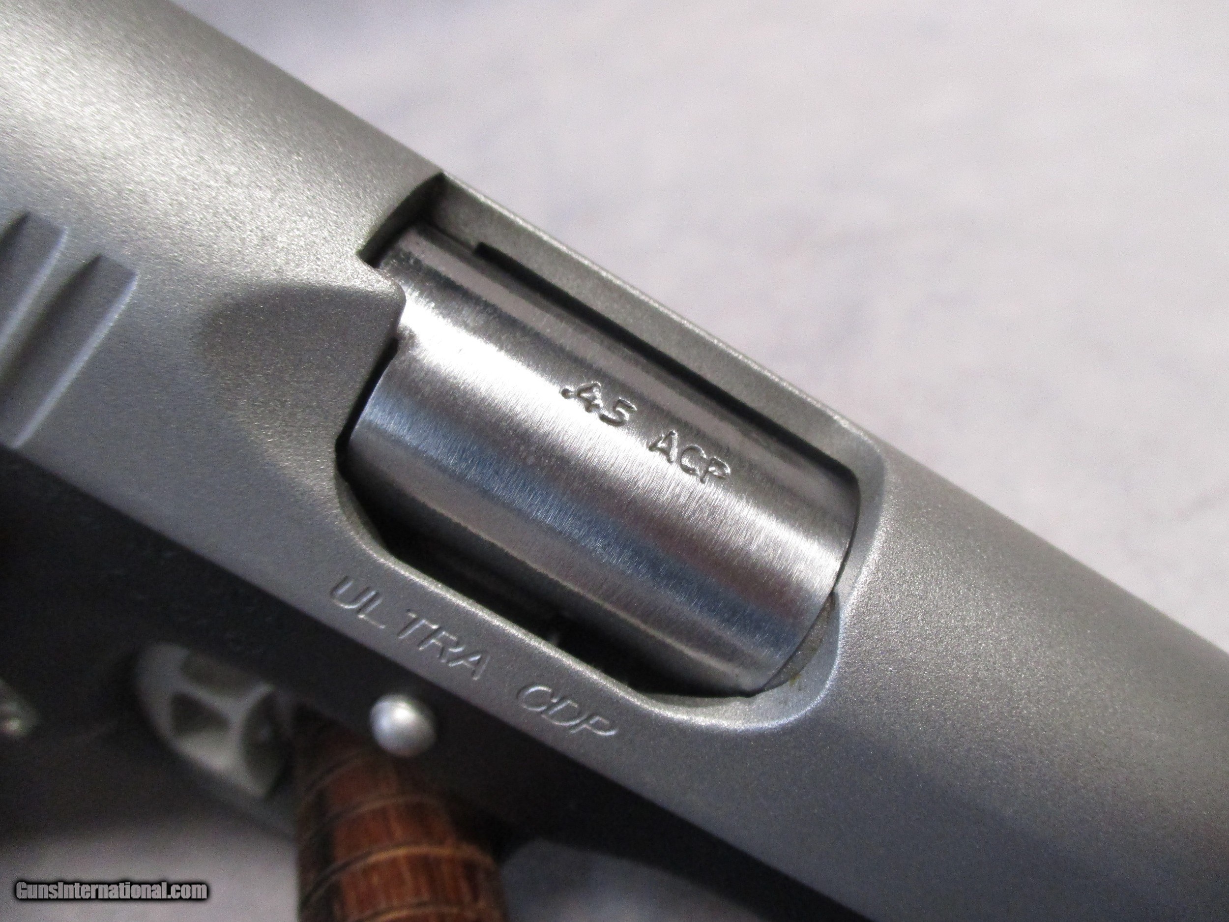 Description: This is one of Kimber’s earlier pistols, designed for concealed carry. To make this possible for their 1911, Kimber used a slide design that featured smoothed surfaces via Kimber’s Carry melt treatment. In this regard, the slide’s external surfaces have been rounded to reduce snagging. The outcome is a slim design, similar in concept to a Glock 36. The finger relief cuts on the frame are much smoother than those found on full-size 1911s. Barrel length is four inches, slightly less than the barrel on a typical Officer’s model. The safety is ambidextrous for those who are left-handed or for situations where an injured person may be forced to use their offhand. The front and backstrap of the grip feature serrations to help the user control the pistol during recoil. The pistol is equipped with Meprolight Tritium 3-dot night sights. They have dimmed over time but replacements should not be hard to find. There is some light rust on top of rear sight. The bore is in excellent condition and the rosewood grips look like they were made yesterday. Trigger pull is crisp and is set between four and five pounds. The pistol comes with a 7-round magazine, and a Kimber box, though it is not the original one, being marked for a Pro CDP II. The Ultra CDP is a reliable, light-weight pistol with excellent stopping power; if you are looking for a .45 for concealed carry, this would be a fine choice. SOLD Handgun Caliber: .45 ACP (.45 Auto) Manufacturer: Kimber Mfg. Model: Ultra CDP Serial Number: KU15454 Bore: Rifled, 1:16 twist Condition: Good to Excellent Barrel Type: Match grade, bushing-less Action: Semi-Auto, Short recoil, Locked Breech Triggers: Premium aluminum, match grade, 4.0-5.0 lbs. pull Stock: Rosewood, Double Diamond Finish: Frame: Matte black Kim Pro II finish. Slide: Satin Silver Weight: 25 oz. with empty magazine Sights: Meprolight Tritium 3-dot nigh sight, fixed, radius 4.8 inches (122 mm) Case: Kimber box, see description |