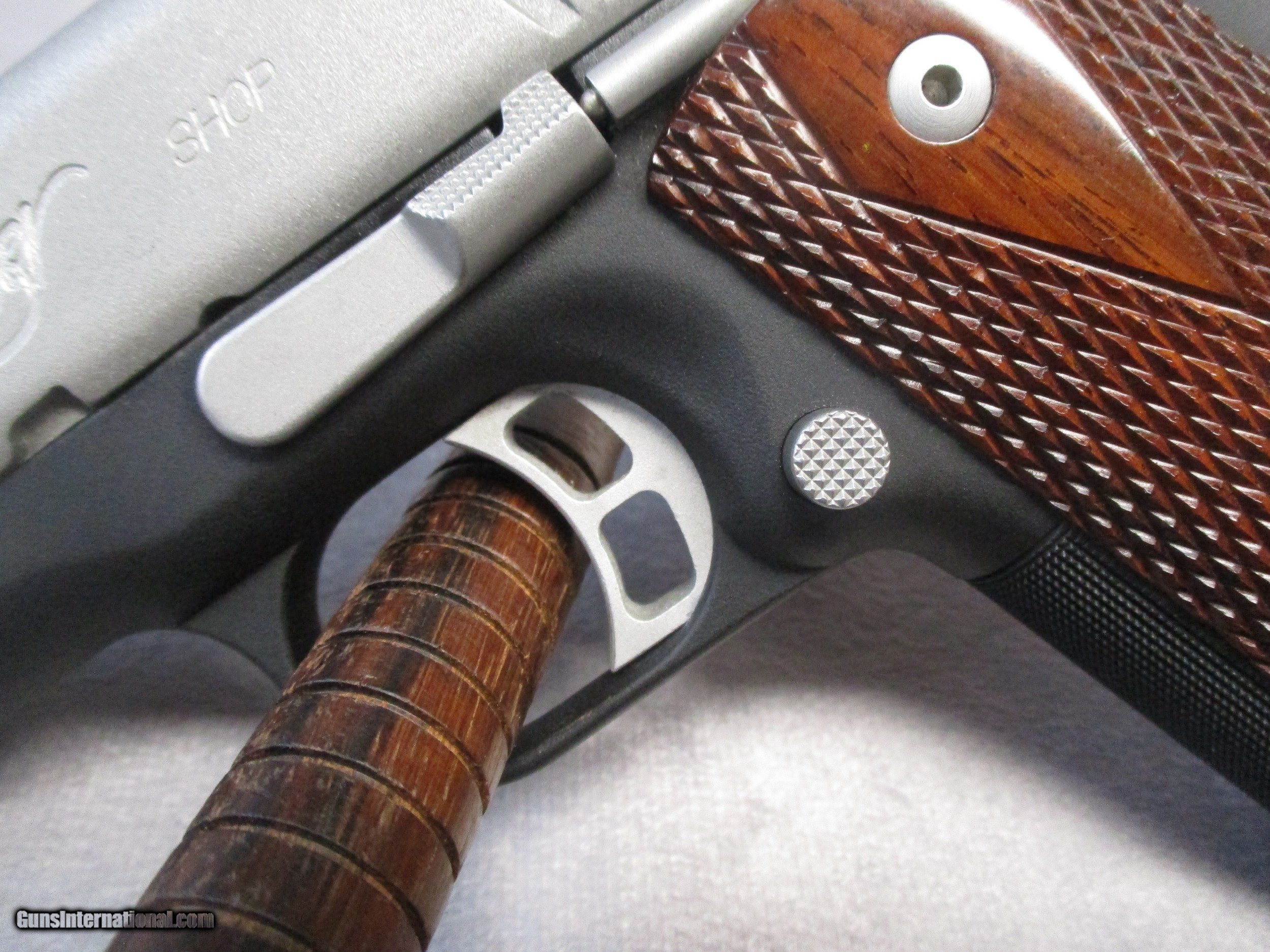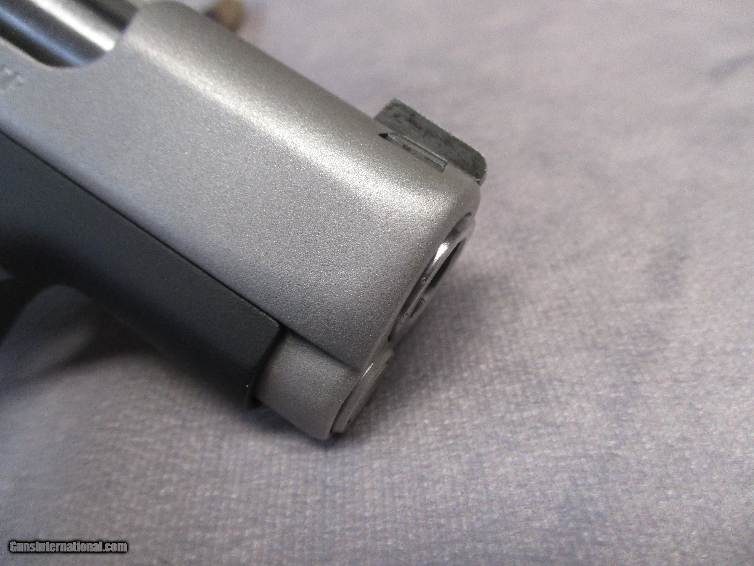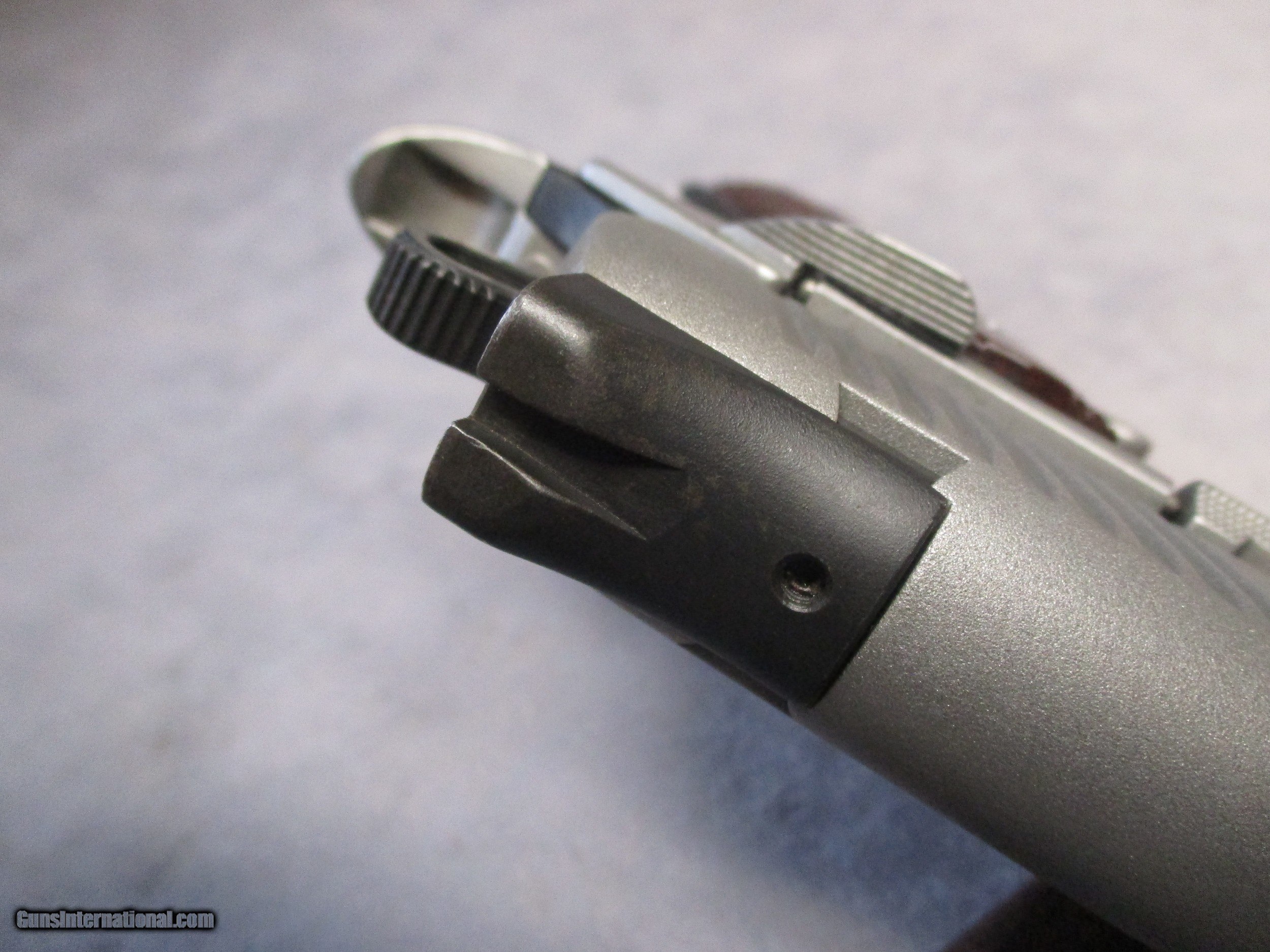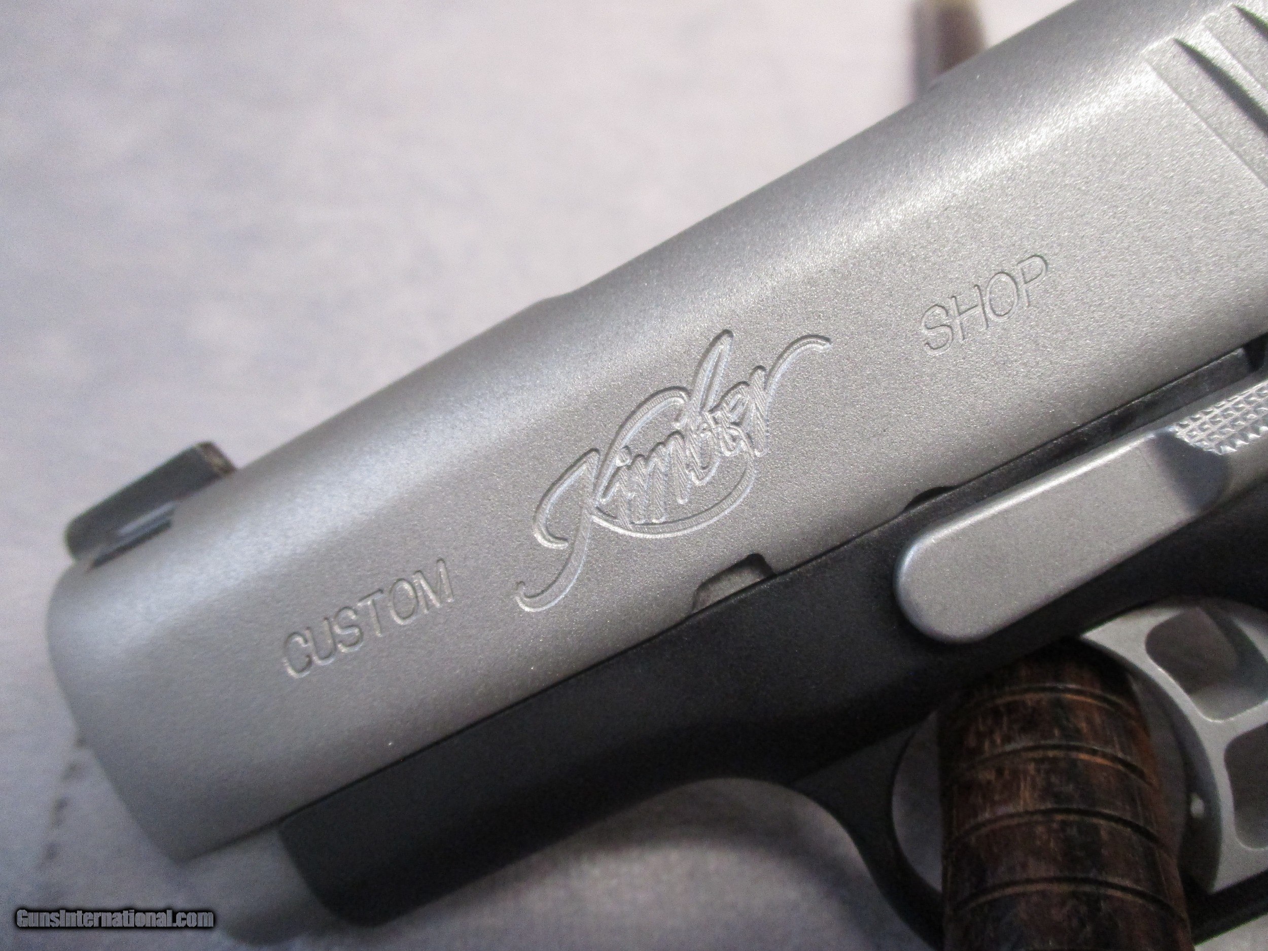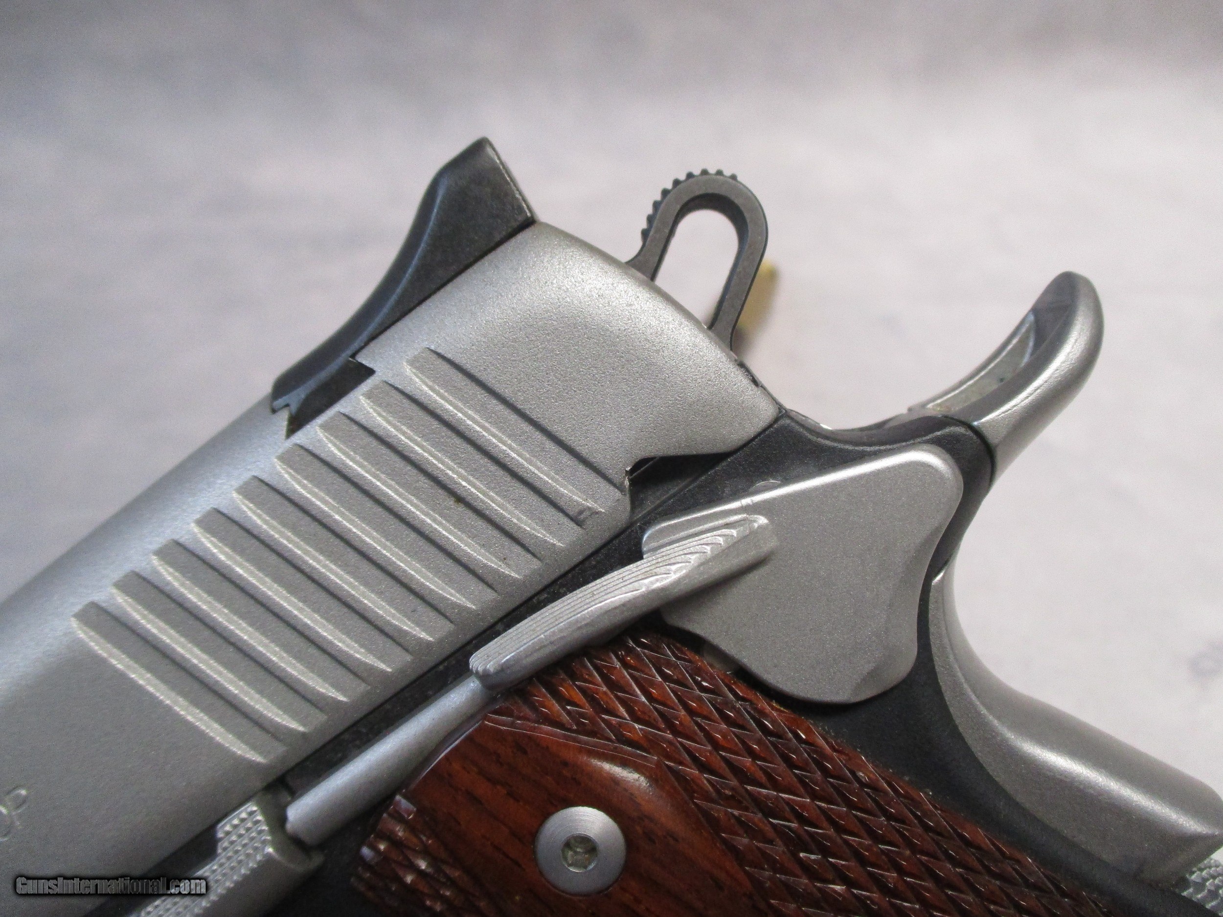 Description: This is one of Kimber’s earlier pistols, designed for concealed carry. To make this possible for their 1911, Kimber used a slide design that featured smoothed surfaces via Kimber’s Carry melt treatment. In this regard, the slide’s external surfaces have been rounded to reduce snagging. The outcome is a slim design, similar in concept to a Glock 36. The finger relief cuts on the frame are much smoother than those found on full-size 1911s. Barrel length is four inches, slightly less than the barrel on a typical Officer’s model. The safety is ambidextrous for those who are left-handed or for situations where an injured person may be forced to use their offhand. The front and backstrap of the grip feature serrations to help the user control the pistol during recoil. The pistol is equipped with Meprolight Tritium 3-dot night sights. They have dimmed over time but replacements should not be hard to find. There is some light rust on top of rear sight. The bore is in excellent condition and the rosewood grips look like they were made yesterday. Trigger pull is crisp and is set between four and five pounds. The pistol comes with a 7-round magazine, and a Kimber box, though it is not the original one, being marked for a Pro CDP II. The Ultra CDP is a reliable, light-weight pistol with excellent stopping power; if you are looking for a .45 for concealed carry, this would be a fine choice. SOLD Handgun Caliber: .45 ACP (.45 Auto) Manufacturer: Kimber Mfg. Model: Ultra CDP Serial Number: KU15454 Bore: Rifled, 1:16 twist Condition: Good to Excellent Barrel Type: Match grade, bushing-less Action: Semi-Auto, Short recoil, Locked Breech Triggers: Premium aluminum, match grade, 4.0-5.0 lbs. pull Stock: Rosewood, Double Diamond Finish: Frame: Matte black Kim Pro II finish. Slide: Satin Silver Weight: 25 oz. with empty magazine Sights: Meprolight Tritium 3-dot nigh sight, fixed, radius 4.8 inches (122 mm) Case: Kimber box, see description |