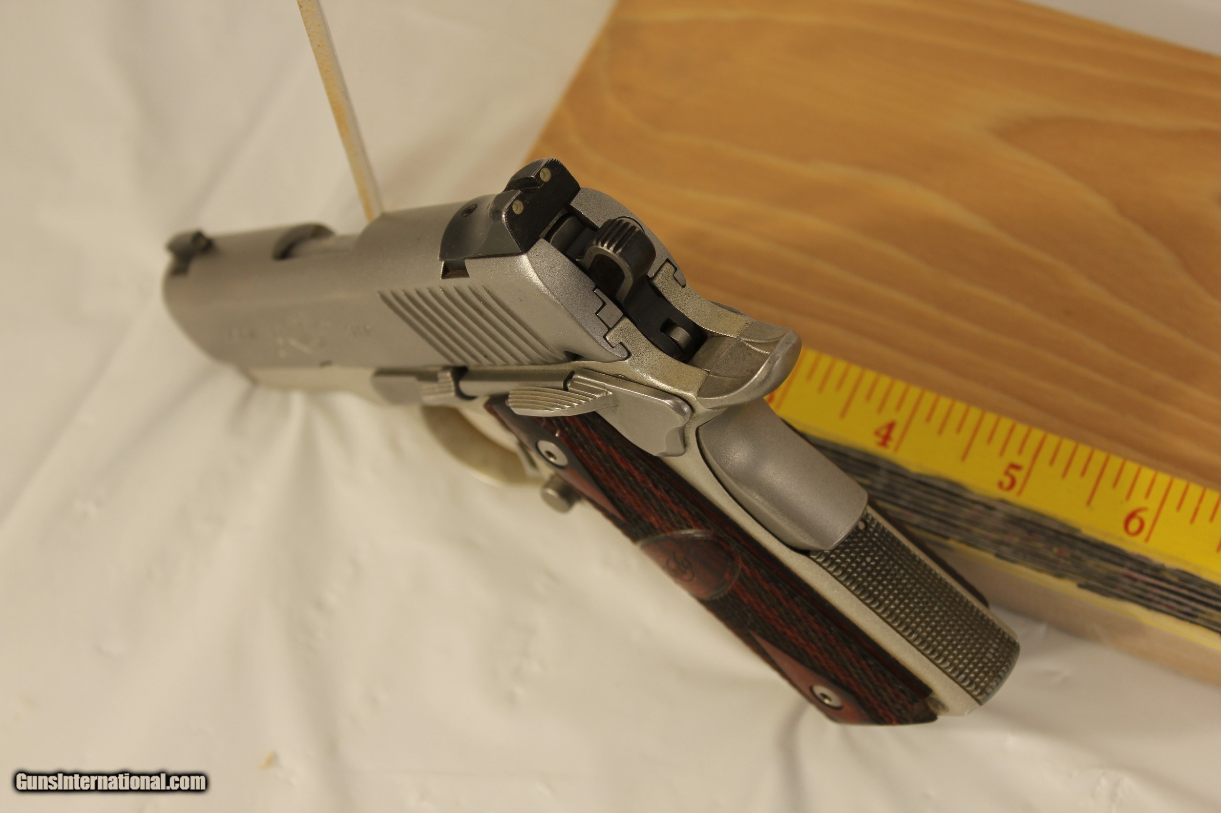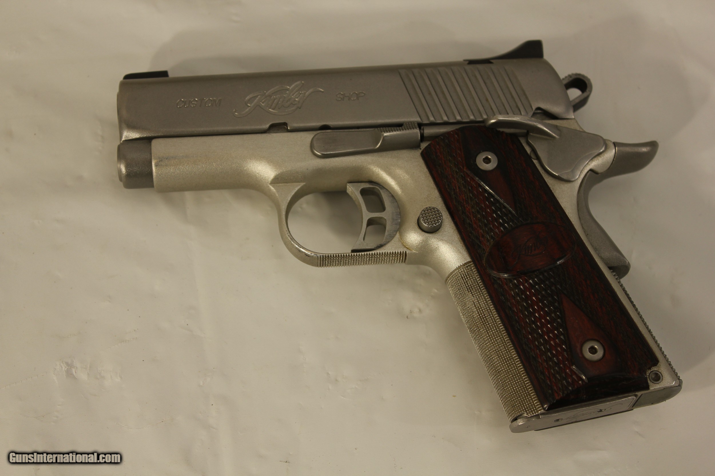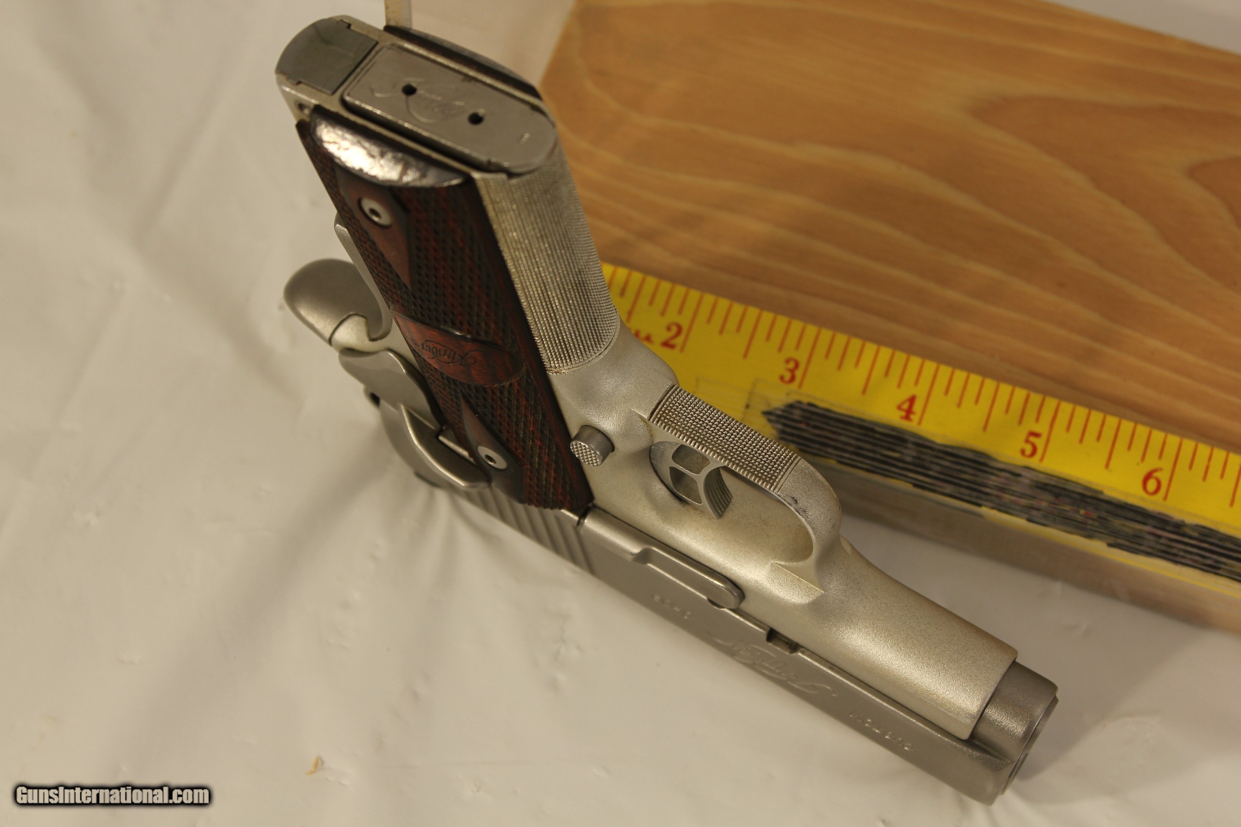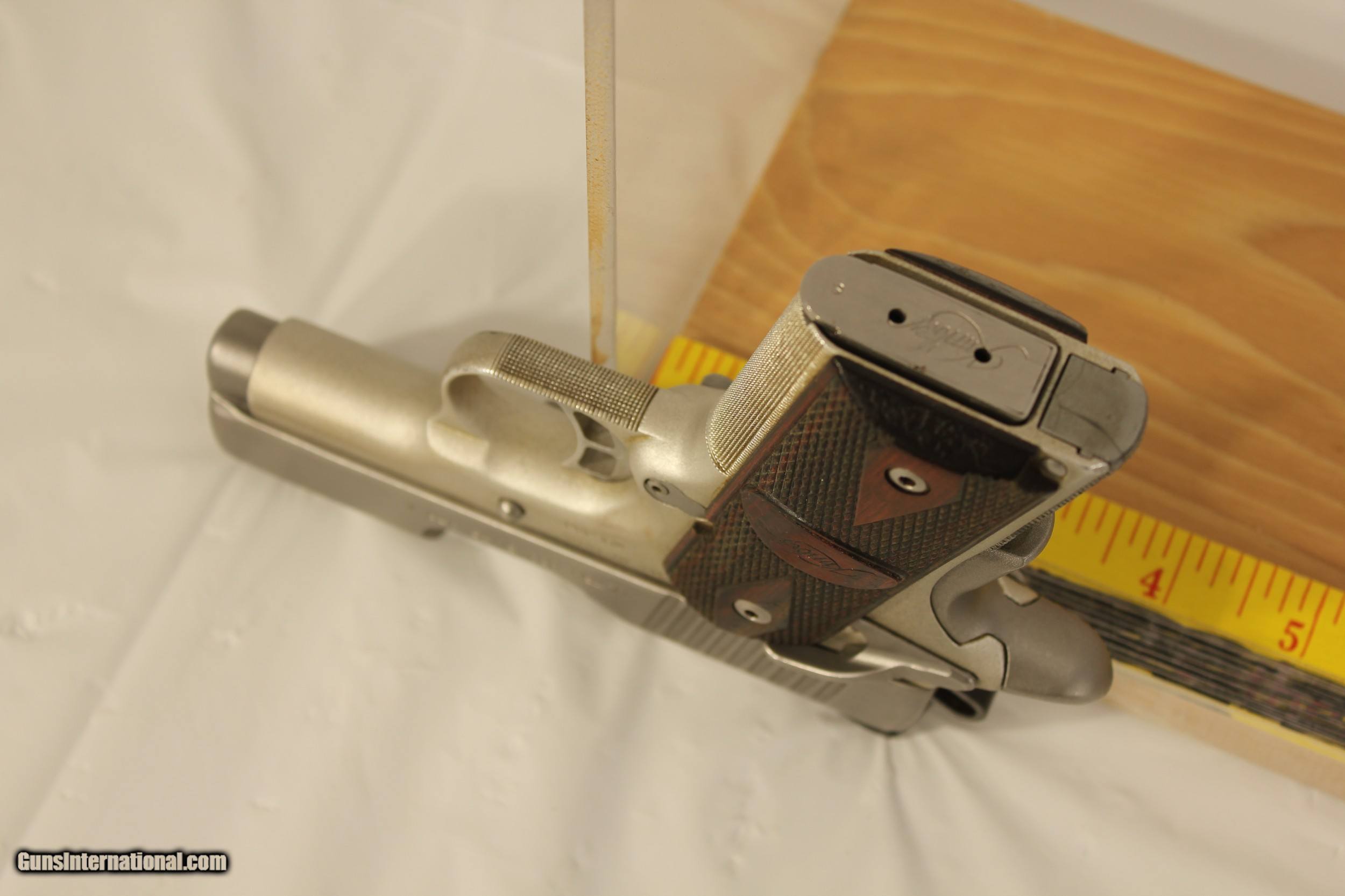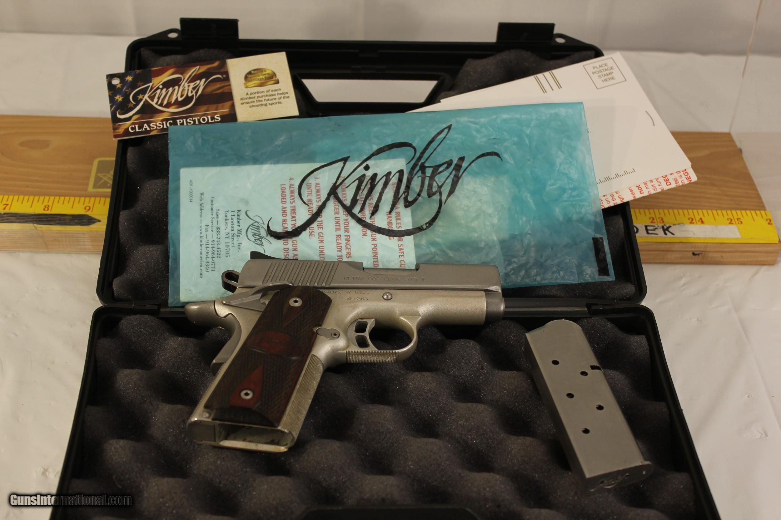 Description: This Kimber is a Custom Shop gun in stainless steel and alloy frame with one magazine and original box and papers. It has a very smooth trigger and is in good condition. It has a 3 inch barrel. These guns make excellent carry guns due to the light weight and there is nothing like a 45 to take care of business. $20.00 shipping via Priority Mail SOLD |