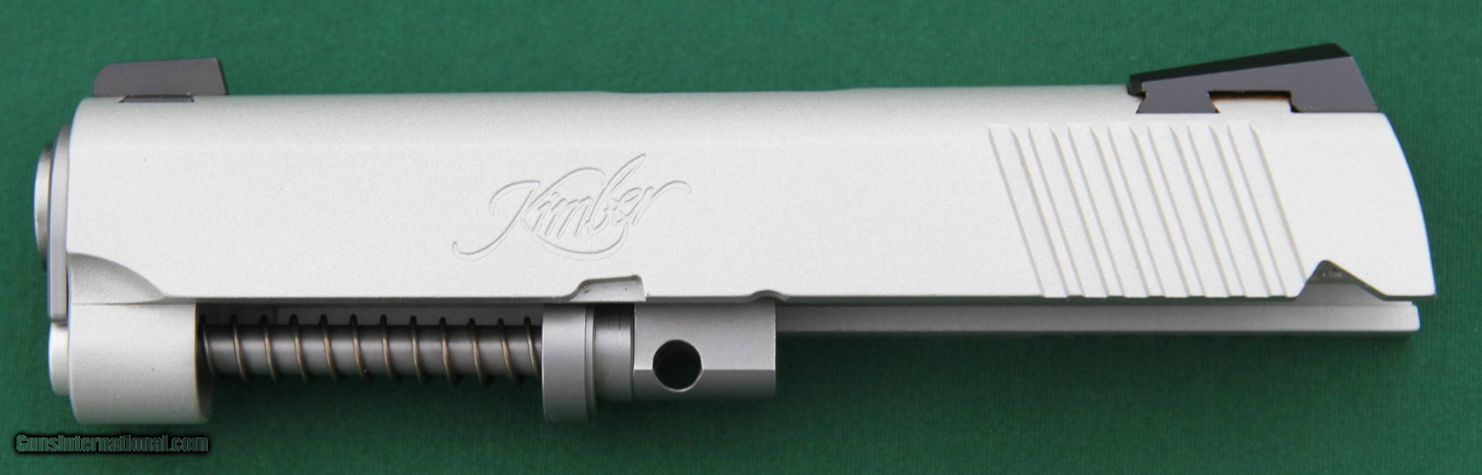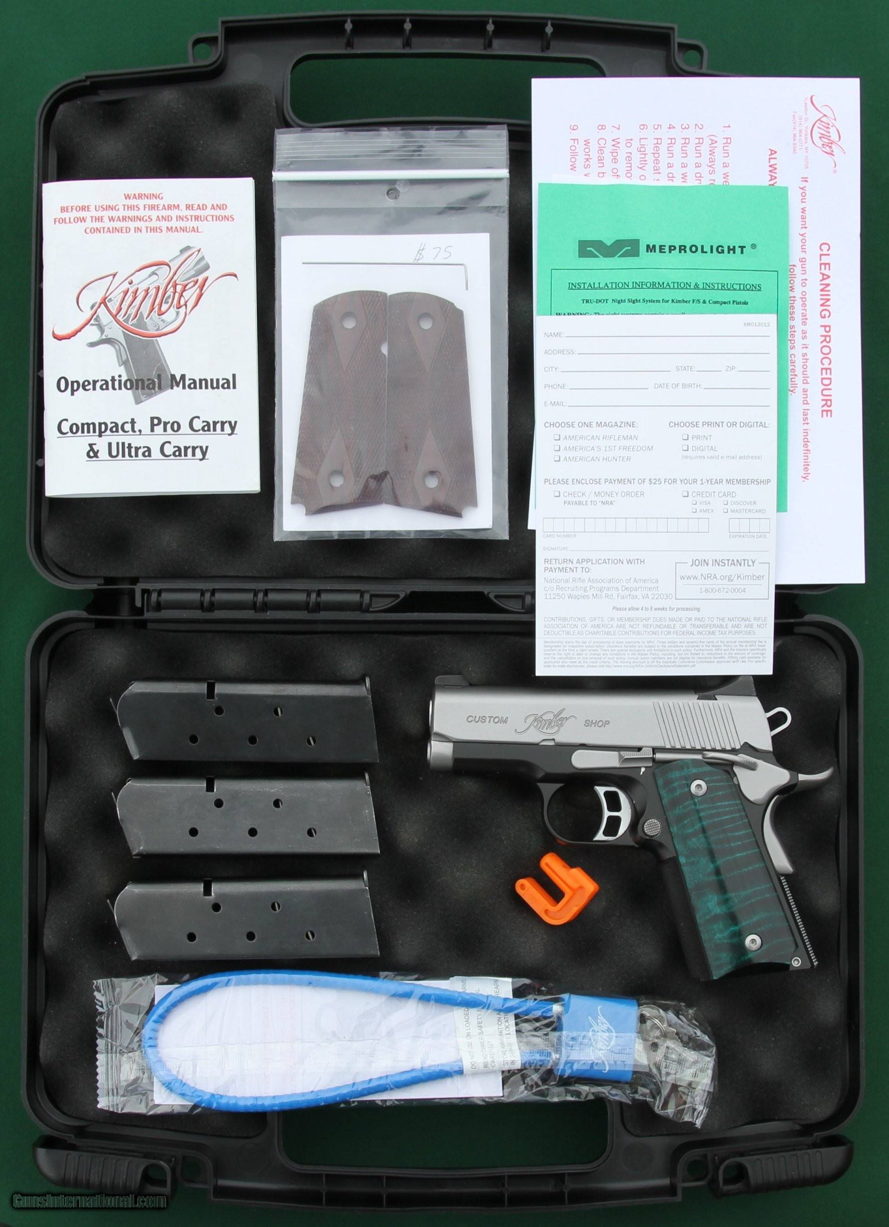 Description: Kimber Custom Ultra CDP II, 45 ACP semi-automatic pistol with: - Frame: aluminum, KimPro finishblack - 30 lines-per-inch front strap checkering - Slide: stainless steel; satin silver; KimPro II; flat top - Sights: low-profile, 3-dot tritium night sights (drift adjustable) - Grips: Galayda Made Tiger Maple (green on black) high-polished synthetic resin ambi-safety - Grips: Original Rosewood double diamond grips (unused, dismounted) round heel frame - Trigger: Solid aluminum; 4-5 lb. factory setting - Magazines: three 7-round - Capacity: 7+1 rounds - Barrel: 3-inch stainless steel with 16" twist rate; ramped - Overall length: 6.8 inches - Width: 1.5 inches (with current grips) - Height: 5 inches - Weight: 25.2 oz. (with empty magazine Per the Kimber , other features include: - Low-profile tritium night sights, flat top slide and aggressive slide serrations - Black II frame, KimPro II on slide, and small parts for added protection - Carry melt treatment rounds edges for smooth carry - 30 lines-per-inch front strap and under trigger guard checkering with high undercut trigger guard for positive grip - Flush-cut barrel The overall condition of the Kimber is 98+ percent. The stainless steel is 100 percent with no marks or other signs of wear. Black frame as three tiny nicks on the belly of the recoil rod tunnel. There is one other scratch slide lock contacts te frame. The Galayde Made grip show some handling wear, as well as a few small scratches on the bottom rear of the right grip panel. The pistol has had less than 1,000 rounds fired through it. Accessories includel original Kimber black plastic box, original rosewood double diamond grips (unused, dismounted), three 7-round magazines, one original takedown tool (in with the rosewood grips), original Operational Manual, original cleanng/lubrication card, orange plastid clear barrel indicator (CBI), NRA membership application card, Kimber authenticity-code card, Meprolight installation card, and the original cable lock (unopened). Kimber Compact Conversion Kit (.22 LR) - Complete slide with all internals, barrel, and recoil assembly - Rear sights: with set screw for windage adjustments - Front sight: dove tail for drift adjustments - Barrel Length (including chamber): 3.5 inches The overall condition of the Kimber Conversion Kit is 99+ percent. I very seldom rate any gun 100 percent that is not new-in-the-box. In fact, this slide/barrel kit has had about thirty or forty rounds fired through it. The The slide and barrel are are 100 percent with no marks or other signs of wear. Accessories includel original Kimber Conversion Kit black plastic box, two 10-round magazines (one with an extended floor plate and one with flush floor plate), an extra flush floor plate. original Owners Manual, registration car, and the original cleanng/lubrication card, The photos are high resolution, so zoom to see details. Contact me for additional photos of any areas you would like to see or see better. The buyer pays $35 for USPS Priority Mail and $23.65 insurance. The fastest way to get this gun is to pay with USPS (U.S. Postal Service) money orders, as they are like cash. I will ship the pistol immediately upon receipt of USPS money orders and an FFL. As USPS money orders are limited to $1,000, this purchase will require two USPS money orders. I will also accept a personal check and other types of money orders, as well as bank checks and cashier's checks, but I will hold the gun until it clears my bank; this includes bank checks and cashier’s checks. We do not accept credit cards, debit cards, or PayPal. Check or money order must be made out to Jerry Pownall or Barboursville Arms. If you wish to contact me, please "Email Seller". I will answer your questions, explain the purchase / transfer process, and provide my mailing address. I am available any time, except Friday evenings and Saturdays. I will return emails Saturday evening. SOLD |