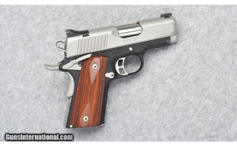 Description: Kimber Ultra CDP in 45ACP. Lightweight alloy frame with stainless slide. Carry-Melt treatment for ease of concealment. Solid.. SOLD Caliber Info: 45 ACP Metal Condition: Carry wear on the sharp edges, few scratches Wood Condition: Excellent Bore Condition: Bright and Sharp Barrels: 3 Inch Stainless Stock: Checkered Rosewood Weight: 26 Ozs Sights: Dovetailed 3-Dot Tritium Night Sights Item Location: Buda, TX |