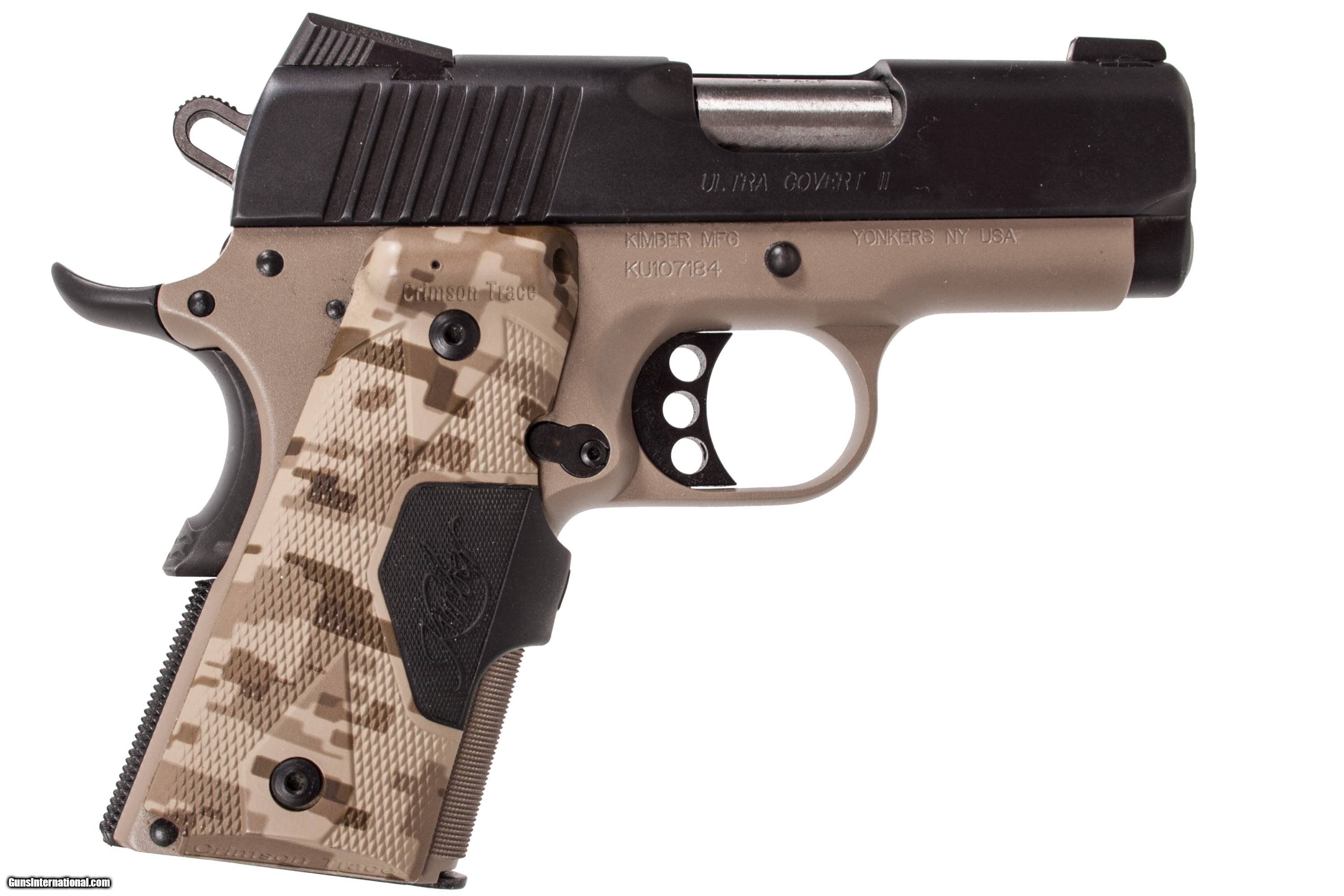 Kimber Ultra Covert II chambered in 45 acp with a 3 inch barrel case 2 extra magazines and a Crimson Trace Desert Digital laser grips. This gun is in excellent condition and is covered by Dury's Lifetime Warranty.