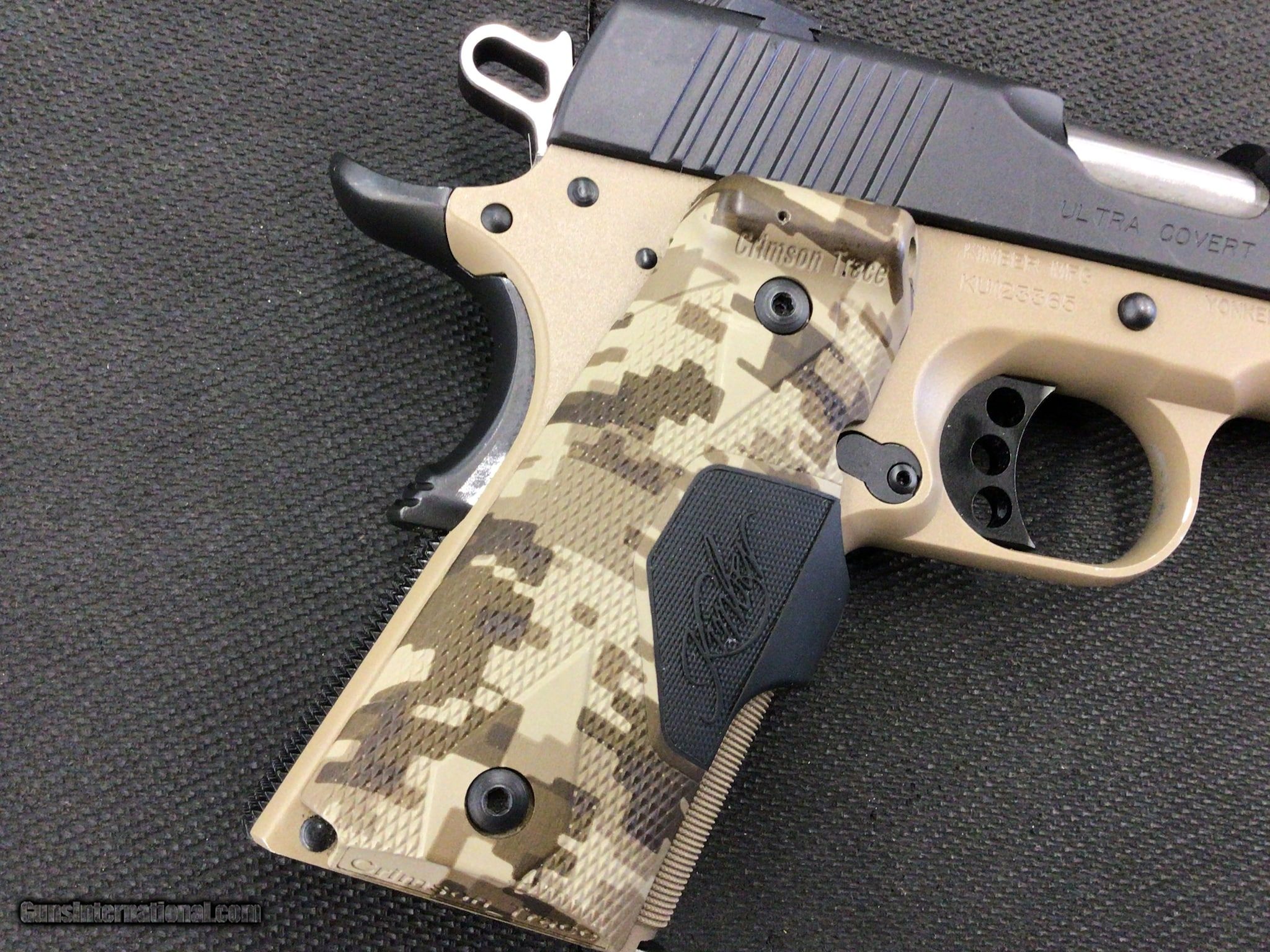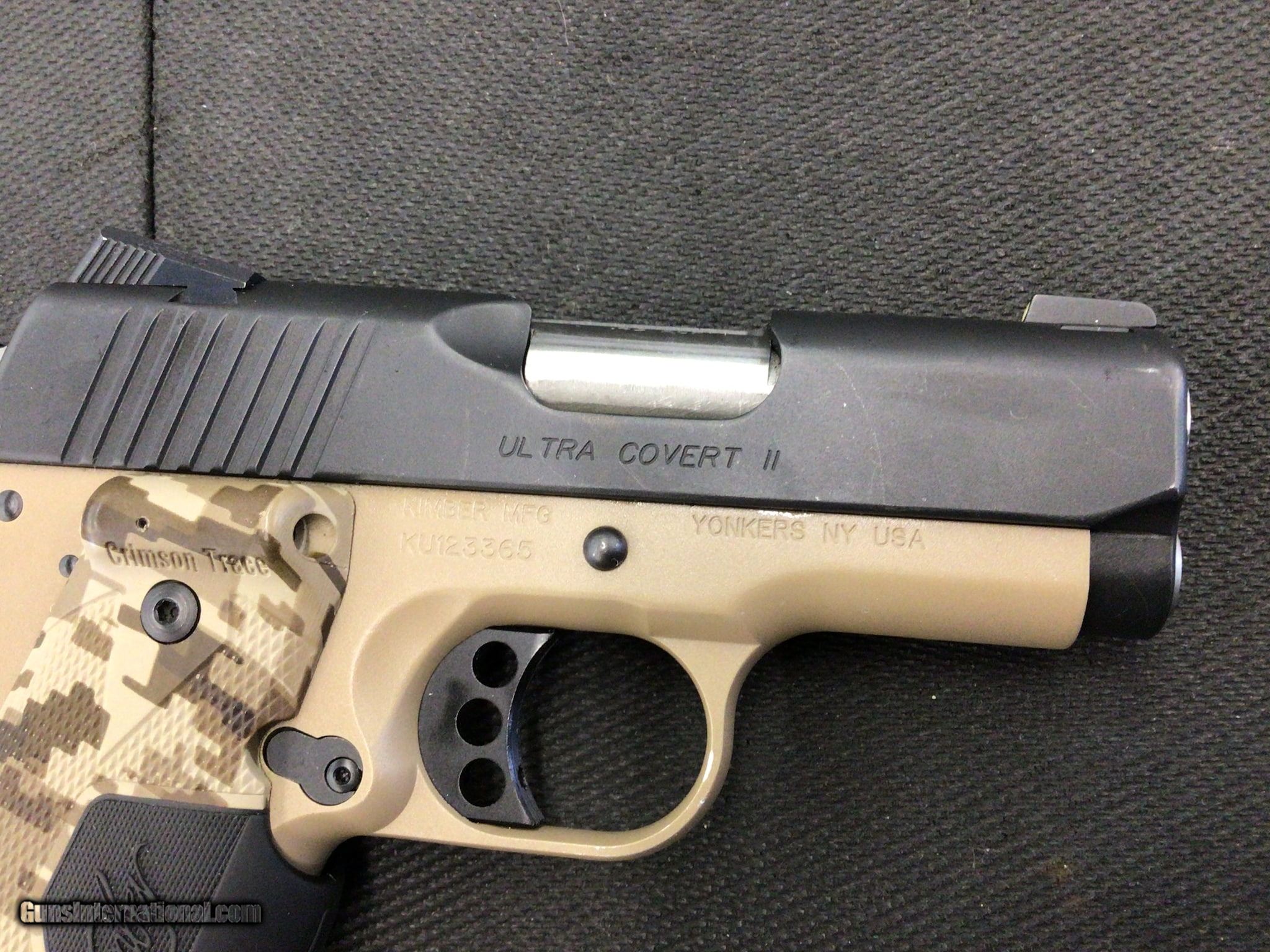 Description: Guns Listing ID: 478778 Kimber Ultra Covert II in 45acp, 3” barrel, black slide with tan frame and camo Crimson Trace grips. Night sights, original box in great condition. Some very light marks in the slide, clean bore with excellent rifling. SOLD Manufacturer: KIMBER Model: ULTRA COVERT II *CA Caliber Info: 45 ACP Condition: Used - Non-Certified Barrels: 3 BARREL Finish: BLACK |