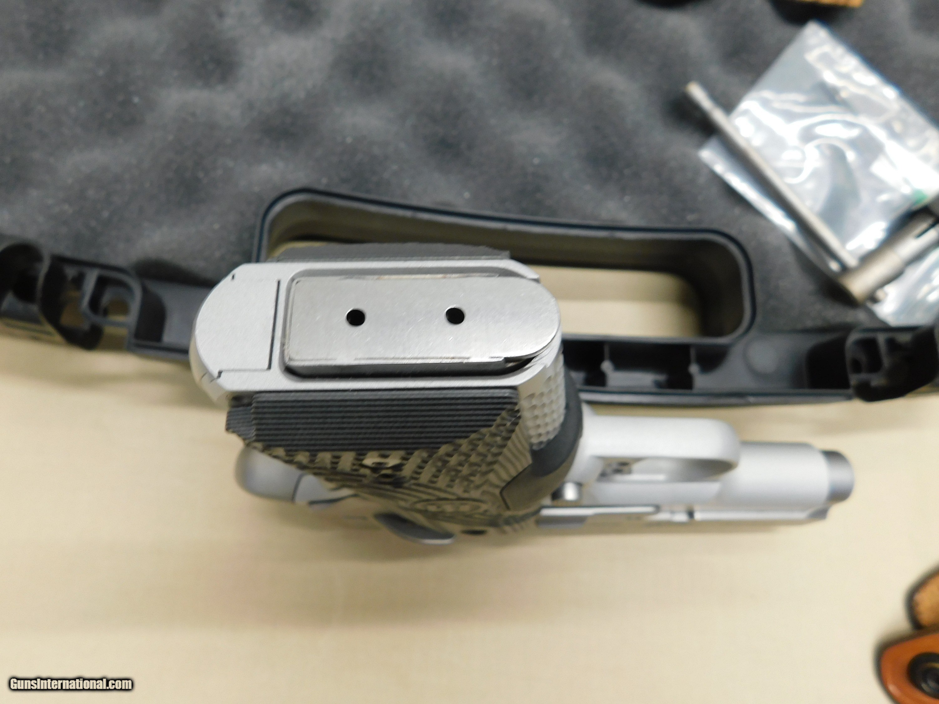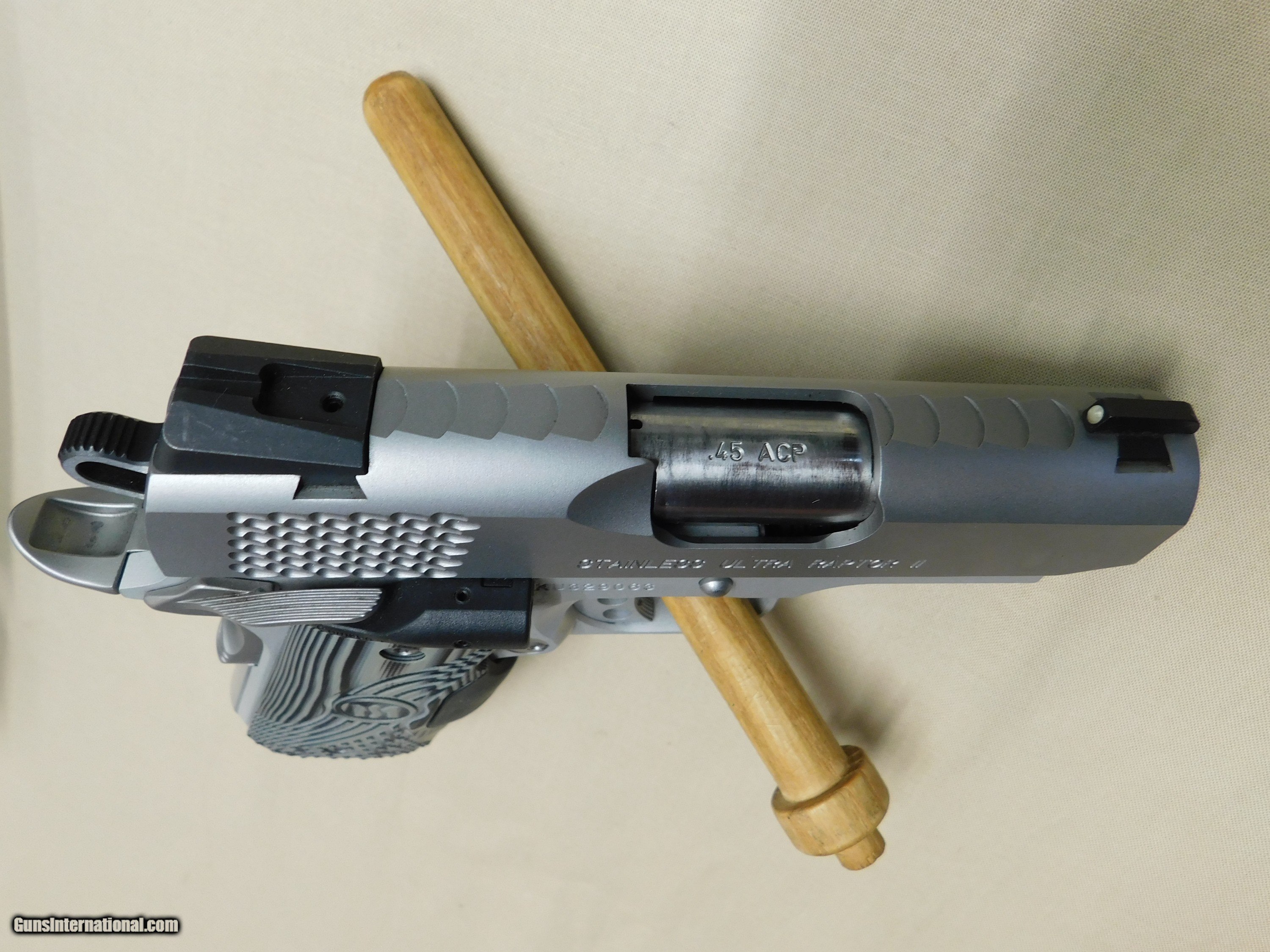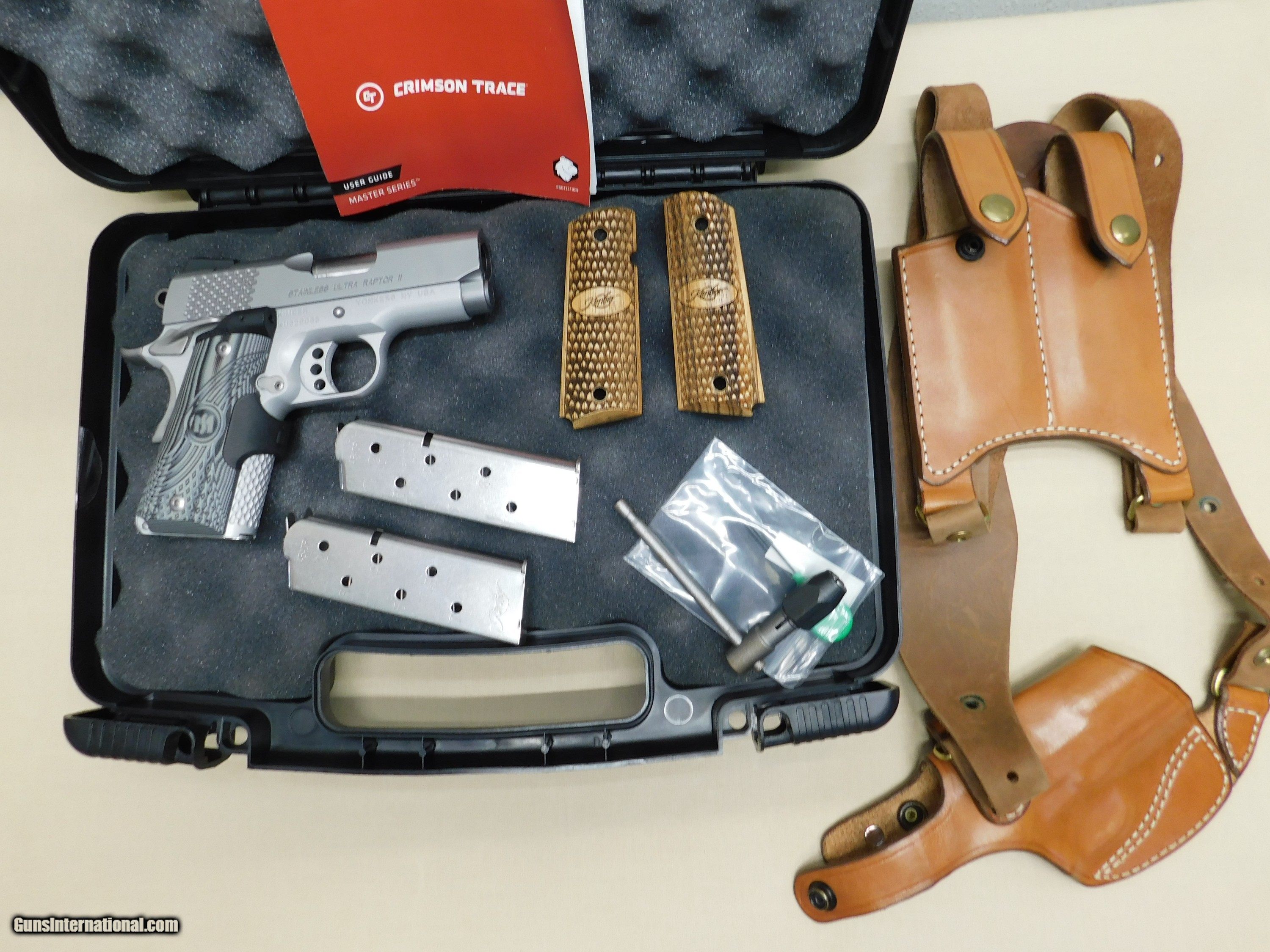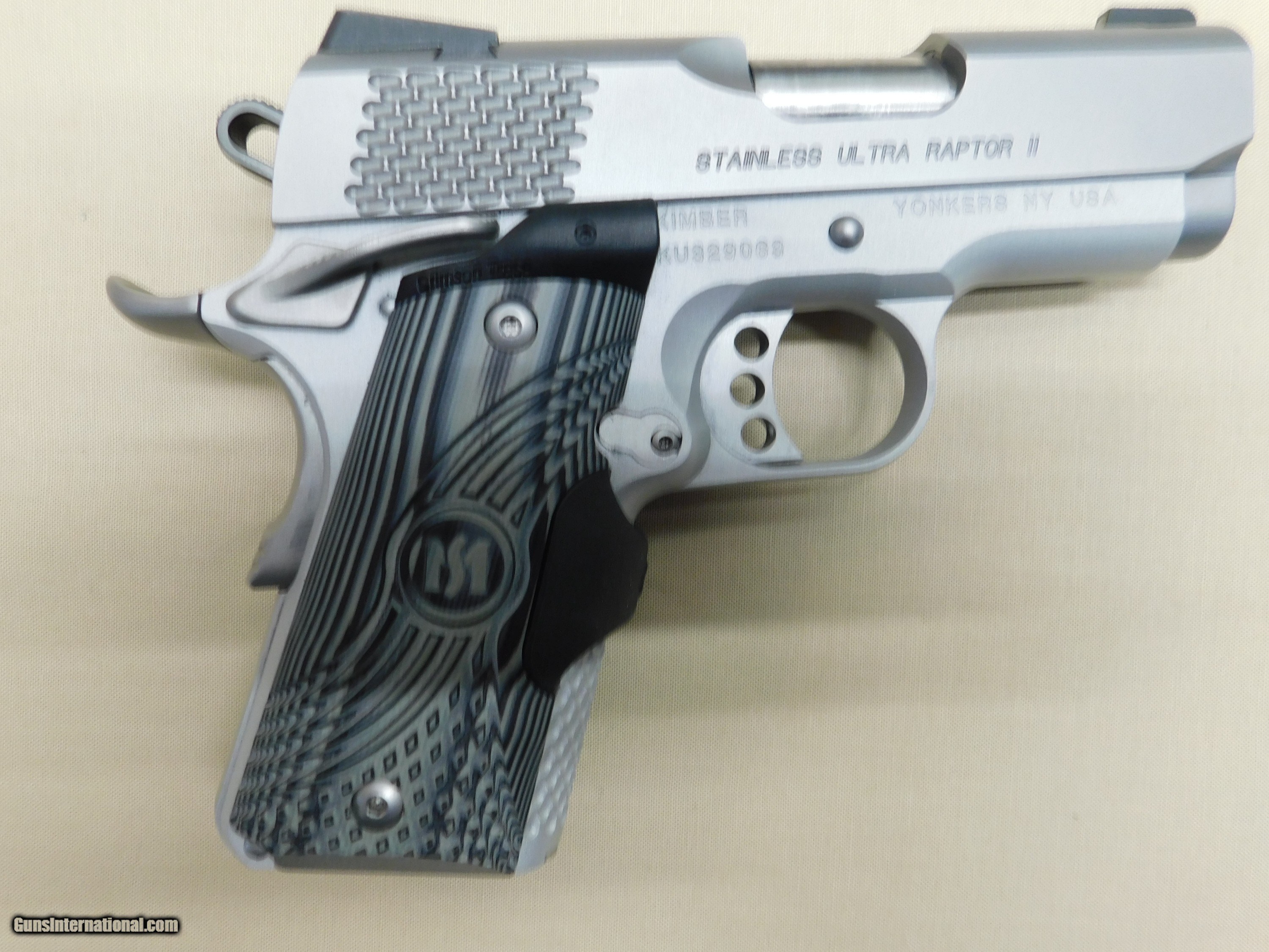 Description: This is a used Kimber Ultra Raptor II, 45ACP semi auto pistol It is a 7+1 shot with a 3" stainless barrel It is a custom Pro Shop pistol Has 3 mags, extra wood grips, shoudler holster Crimson Trace laser green Very good condition SN-KU329063 SOLD Handgun Caliber: .45 ACP (.45 Auto) Manufacturer: Kimber Model: Ultra Raptor II Serial Number: KU329063 Barrel Length: 3 Condition: Used/Very Good Metal Condition: Very Good Bore Condition: Very good Barrels: Stainless Action: Semi auto Finish: Stainless Steel Extras: 3 mags, extra wood grips, shoudler holster |