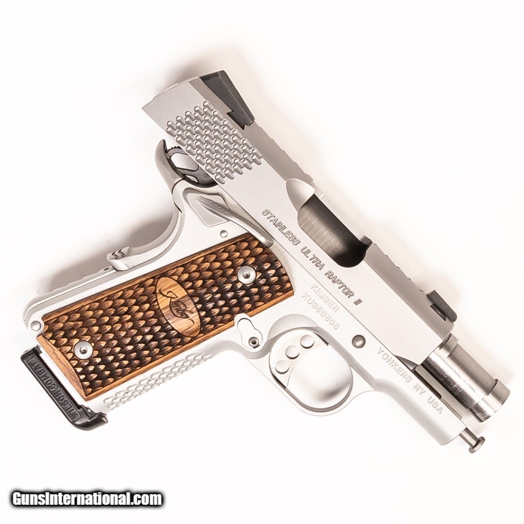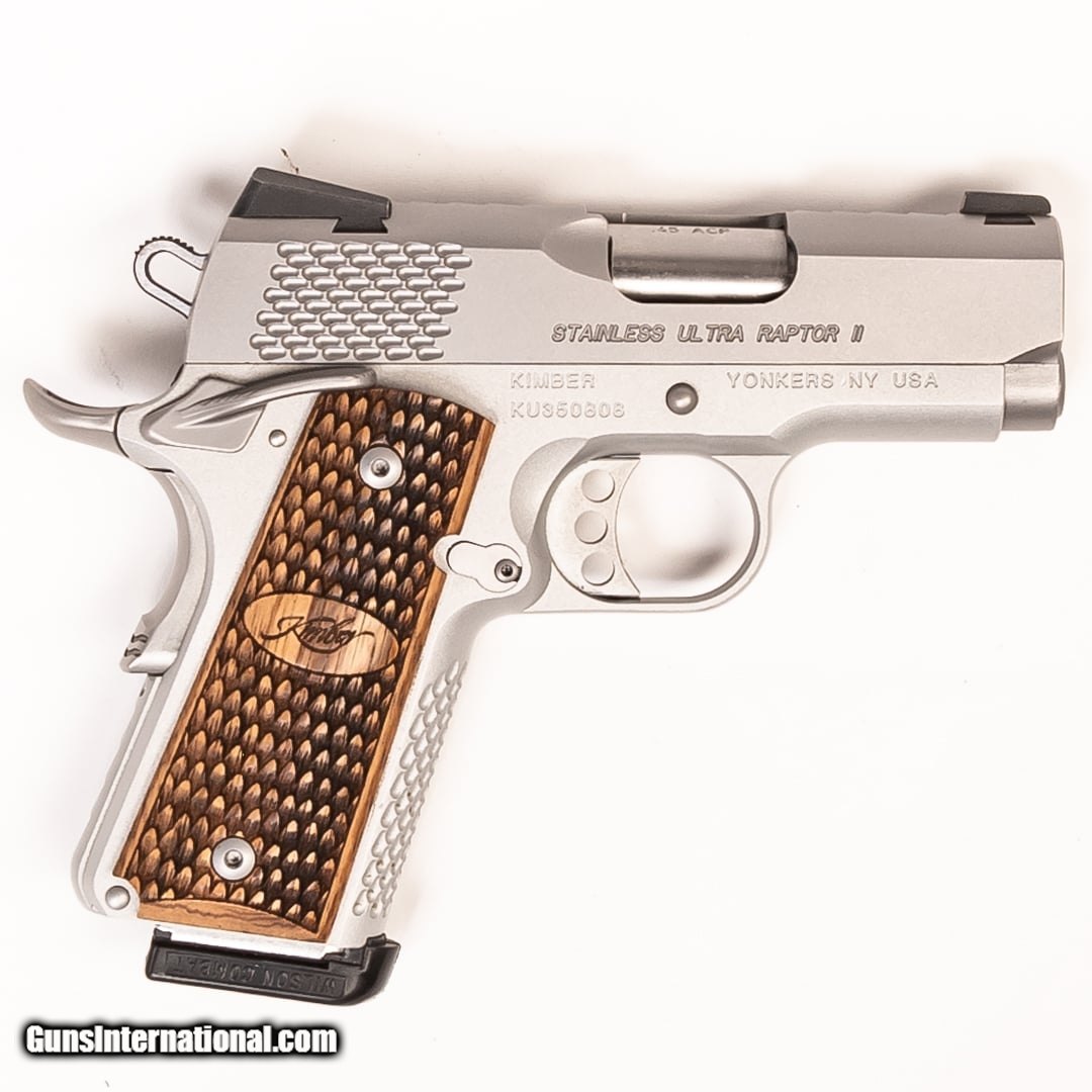 Description: Guns Listing ID: 475605 The Kimber Raptor series earned its name with its aggressive slide and frame serrations and special scaled texturing accents. This model is a Ultra Raptor II and is based off John Browning‚‚s original 1911 design. Premium quality, accurate, and dependable, this handgun is a fine example of Kimber‚‚s drive for excellence. This handgun features wood grips, night sights, and wood grip SOLD Manufacturer: KIMBER Model: ULTRA RAPTOR II Caliber Info: .45 ACP Condition: Used - Certified Barrels: 3 BARREL Finish: STAINLESS |