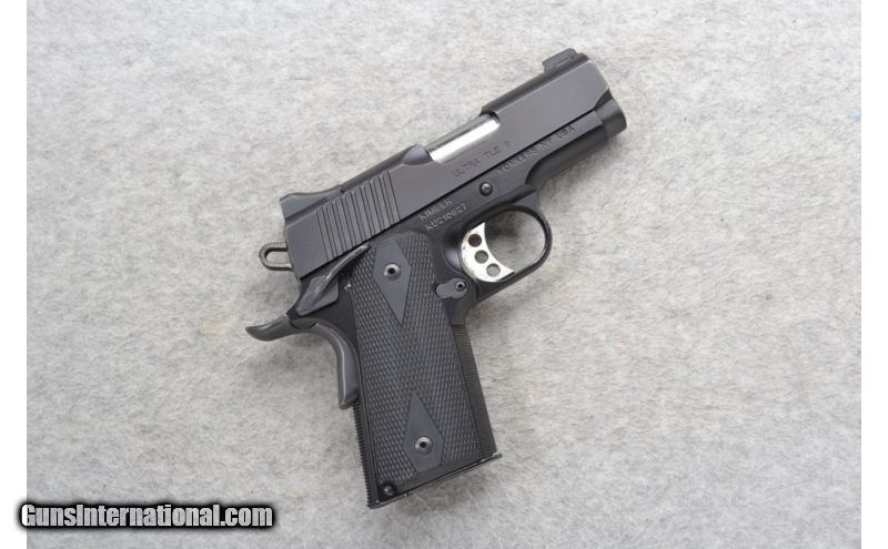 Description: This Kimber Model Ultra TLE II is a semi-auto pistol that comes in .45 ACP Cal. It has a grooved adjustable skelton trigger. In overall excellent condition it comes with one 7 round magazine and its original case. SOLD Caliber Info: .45 A.C.P. Chambers: 7 round magazine. Metal Condition: Excellent. A few minor use marks. Bore Condition: Excellent. Barrels: 3 inches. Black slide. Triggers: Adjustable. Grooved. Skelton trigger. Stock: Diamond checkered black rubber grip panels. Weight: 27 oz. Sights: Blade front. Notch rear. 3 dot night sight. Item Location: Richfield, WI |