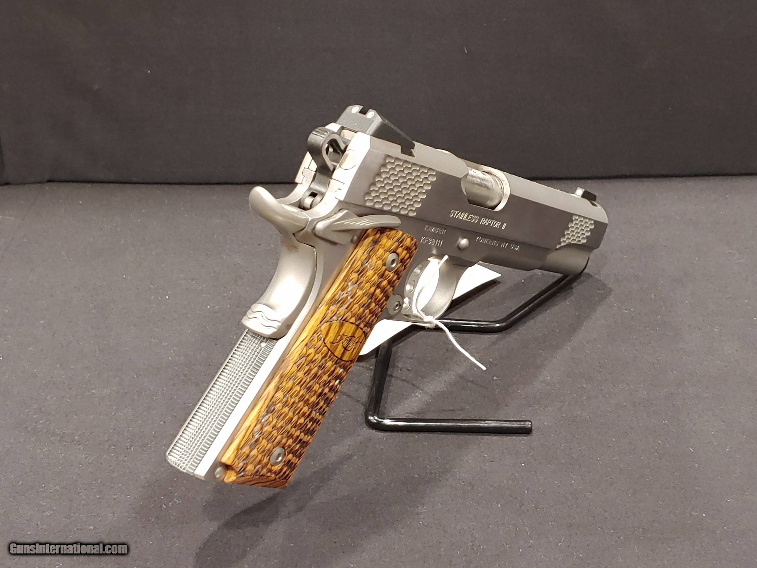 Description: Kimber Raptor II get their name from dynamic slide and frame serrations, feathered logo grips, and finish accents. While the design theme is unique, performance is exactly what shooters expect from Kimber -- unequaled. Raptor II pistols come in a variety of sizes and finishes, each loaded with Custom Shop features that ensure dependability and accuracy. Ultra models have 3-inch barrels and aluminum frames, making them easy to carry and conceal. The quality of Kimber Raptor II pistols is on par with that of America's top pistol smiths. This package comes with a magazine and a hard plastic case. The condition of this firearm is great! Pre-Owned - Kimber Stainless Raptor II 9mm Handgun