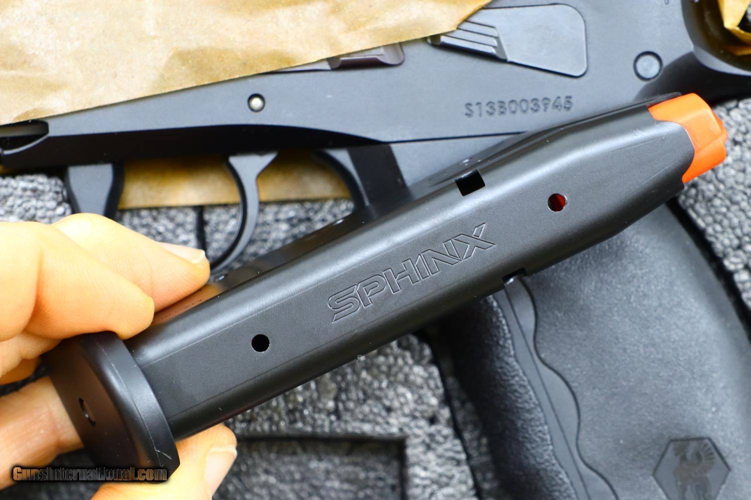 Standard configuration SA/DA high capacity, compact, locked breech decocking pistol, cal 9mmP, with a white highlighted front sight and Novac-style rear sight. Left side of frame with manufacturer marking, country of origin and serial number. KRISS logo and address on right side of frame. Fitted with textured polymer interchangeable grips. Primary and spare magazines with 15-shot capacity, marked SPHINX, and SDP-Compact 9mm. Complete with two spare grip inserts, magazine loader and cleaning implements, all in a matching black plastic SPHINX labeled case.