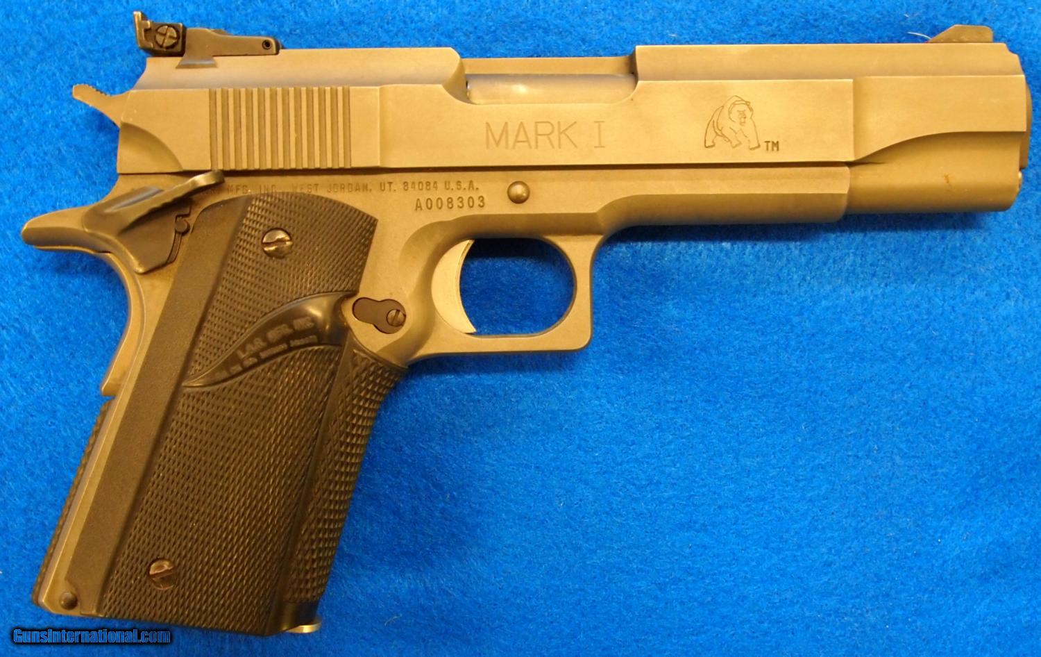 Description: LAR GRIZZLY 45 WIN MAG, 5" BARREL, 2 MAGAZINES, OWNERS , MANUAL, AND PLASTIC CASE. ADJUSTABLE REAR SIGHT. S&H $25.00 ADD 3% FOR CREDIT CARDS. SOLD |