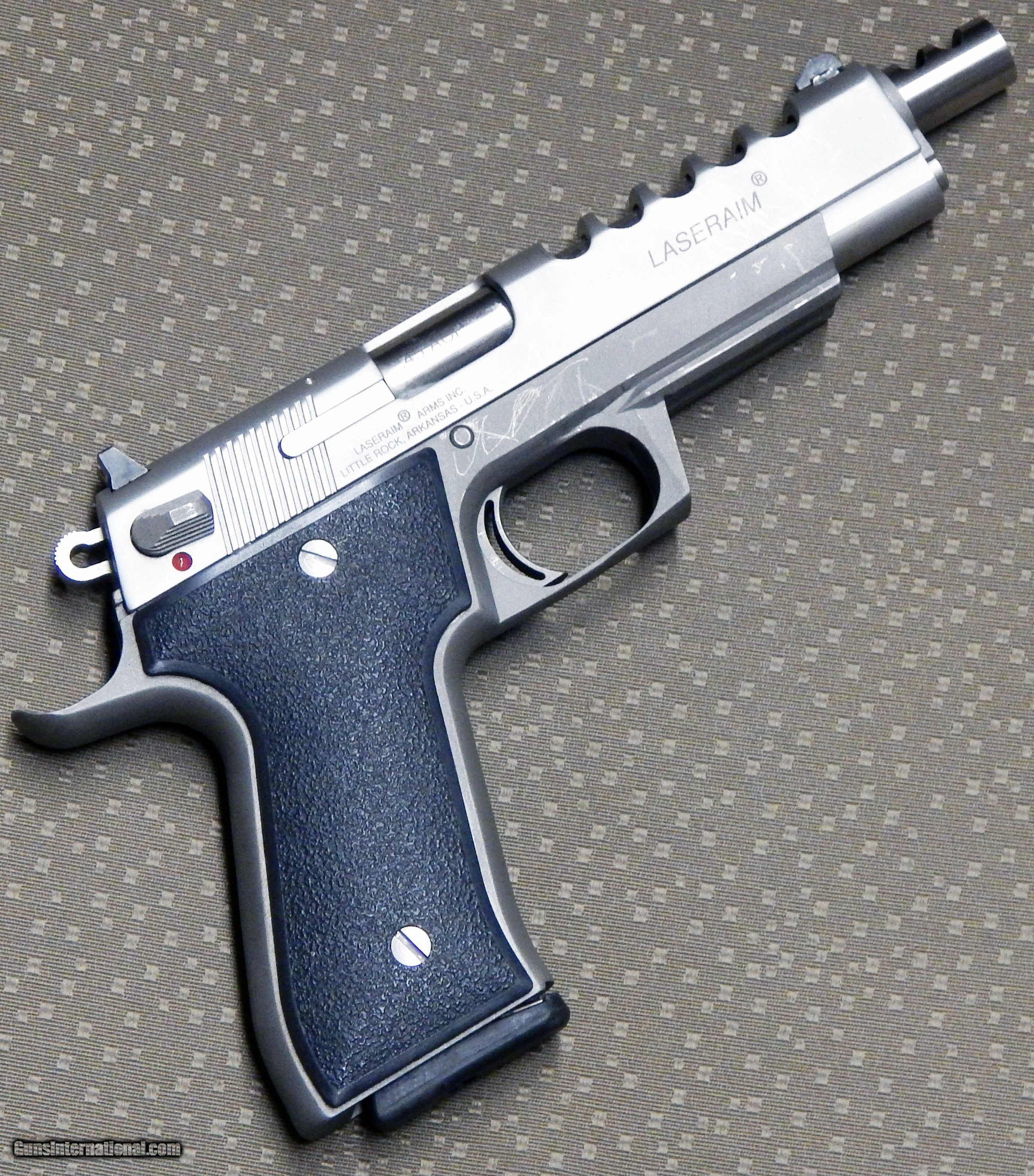 Description: LaserAim Arms ~ Deluxe ~ Chambered in .45 Auto. Is a semiautomatic single action hammer fire competition pistol. Features a 5.75" integrally ported stainless steel barrel, which is paired with iron sights. Firearm has a satin stainless steel slide bearing dorsal porting and an ambidextrous thumb safety, which is mated to a gray steel frame complimented with black polymer grips. Comes with a single 7 + 1 capacity magazine. .45 Auto Chambers: .45 Auto. Metal Condition: Very good condition. Bore Condition: Good condition. Barrels: 5.75" inches. Weight: 2.75 pounds Sights: Iron sights. Item Location: Acworth, GA Price: $449.99 Contact Seller |