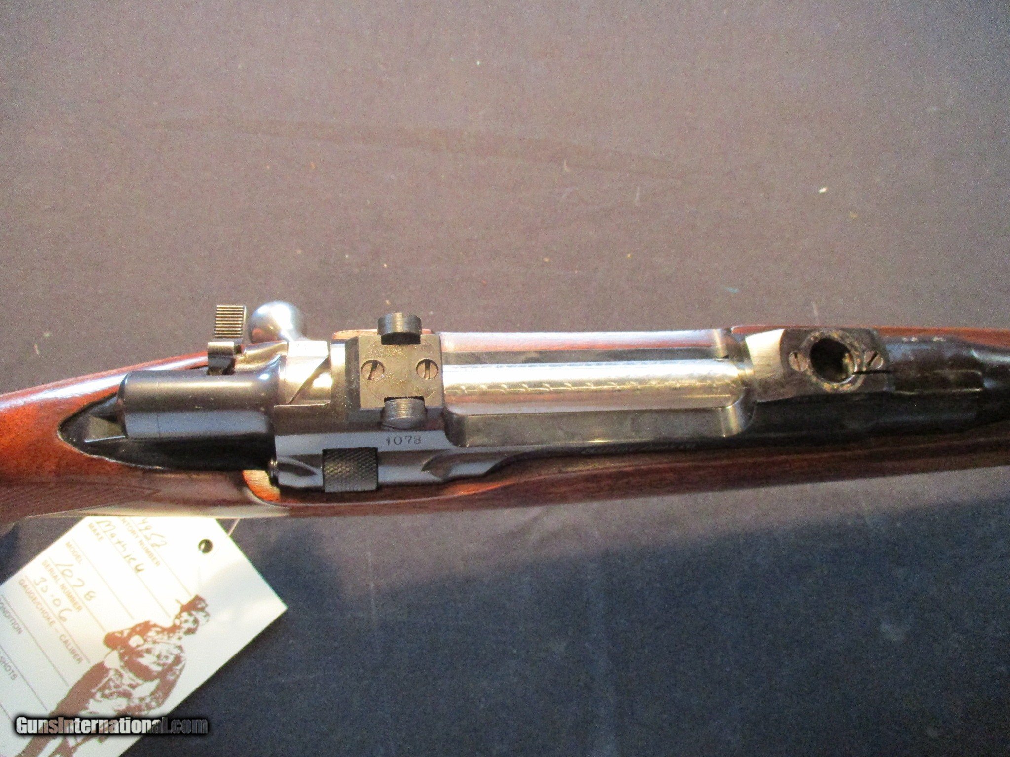 Description: Mathieu Bolt action rifle, Left hand, 30-06 with a 22" barrel. Nice clean all original gun! comes with the bases as shown. Hard to find gun! Email me if you would like these pics sent to you, they will come through bigger and better than on the listing page here. Email me with any questions. I am a store front dealer, and I will close s if the gun sells locally. Once it has aI will pull it from my shelves. Please check your local laws to confirm it is legal to own in your state! Buyer pays $25 shipping and insurance to your FFL in the lower 48. AK, HI or PR is extra. I will ship to California, NO PROBLEM! All my guns come with a non firing, 3 day unconditional return privilege, from the day UPS delivers to your dealer. Buyer pays shipping both ways if the gun comes back. I can add a new hard case by PLANO for secure shipping for $25 if the buyer wishes (highly recommended, cheap insurance, really helps keep the UPS monster from eating my guns!). No sales tax on guns ship out of Kansas, guns sold in Kansas are subject to Kansas sales tax. I am a licensed FFL, and will include a copy of my FFL with the gun for your dealers records. I will ship to a C&R if the gun is eligible. I will ship to California, but you need to confirm the gun is legal where you are, California or other. I am always looking for good clean, old original Winchesters to buy, consign, or trade, especially pre '64's model 70's and model 54's. WE ALSO TRADE FOR CLASSIC CARS AND TRUCKS! Email me with any questions, and good luck! SOLD |