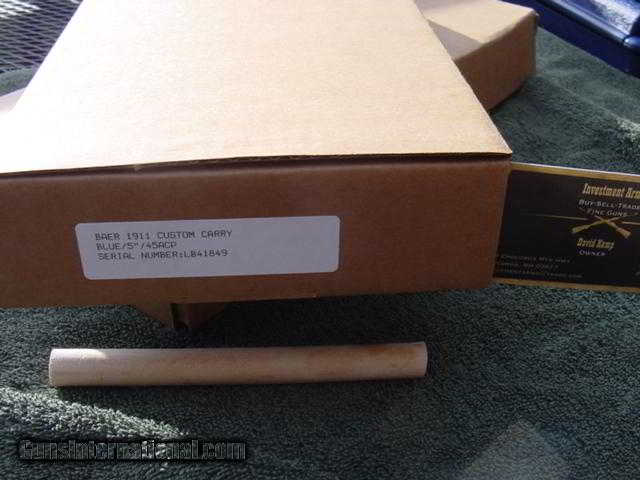 Description: SOLD OUT Factory Fresh Les Baer 1911 Custom Carry 5" with Night Sights Amazing Custom 1911 Pistol factory fresh-removed from box for pics then back in safe,Brand NEW and ready to ship.Also in 9m ( at higher price(+50)-please check LB -thanks) California Approved-and yes I do ship to California-If on your list and approvced only please. ! From the Les Baer description, "You'll look a long time to find a real custom pistol at a price this low. Baer's Custom Carry is perfectly suited to home defense, duty use or weekend plinking. Like all Baer pistols, it's guaranteed to shoot 3 inch groups at 50 yards. Features include: Baer NM frame, NM slide and NM barrel with stainless bushing (see below for frame and slide options) • Baer deluxe fixed combat sight • Baer dovetail front sight, improved ramp style night sights • Double serrated slide (on full size model only) • Baer speed trigger with crisp 4 lb pull • Baer deluxe hammer and sear • Baer tactical style extended ambi safety • Beveled mag well • Polished feed ramp and throated barrel • Tuned extractor • Baer extended ejector • Baer checkered slide stop • Lowered and flared ejection port • High checkered front strap 30 lpi • Tuned for total reliability • All corners rounded for tactical carry • Baer Premium Checkered Cocobolo grips • (2) 8-round premium magazine • Flat serrated mainspring housing" Offered at $2100 plus shipping and insurance($45 USPS Priority).List price is $2350 and you would have to wait for one. Happy to send along more pics,answer questions over phone or email.Please email your phone number so I can call back if I miss the call,thanks Be sure to look at my other offerings for more Colt Saa's,Colts, Rugers, Brownings,Uberti'sby both Taylor and Cimarron,Rizinni and Ferlib,Merkel shotguns and other fine guns.Inventory always changing be sure to check with us for any needs. Local New Hampshire Buyer can view/purchase gun in person-after 4473/ NICS check, at Investment Arms business premise in New Hampshire Country Store, Rt 16 Chocorua NH.Please email/call (603.323.8200 ) first to be sure its not sold. We also Buy and Consign Guns Payment by bank check,UPS money order-personal check held until clear 10 days.Buyer must provide dealers signed 01 FFL-email or hard copy,I will include a copy of my FFL with shipment. 3 Day non firing/non turn inspection period (gun must be in same condition if returned) on used guns only-not new guns sorry,buyer pays shipping and insurance both ways if returned. SAFETY NOTICE: Buyer is solely responsible for determining that a used gun is safe to shoot.The firearms offered has been given a visual inspection for collection purpose only. It is a requirement that any used firearm be inspected by a qualified gunsmith before firing. By purchasing the firearm, the buyer agrees to hold seller harmless against damages, injury, or death caused by defective merchandise SOLD |