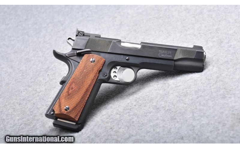 Description: This is a Les Baer, Baer Custom, .45 ACP caliber 1911 style pistol, with a 5" stainless steel Bear Match barrel. It is blued steel, with checkered brown wood grips.The front sight is a blade, the rear sight is adjustable for windage and elevation. It has a beaver tail grip safety extension.The pistol finish is excellent, with only minor handling marks. The wood grips are excellent, with minor handling marks. The bore is bright, with strong rifling and no pits. A spare magazine is included, with the pistol. SOLD Caliber Info: .45 ACP Metal Condition: Excellent with minor handling marks Wood Condition: Excellent with minor handling marks Bore Condition: Bright smooth bore, no pits Barrels: 5 inch Weight: 40 Ounces Sights: Blade front and adjustable rear sight. Extras: Spare magazine Item Location: Reno, NV |