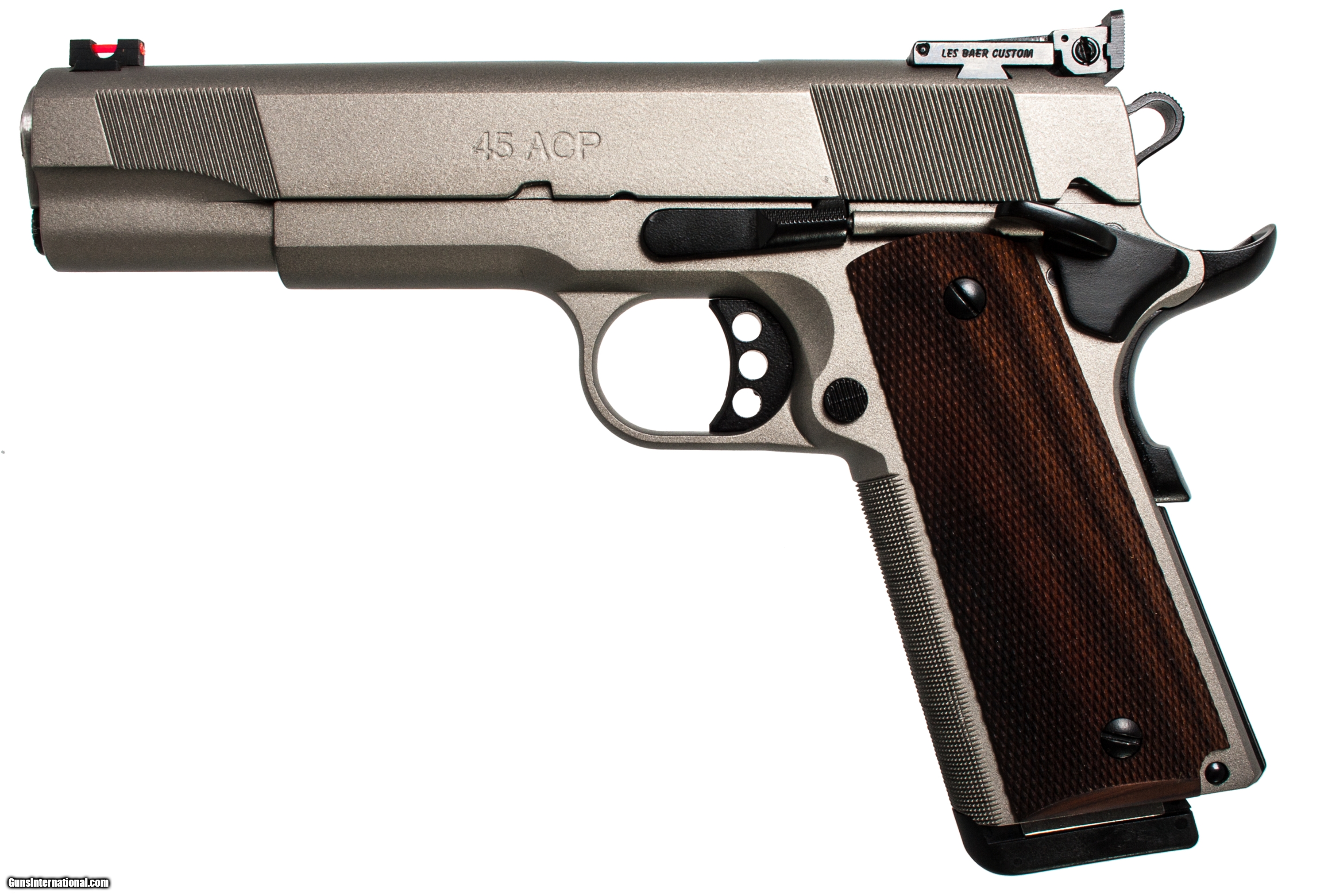 Les Baer Custom 1911 chambered in 45 acp with a 5 inch barrel red fiber optic front sight post adjustable rear sight wood grips and a box. This gun is in excellent condition and is covered by Dury's Lifetime Warranty.