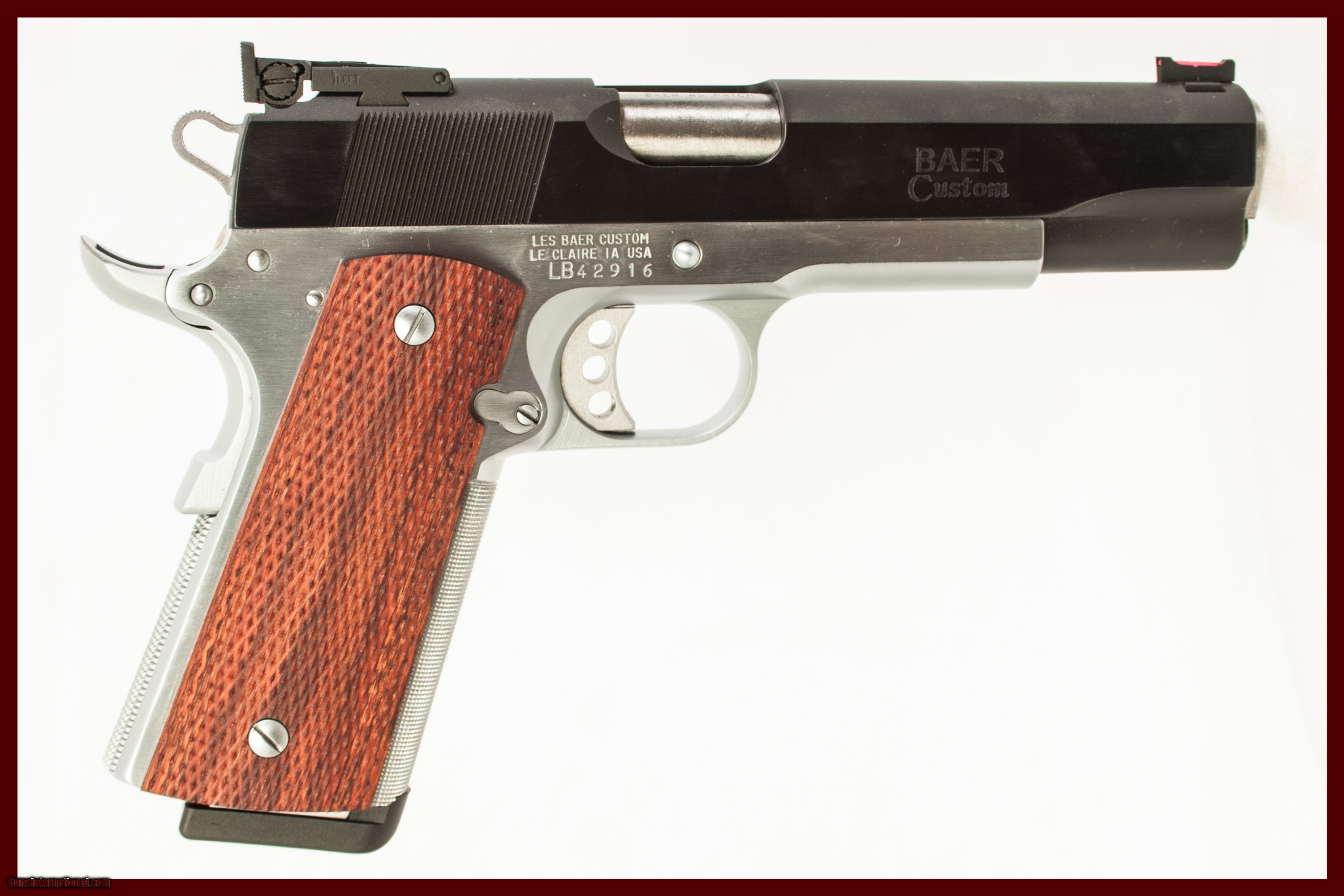 LES BAER CUSTOM 1911 CHAMBERED IN 45ACP WITH A 5 INCH BARREL COMES WITH BOX AND 2 EXTRA MAGS. THIS GUN IS IN EXCELLENT CONDITION AND IS COVERED BY DURY'S LIFETIME WARRANTY.