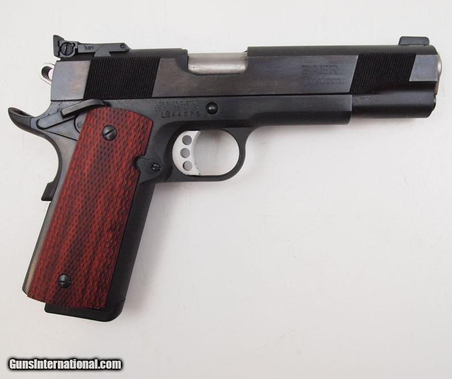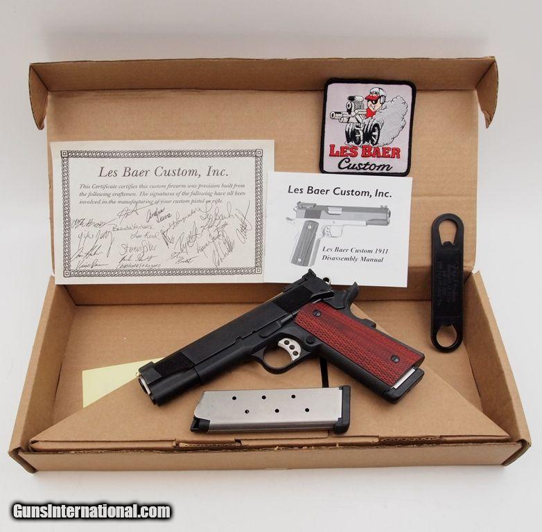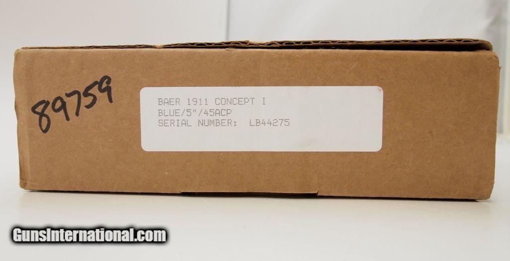 Description: Les Baur Concept 1 .45 ACP ANIB, 5" bbl, bright shiny bore, strong rifling, blued finish, Les Baer Custom adjustable rear sight, Baer Dovetail front sight, skeletonized trigger - hammer, serrated mainspring housing, slide has fine serrations forward - back, extended ambi safety, beveled magazine well and premium checkered grips. This pistol will be a great addition to your collection. Add 3% for Credit Card Shipping $25.00 SOLD |