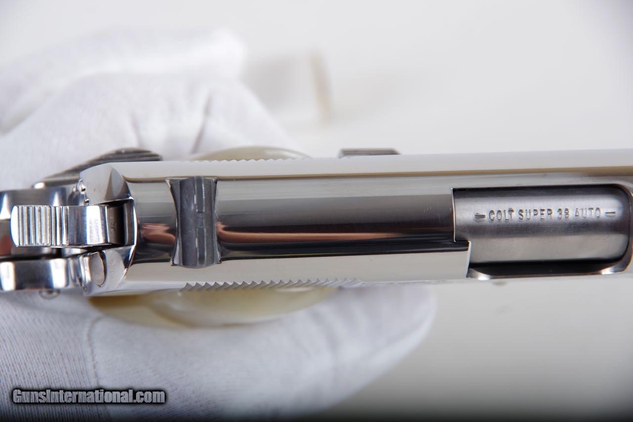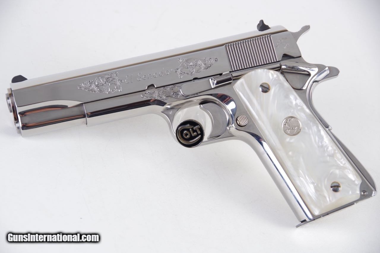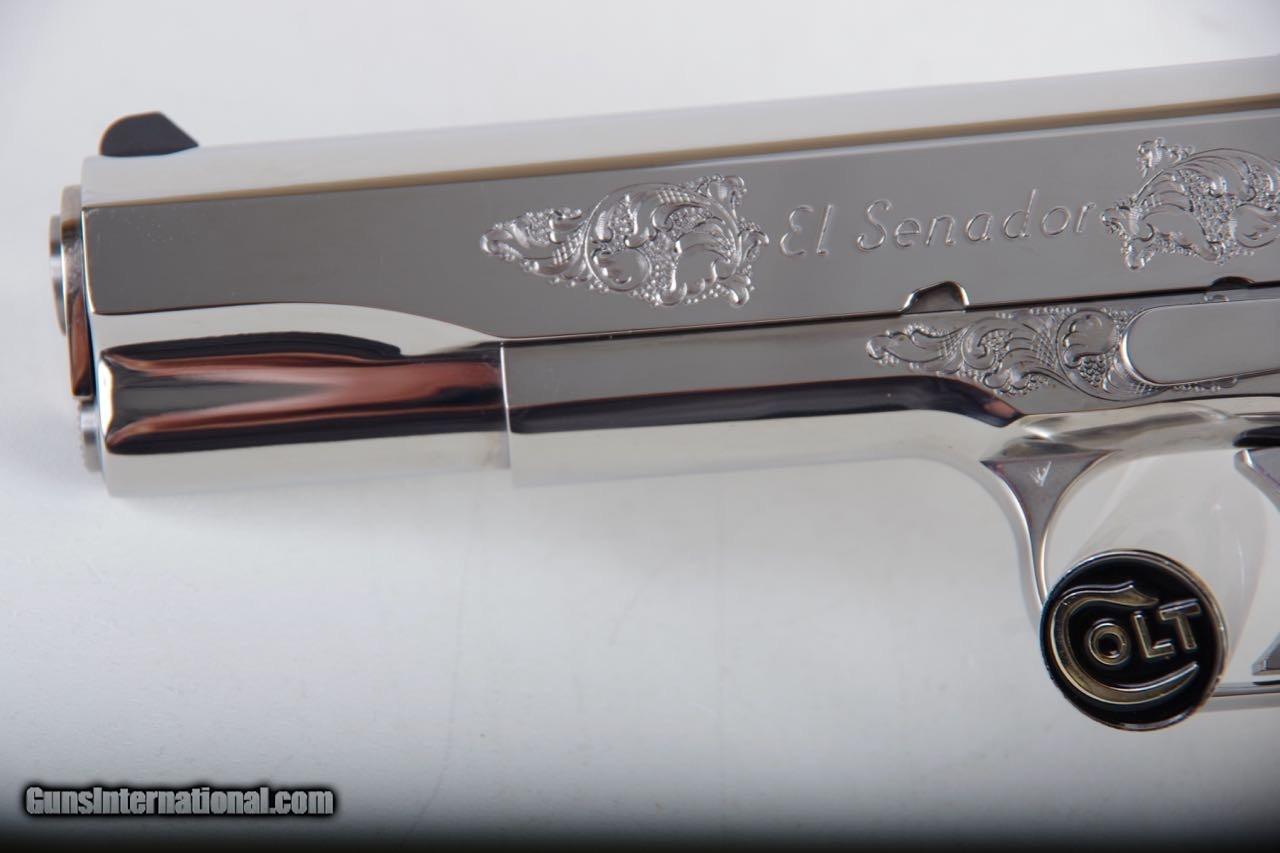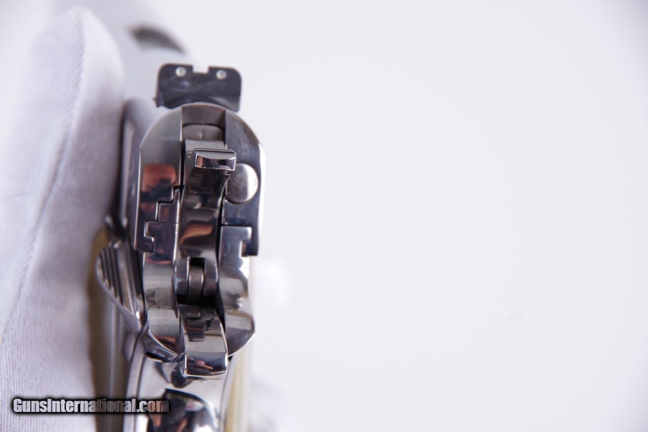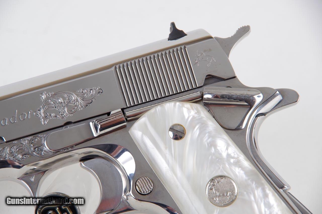 Description: Colt El Senador Supreme chambered in 38Super. This is a Lew Horton Special Edition that is number 17 of only 20 made. There are a few different variations of the Supreme that were made in addition to the standard Lew Horton El series runs. They were all made in runs of 20. The difference on these pistols is the factory engraving. This pistol is new in the original box numbered to the gun with all of the paperwork shown. The factory birght stainless finish is brilliant and mirror like throughout. There is only the slightest of handling and overall the finish rates 99%.The factory faux MOP grips are flawless. You can check my other listings for a few other rare Lew Hortons. SOLD Manufacturer: Colt Model: Government Caliber Info: 38 Super |