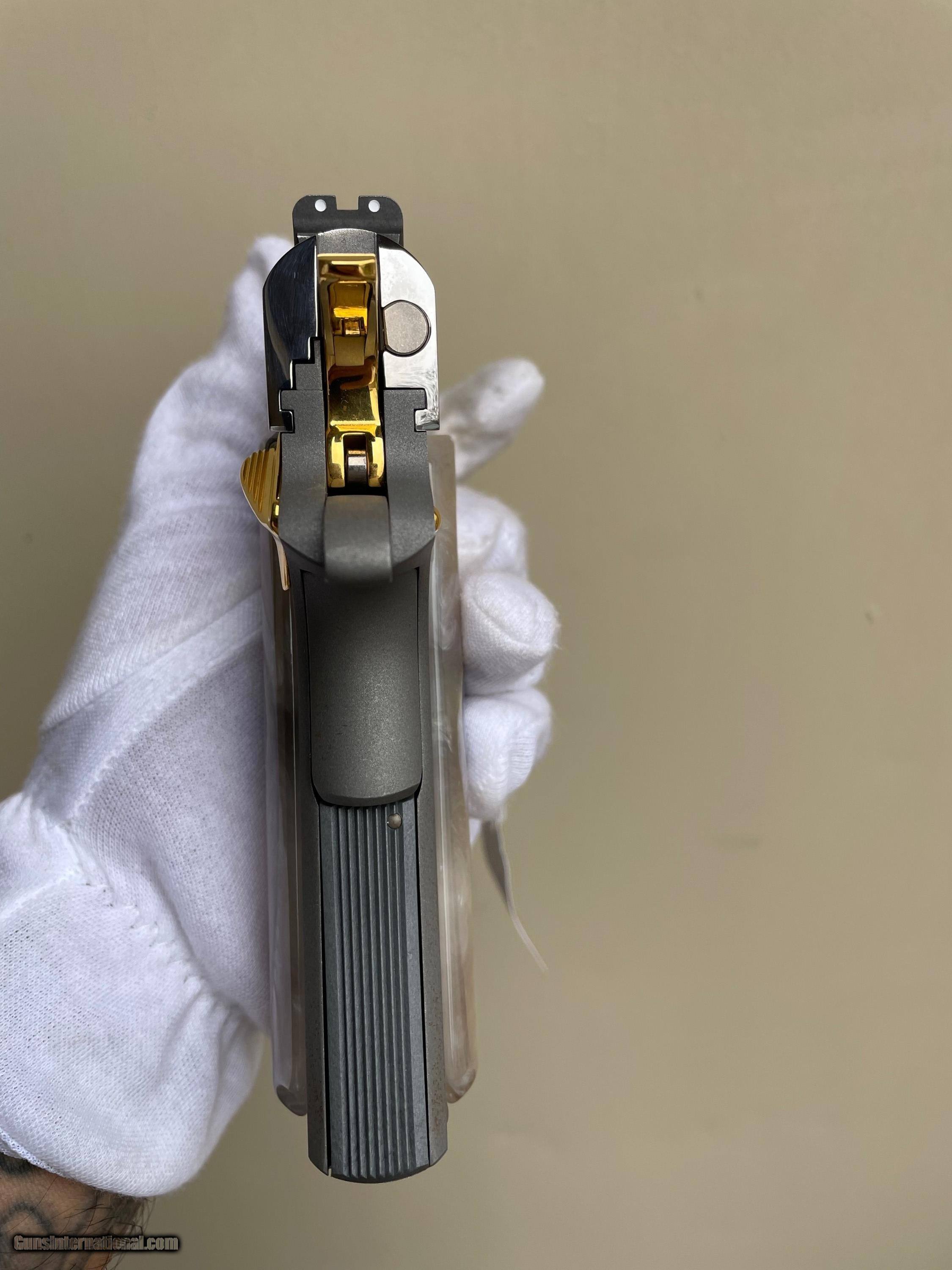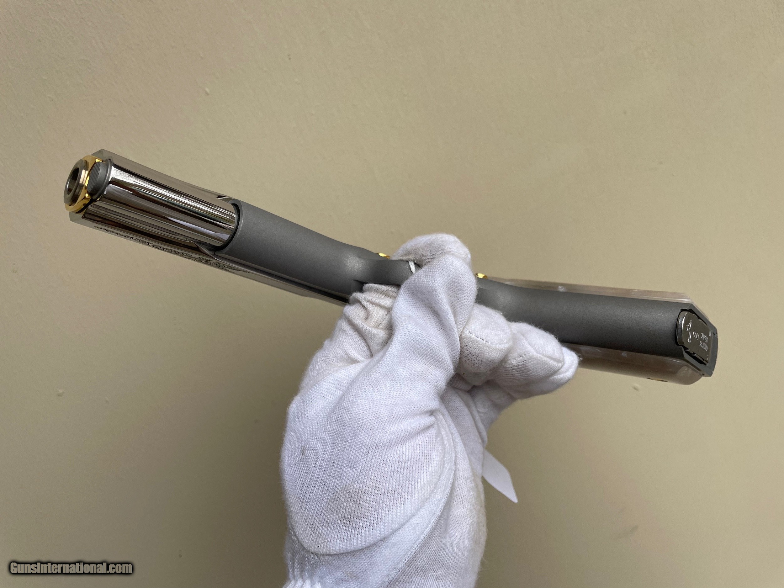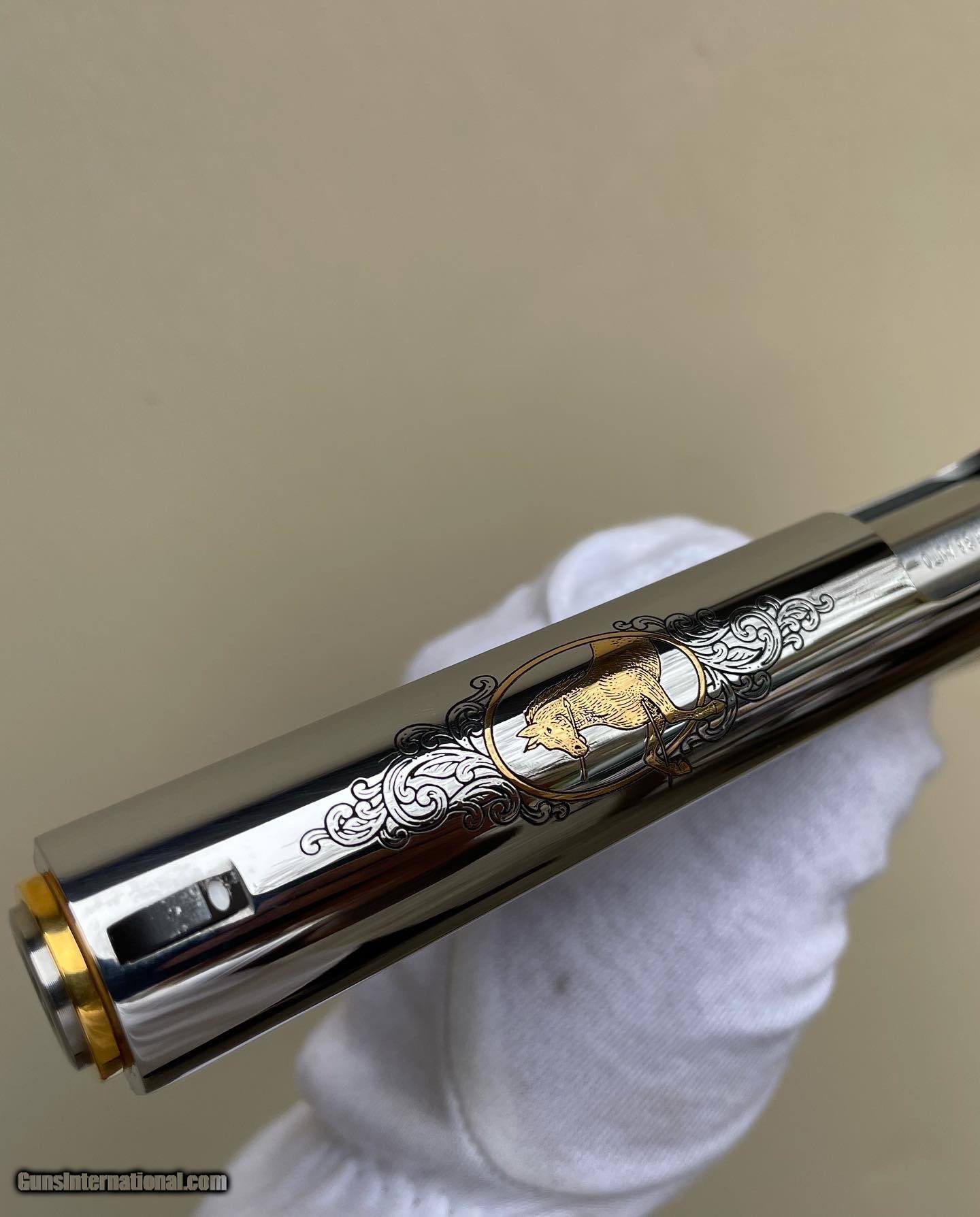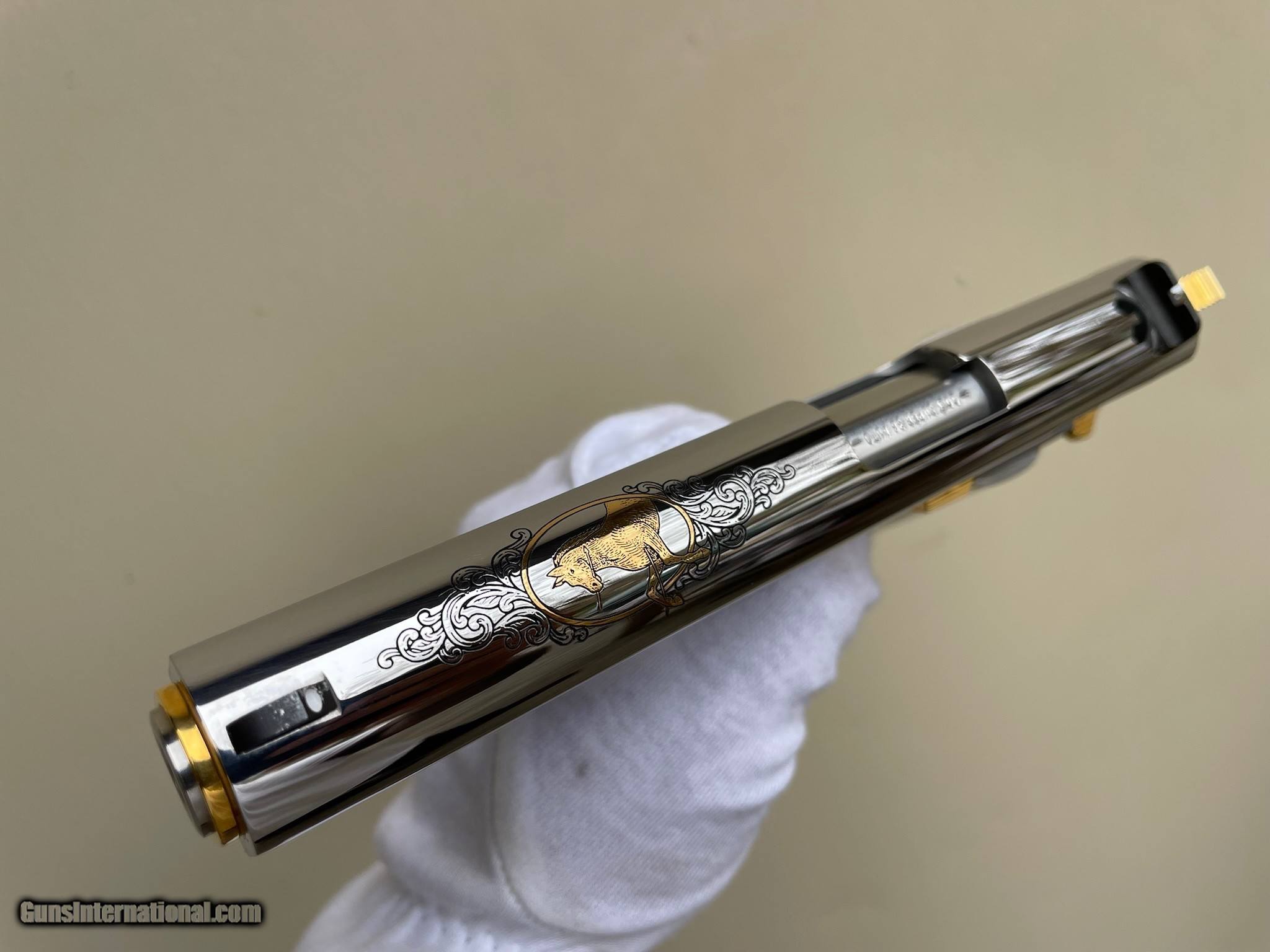 Description: Lew Horton Exclusive Premier Super 38 new in original box. Factory engraving with gold inlay on a bright stainless slide and brushed frame. Shipping $35 this pistol is not California Compliant. Feel free to call with any questions. SOLD |