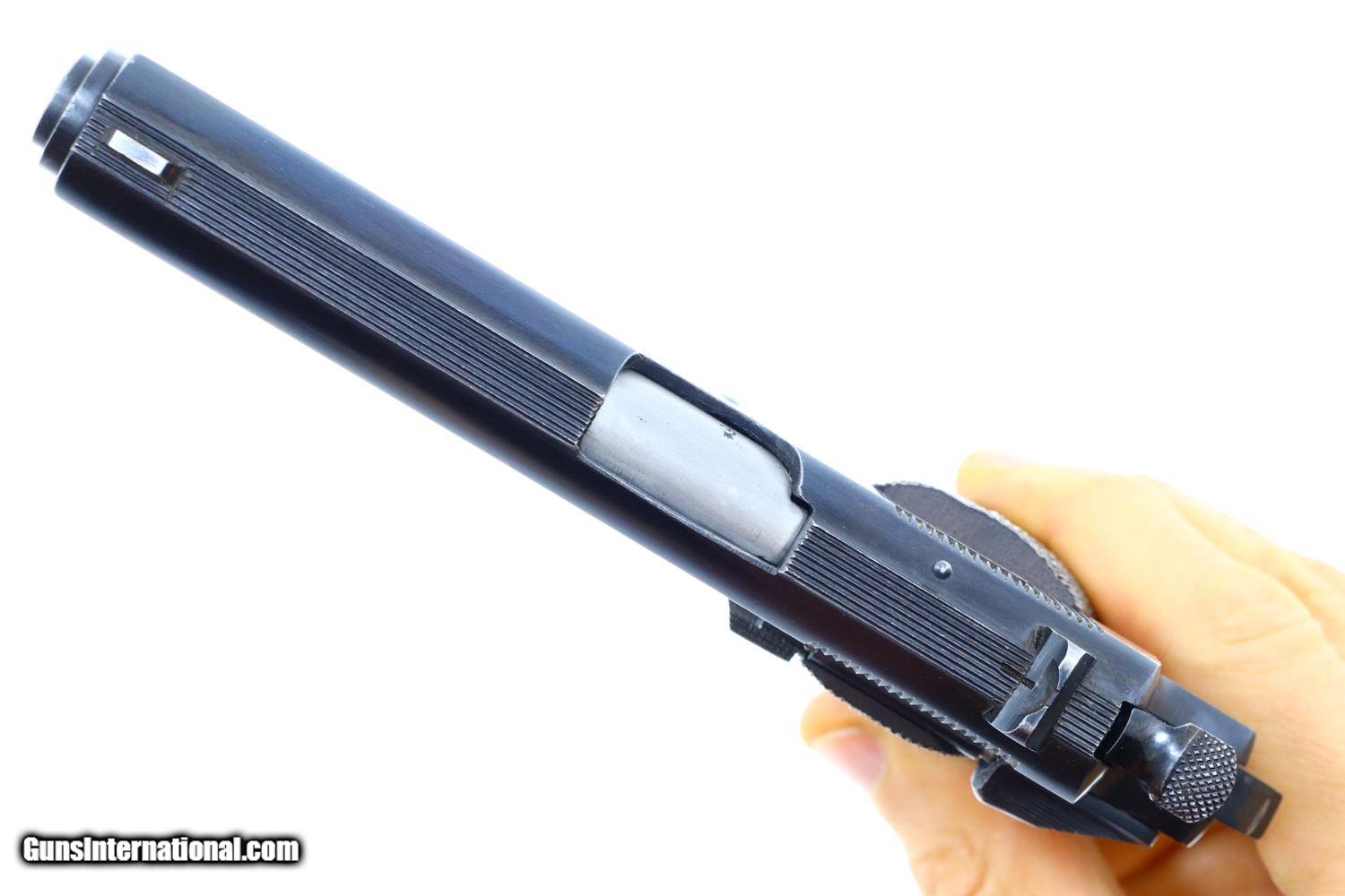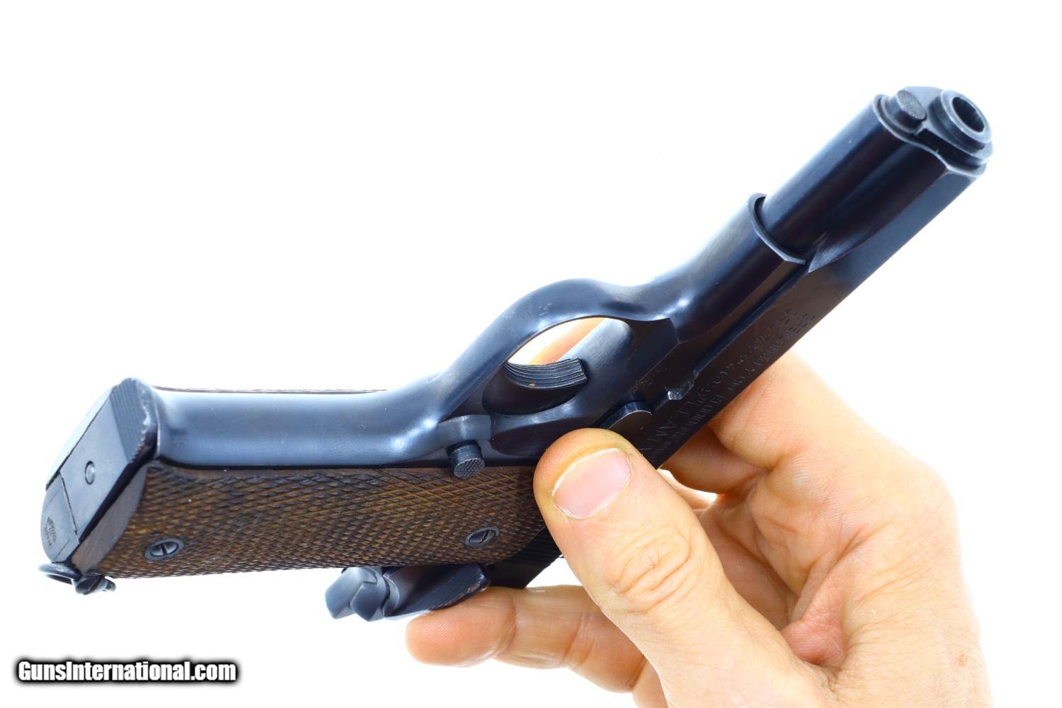 Description: Modified blowback pistol made by Gabilondo y Cia with 3.75” barrel having fixed front and drift adjustable rear sight with shallow serrated rib. Manufacturer and caliber markings on left side of slide with the trade name “LLAMA” ESPECIAL on the right side. Eibar proof marks with “X” reflecting production in 1952, the automatic pistol proof repeated on the left side of the slide and exposed barrel hood. Full serial number on the right side of the frame. Fitted with walnut checkered grips. Lanyard ring present. Push button detachable magazine, the right side with seven indicator holes, detachable floorplate with serrated toe. Synopsis: Early Spanish pocket pistol made in 1952 by Gabilondo y Cia, features similar to miniature Colt 1911A1. Condition: Near excellent with sharp edge wear, a scattering of very superficial scratches consistent with light field use. Comparable condition grips and magazine. Bright bore with sharp rifling. Perfect manual mechanics. A great look alike Colt 1911A1 from 1952! ~~Insured shipping fee of $45; most packages shipped using FedEx 2nd Day.~~ SOLD Manufacturer: Gabilondo y Cia Serial Number: 153502 Caliber Info: 7.65mm |