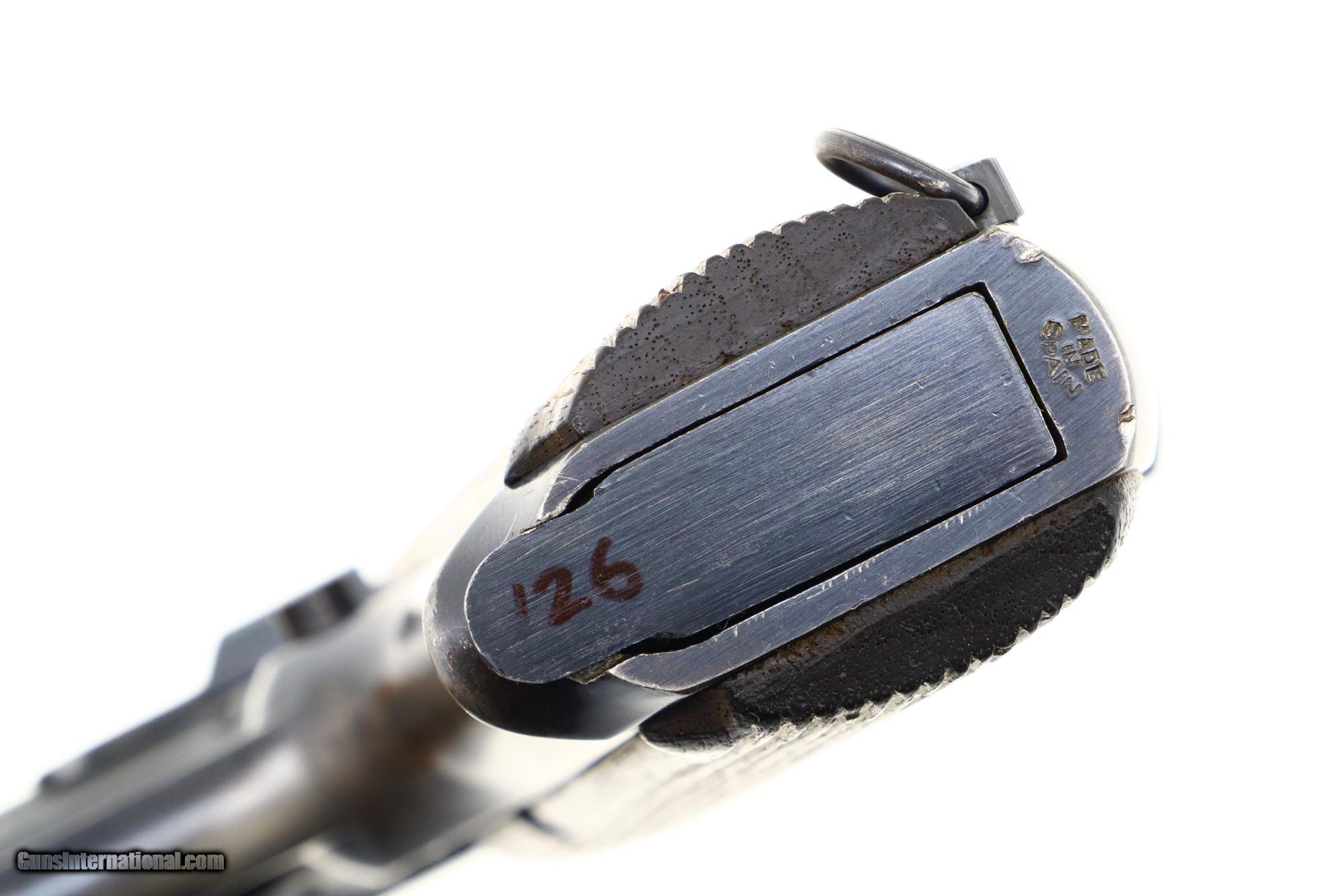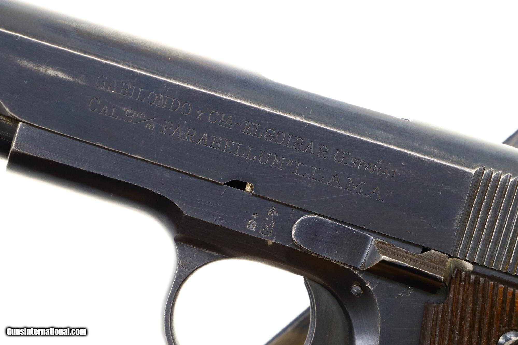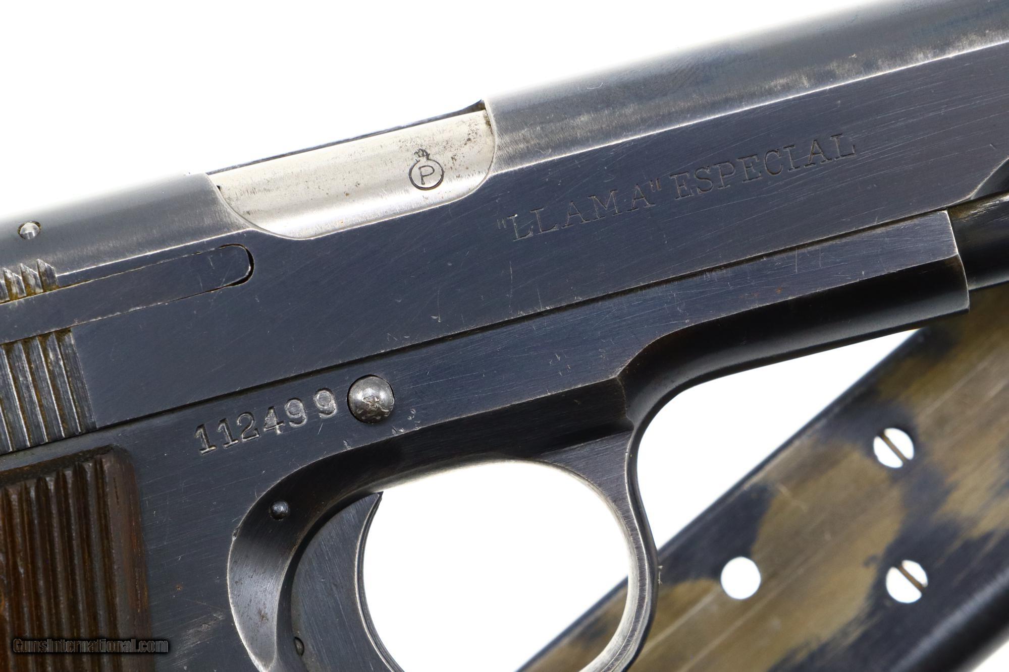 Description: Standard configuration Llama Especial with 5 inch barrel, having fixed front sight and drift adjustable rear sight. Left side of slide referencing manufacturer, location in Elgoibar and caliber. Eibar proofing on left frame with "Q" reflecting 1946. Automatic pistol proof repeated on left side of slide and exposed chamber. Right side of slide marked 'LLAMA' ESPECIAL. Full serial number on right side of frame. Disassembly shows matching slide and barrel with assembly number 803. Vertically serrated wood grips. Push button magazine release for single column magazine having 7 indicator holes and an enclosed floorplate. Synopsis: Highly attractive and uniquely configured full size Llama pistol with contoured frontstrap, made in 1946. Condition: VG+ with sharp edge wear and thinning of front and backstraps as carefully photographed suggesting moderate but careful use. Comparable conditon grips that are oil darkened and have a scattering of light handling marks. Bright bore with sharp rifling. Perfect manual mechanics. A uniquely configured single action 9mm Llama from 1946. ~~Insured shipping fee of $45; most packages shipped using FedEx 2nd Day.~~ SOLD Manufacturer: Llama Serial Number: 112499 Caliber Info: 9mmP |