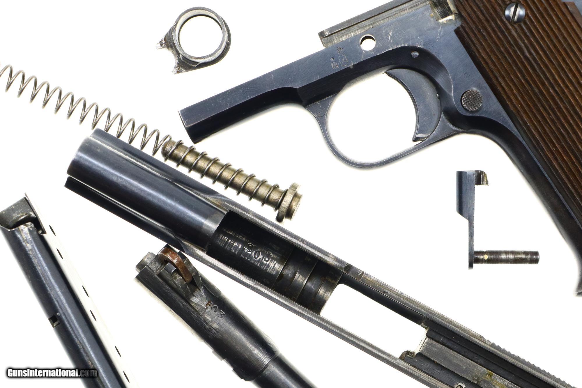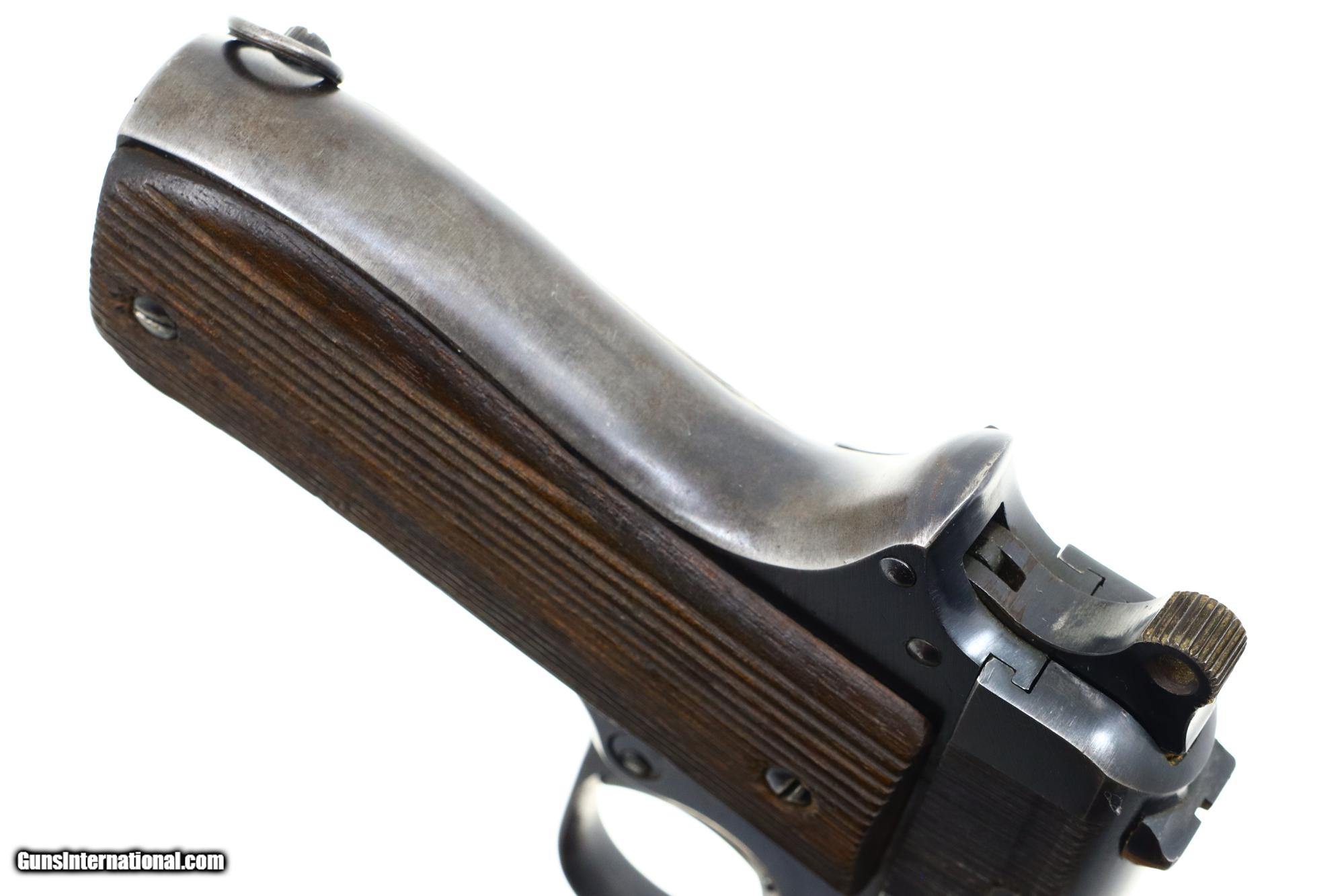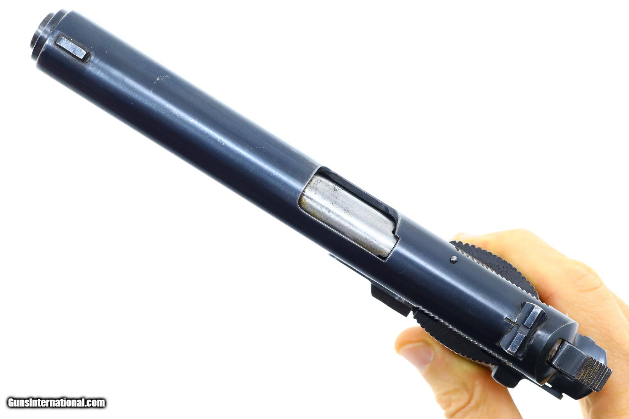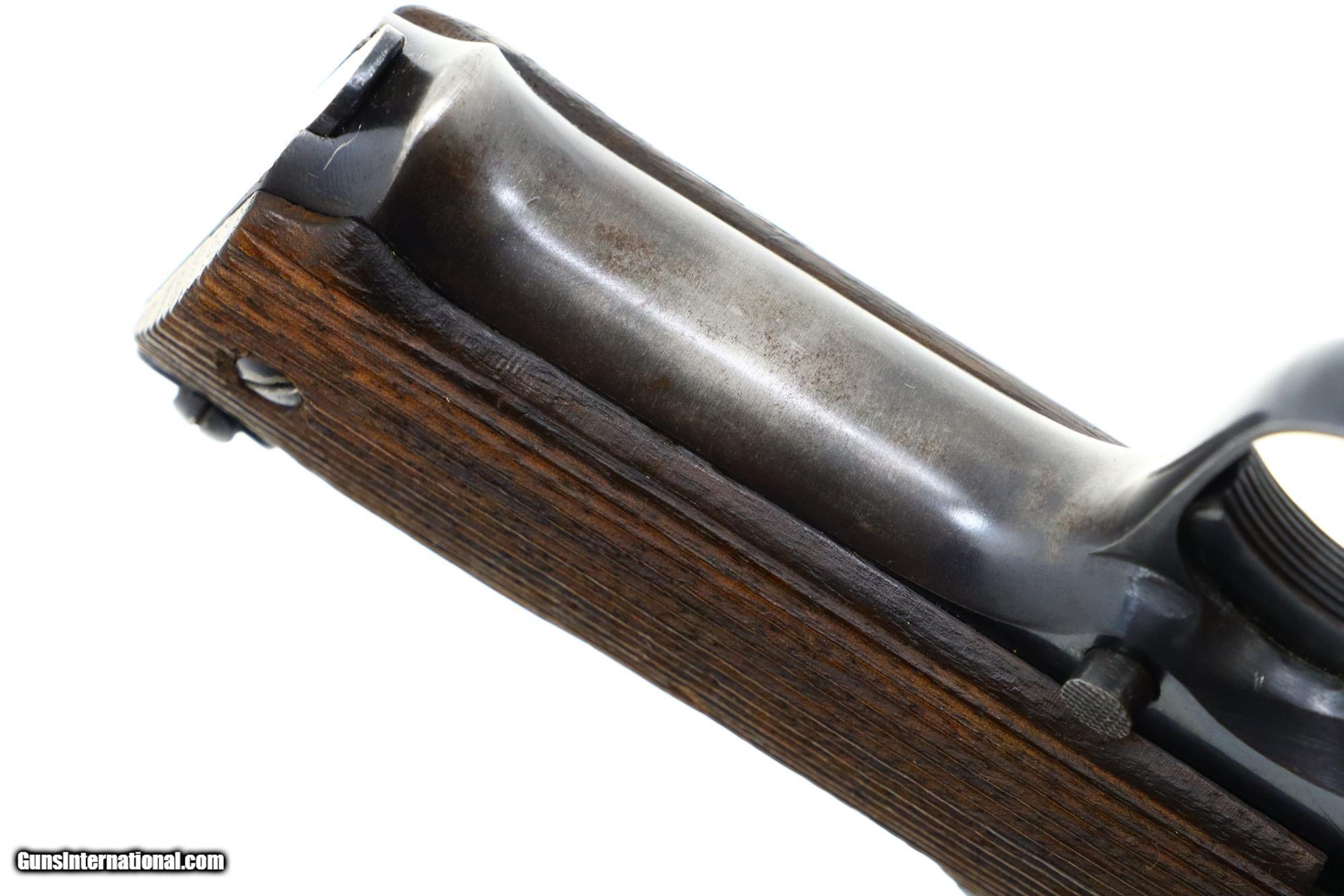 Description: Standard configuration Llama Especial with 5 inch barrel, having fixed front sight and drift adjustable rear sight. Left side of slide referencing manufacturer, location in Elgoibar and caliber. Eibar proofing on left frame with "Q" reflecting 1946. Automatic pistol proof repeated on left side of slide and exposed chamber. Right side of slide marked 'LLAMA' ESPECIAL. Full serial number on right side of frame. Disassembly shows matching slide and barrel with assembly number 803. Vertically serrated wood grips. Push button magazine release for single column magazine having 7 indicator holes and an enclosed floorplate. Synopsis: Highly attractive and uniquely configured full size Llama pistol with contoured frontstrap, made in 1946. Condition: VG+ with sharp edge wear and thinning of front and backstraps as carefully photographed suggesting moderate but careful use. Comparable conditon grips that are oil darkened and have a scattering of light handling marks. Bright bore with sharp rifling. Perfect manual mechanics. A uniquely configured single action 9mm Llama from 1946. ~~Insured shipping fee of $45; most packages shipped using FedEx 2nd Day.~~ SOLD Manufacturer: Llama Serial Number: 112499 Caliber Info: 9mmP |