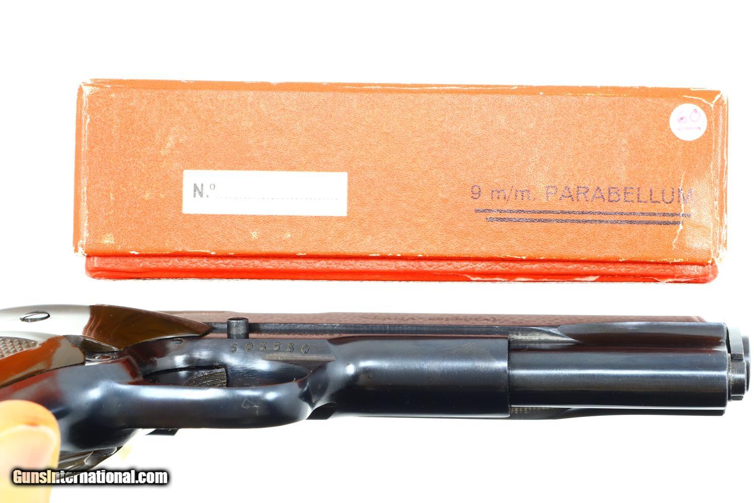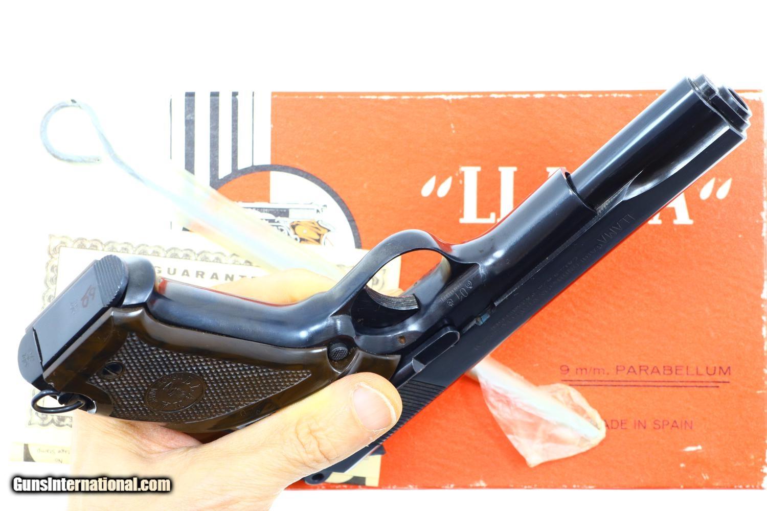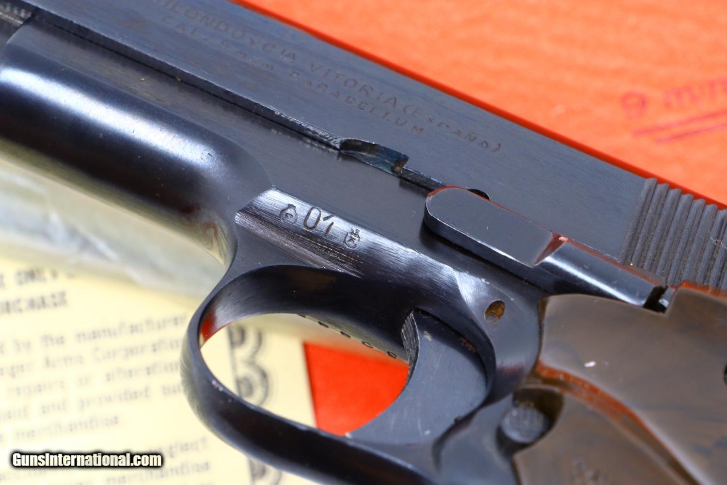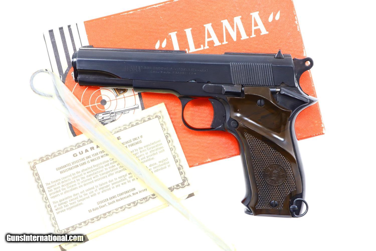 Description: Standard configuration Llama X1 pistol, made 1970, with fixed front and drift adjustable rear sight. Basically a single action, locked breech Colt 1911-type design with a uniquely contoured frontstrap and no grip safety. The left side of the slide is marked with the manufacturer address and caliber. The right side of the slide is marked “LLAMA” ESPECIAL. Imported by Stoeger Arms in N.J. Serial number and year code “01” reflecting manufacture in 1970 bracketing each side of trigger guard. Mottled brown thumb rest grips with molded checkering to include Llama trademark. Lanyard loop. Original magazine with seven indicator holes on the right side and detachable floorplate with toe serrations. Complete with original factory matching box with unwrapped cleaning rod and guarantee card. Synopsis: Spectacular Gabilondo y Cia X1, Spanish Pistol, 9mmP, virtually new, in factory matching box with unwrapped cleaning rod and guarantee. Condition: The pistol presents as virtually new, the left grip having a few tiny scratches. Mirror bore. Perfect manual mechanics. A crisp box with shop wear on edges but no repairs. A truly extraordinarily high condition Llama from 50-years ago! ~~Insured shipping fee of $55; most packages shipped using FedEx 2nd Day.~~ SOLD Manufacturer: Gabilando y Cia Serial Number: 506650 Caliber Info: 9mmP |