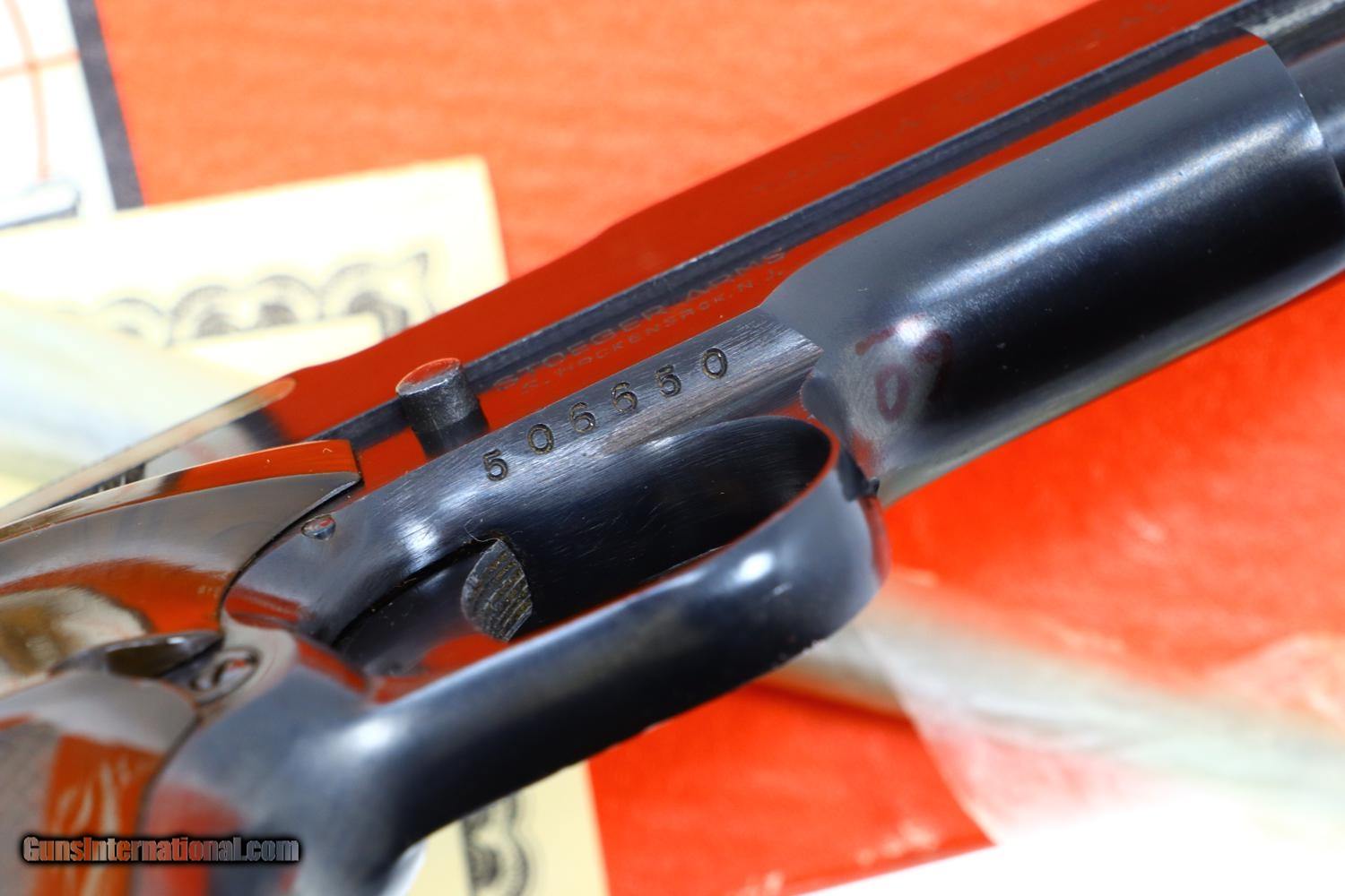 Description: Description: Standard configuration Llama X1 pistol, made 1970, with fixed front and drift adjustable rear sight. Basically a single action, locked breech Colt 1911-type design with a uniquely contoured frontstrap and no grip safety. The left side of the slide is marked with the manufacturer address and caliber. The right side of the slide is marked “LLAMA” ESPECIAL. Imported by Stoeger Arms in N.J. Serial number and year code “01” reflecting manufacture in 1970 bracketing each side of trigger guard. Mottled brown thumb rest grips with molded checkering to include Llama trademark. Lanyard loop. Original magazine with seven indicator holes on the right side and detachable floorplate with toe serrations. Complete with original factory matching box with unwrapped cleaning rod and guarantee card. Synopsis: Spectacular Gabilondo y Cia X1, Spanish Pistol, 9mmP, virtually new, in factory matching box with unwrapped cleaning rod and guarantee. Condition: The pistol presents as virtually new, the left grip having a few tiny scratches. Mirror bore. Perfect manual mechanics. A crisp box with shop wear on edges but no repairs. A truly extraordinarily high condition Llama from 50-years ago! SOLD Manufacturer: Gabilando y Cia Serial Number: 506650 Caliber Info: 9mmP |