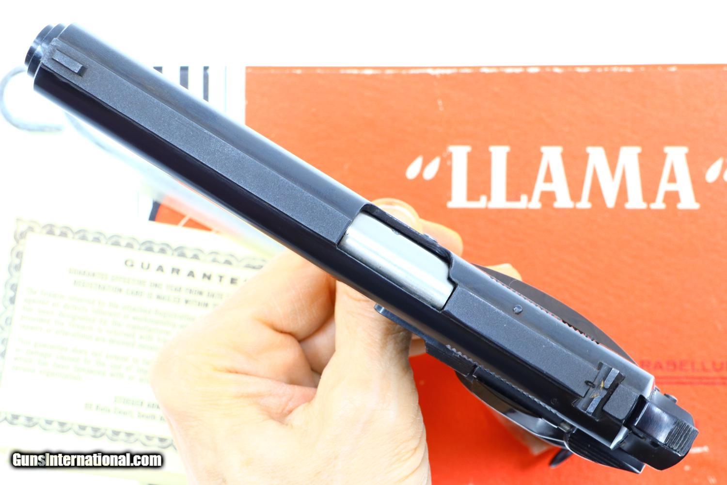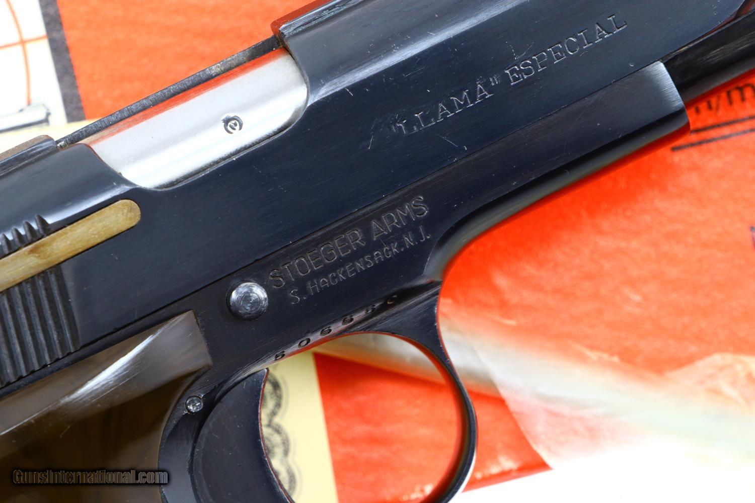 Standard configuration Llama X1 pistol, made 1970, with fixed front and drift adjustable rear sight. Basically a single action, locked breech Colt 1911-type design with a uniquely contoured frontstrap and no grip safety. The left side of the slide is marked with the manufacturer address and caliber. The right side of the slide is marked “LLAMA” ESPECIAL. Imported by Stoeger Arms in N.J. Serial number and year code “01” reflecting manufacture in 1970 bracketing each side of trigger guard. Mottled brown thumb rest grips with molded checkering to include Llama trademark. Lanyard loop. Original magazine with seven indicator holes on the right side and detachable floorplate with toe serrations. Complete with original factory matching box with unwrapped cleaning rod and guarantee card.
