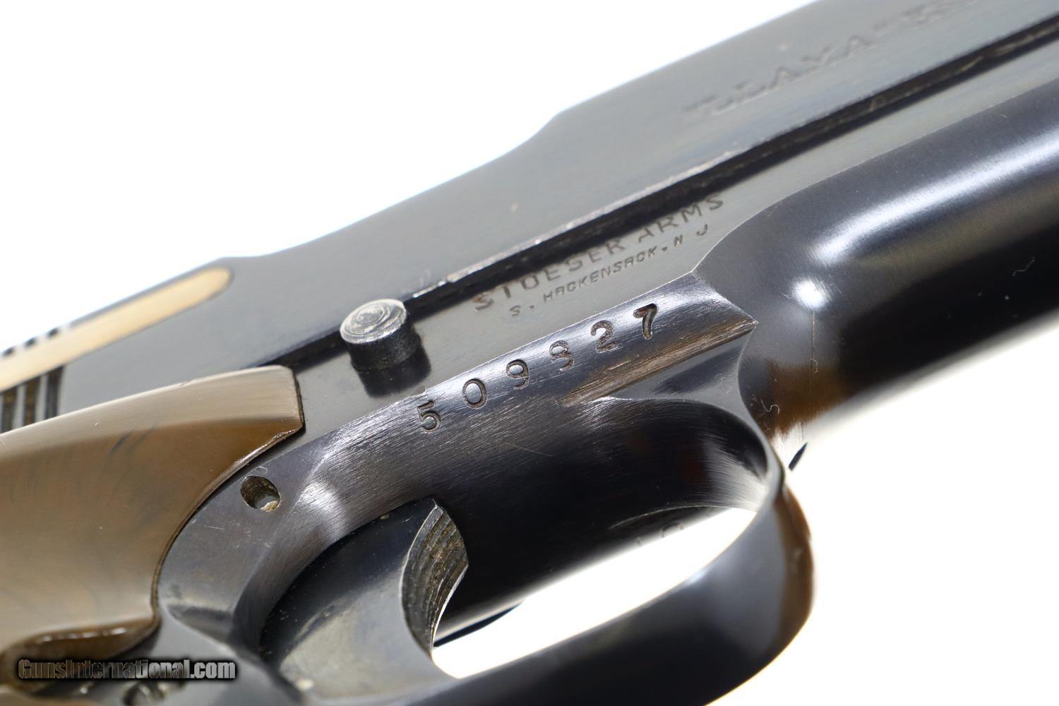 Description: Standard configuration Llama X1 pistol, made 1976, with fixed front and drift adjustable rear sight. Basically a single action, locked breech Colt 1911-type design with a uniquely contoured frontstrap and no grip safety. The left side of the slide is marked with the manufacturer address and caliber. The right side of the slide is marked “LLAMA” ESPECIAL. Imported by Stoeger Arms in N.J. Serial number and year code “U1” reflecting manufacture in 1976 bracketing each side of trigger guard. Mottled brown thumb rest grips with molded checkering to include Llama trademark. Lanyard loop. Original magazine with seven indicator holes on the right side and detachable floorplate with toe serrations. Complete with spare magazine and custom presentation case, compartmentalized for pistol and spare magazine, lined in red velvet, with brass plaque. Synopsis: Spectacular Gabilondo y Cia X1, Spanish Pistol, 9mmP, virtually new, spare magazine, custom velvet lined presentation case with brass plaque. Condition: The pistol presents as nearly new, the right grip having a few tiny scratches and scuffs. Comparable condition magazines. Mirror bore. Perfect manual mechanics. Excellent presentation case. A truly extraordinarily high condition Llama from 50-years ago! ~~Insured shipping fee of $55; most packages shipped using FedEx 2nd Day.~~ SOLD Manufacturer: Gabilando y Cia Serial Number: 509827 Caliber Info: 9mmP |