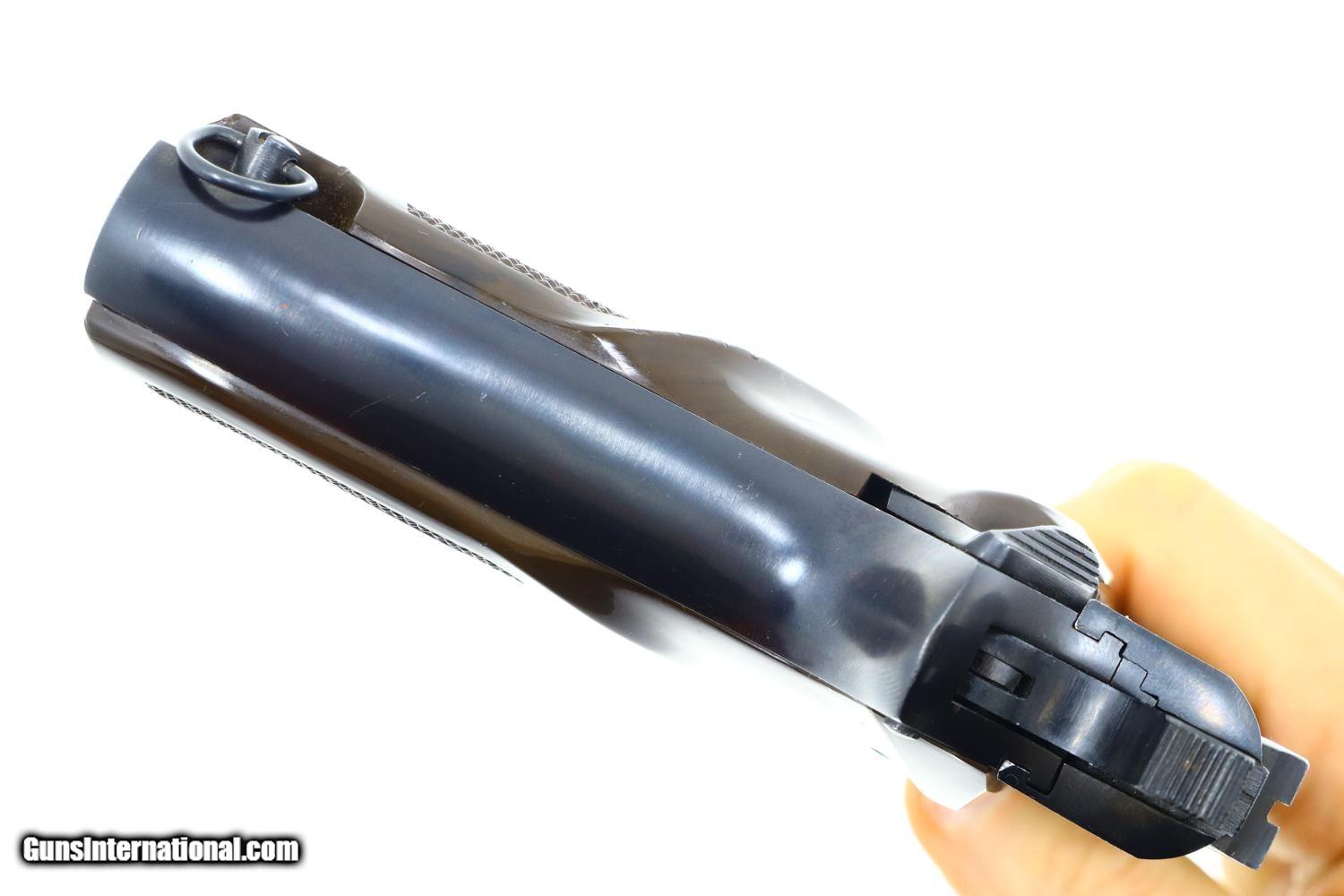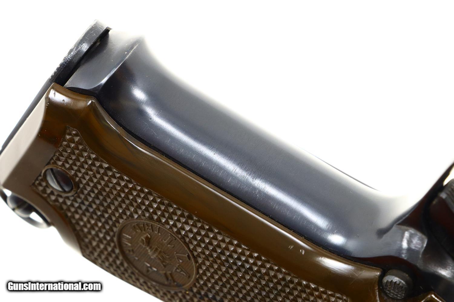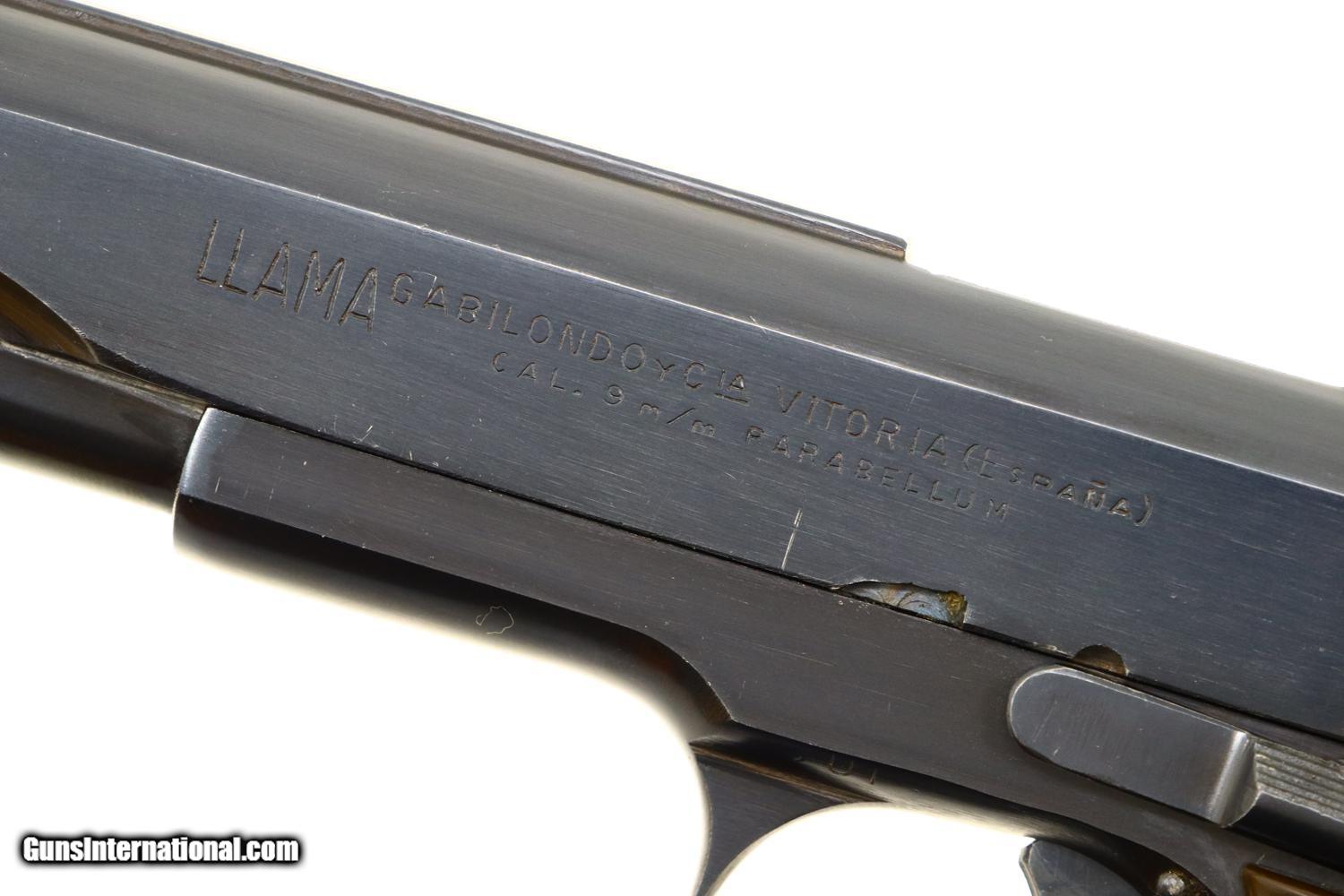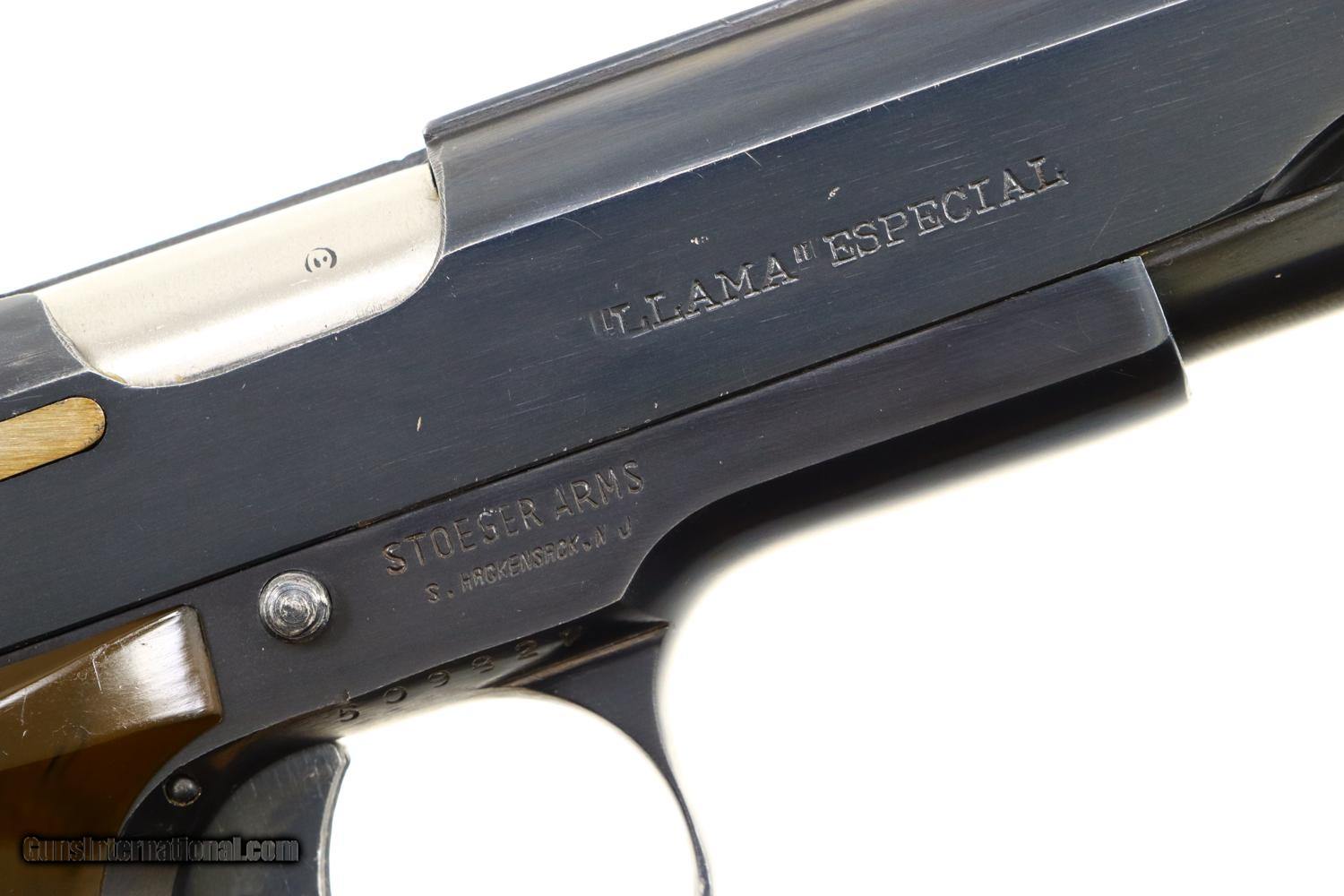 Description: Standard configuration Llama X1 pistol, made 1976, with fixed front and drift adjustable rear sight. Basically a single action, locked breech Colt 1911-type design with a uniquely contoured frontstrap and no grip safety. The left side of the slide is marked with the manufacturer address and caliber. The right side of the slide is marked “LLAMA” ESPECIAL. Imported by Stoeger Arms in N.J. Serial number and year code “U1” reflecting manufacture in 1976 bracketing each side of trigger guard. Mottled brown thumb rest grips with molded checkering to include Llama trademark. Lanyard loop. Original magazine with seven indicator holes on the right side and detachable floorplate with toe serrations. Complete with spare magazine and custom presentation case, compartmentalized for pistol and spare magazine, lined in red velvet, with brass plaque. Synopsis: Spectacular Gabilondo y Cia X1, Spanish Pistol, 9mmP, virtually new, spare magazine, custom velvet lined presentation case with brass plaque. Condition: The pistol presents as nearly new, the right grip having a few tiny scratches and scuffs. Comparable condition magazines. Mirror bore. Perfect manual mechanics. Excellent presentation case. A truly extraordinarily high condition Llama from 50-years ago! ~~Insured shipping fee of $55; most packages shipped using FedEx 2nd Day.~~ SOLD Manufacturer: Gabilando y Cia Serial Number: 509827 Caliber Info: 9mmP |