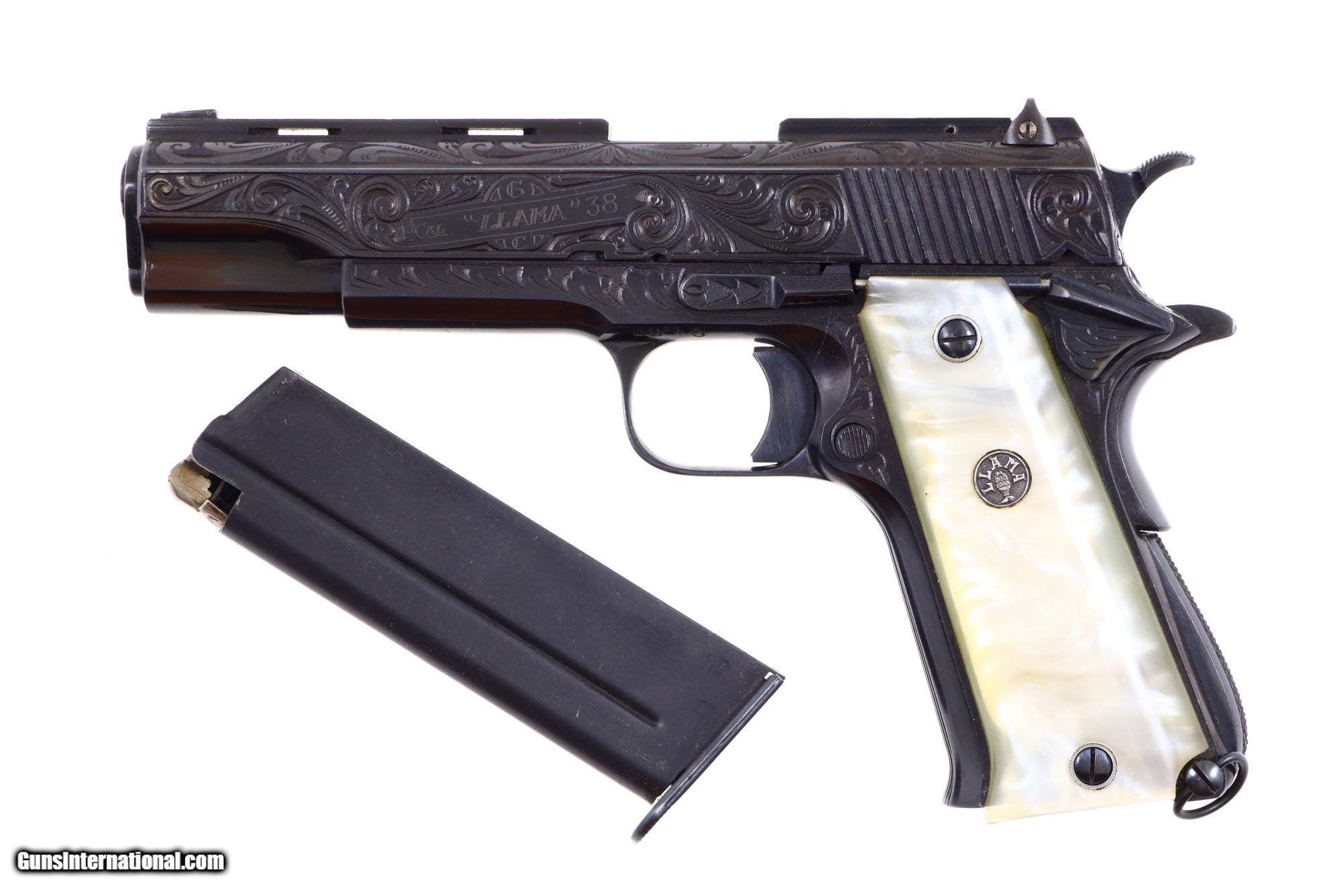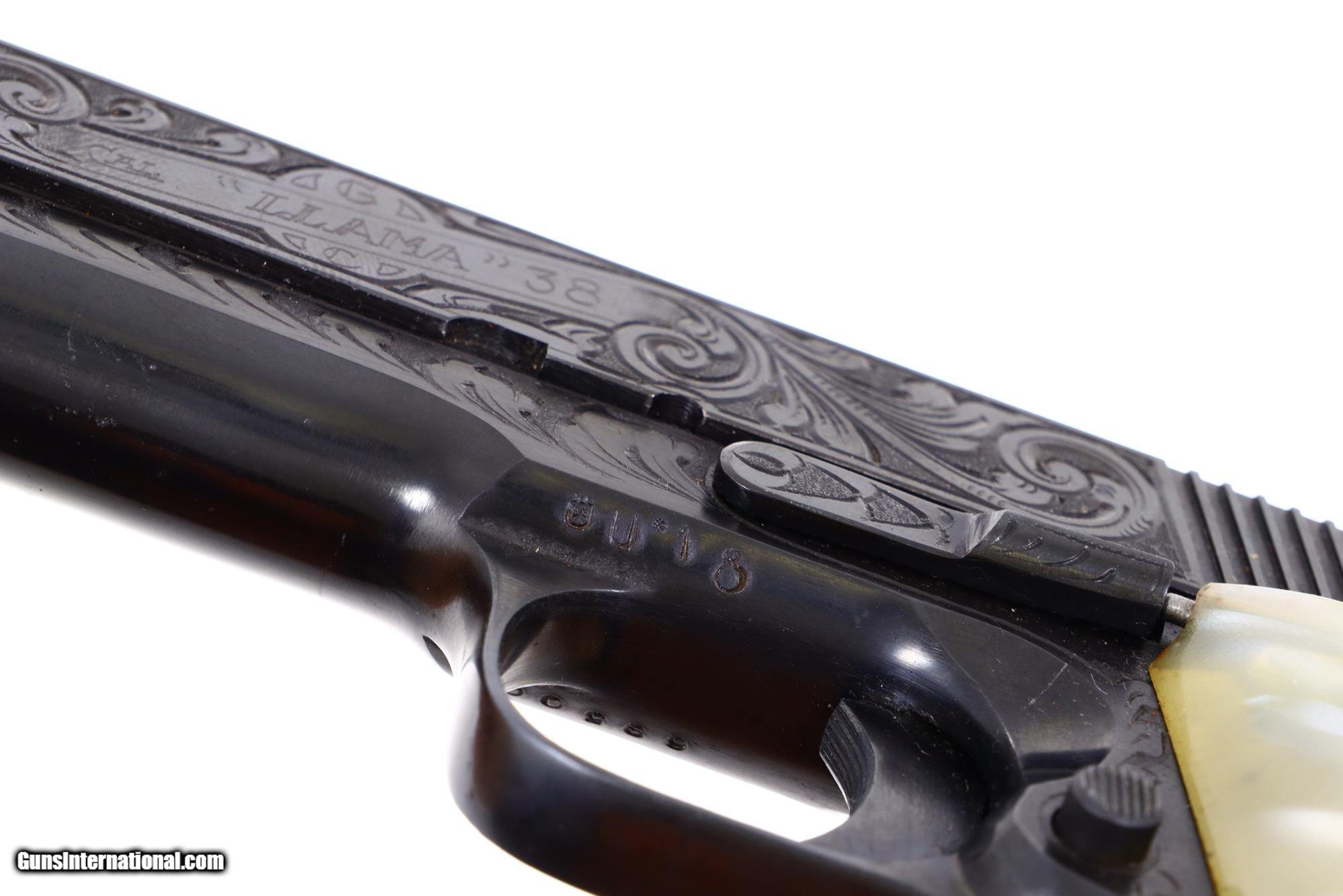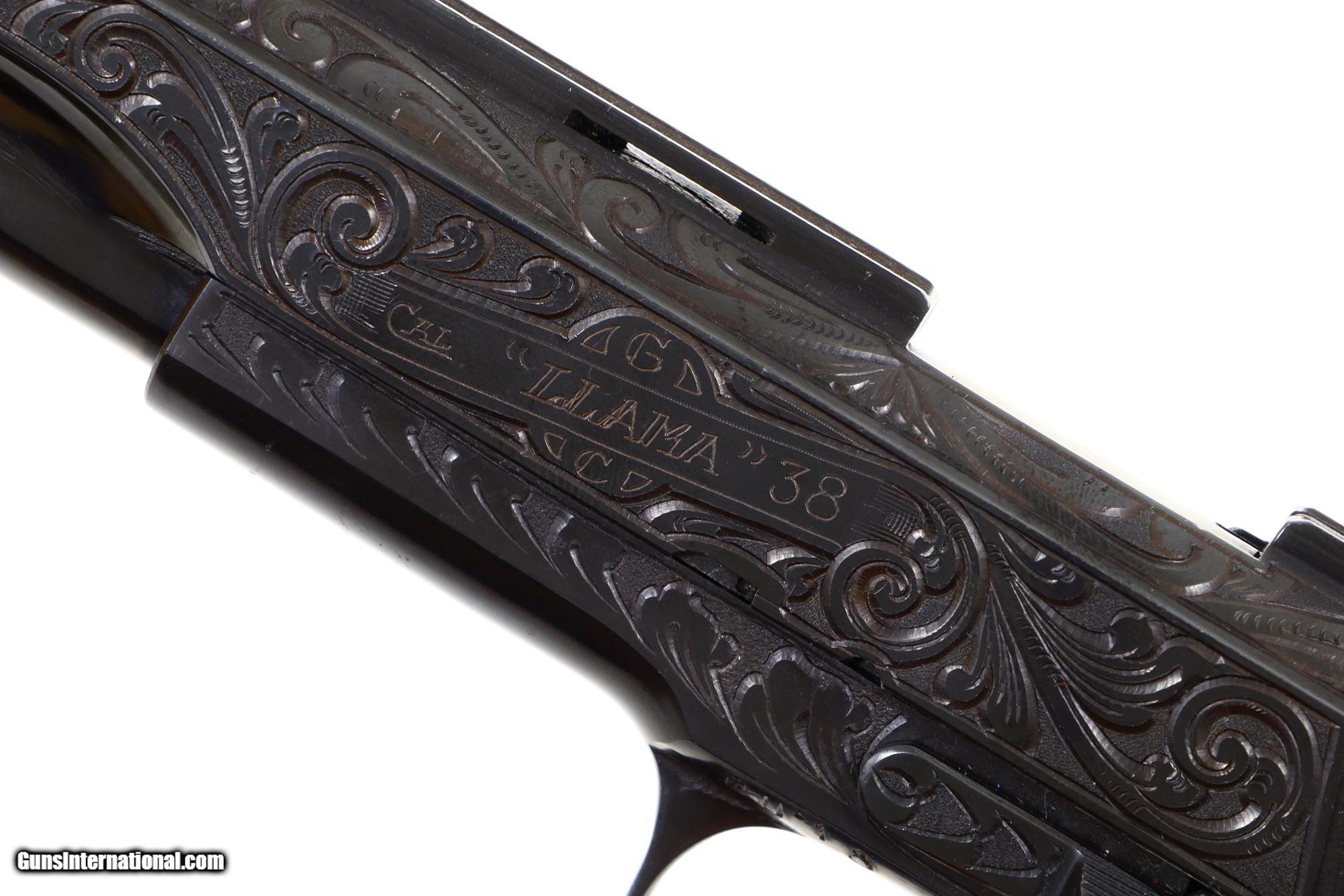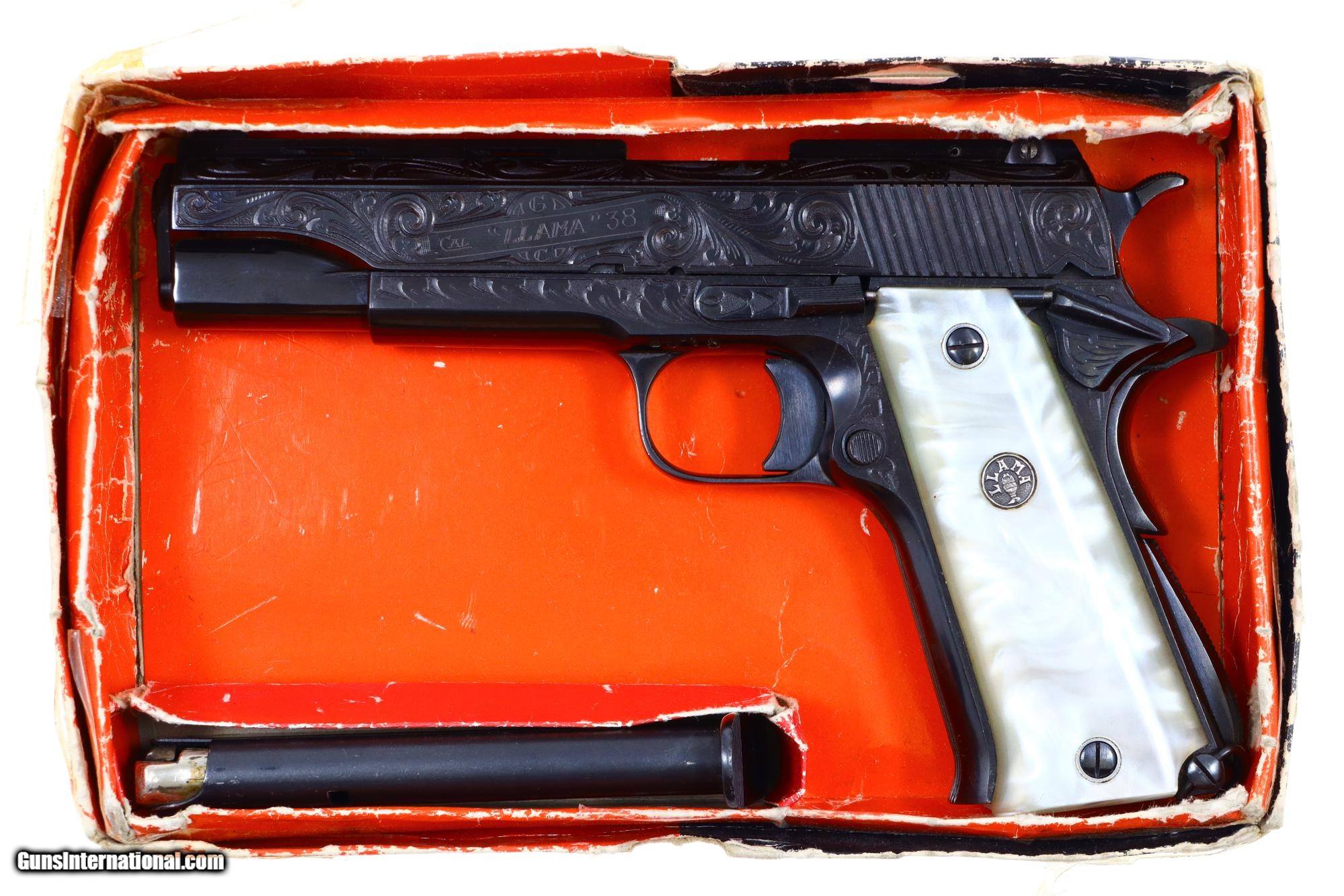 Description: Spectacular 99+% original finish, full size Llama pistol in 9mm Largo (.38), closely modeled after the Colt 1911A1 Government Model, with deep factory engraving, blued with Pearlite grips, in matching box. Pistol with 5 inch barrel, fixed front sight, drift adjustable rear sight with dual screw fixation, shallow ventilated rib, single action with serrated semi-beavertail hammer, grip safety, palm swell, lanyard ring, and correct magazine. The "LLAMA" notation in a hand inscribed banner on the left side of the slide. The left side of the frame marked with a proofing triad whereby U1 reflects production in 1976. Full serial number on the right side of the frame, along with "Stoeger Industries." The top and both sides are covered with deep factory engraving, the typical shield logo on the right side of the slide. Front strap with full vertical serrations. Fitted with the special pearlite grips, each panel with a silvered "LLAMA" escutcheon. Magazine with 8 indicator holes on the right side. Oversized detachable floor plate, forward serrations, marked "Made In Spain". Factory matching box marked with serial number and factory engraved status. Synopsis: Phenomenal, full sized, factory engraved Llama Gabilondo y Cia pistol with matching box. Condition: The pistol retains 99++% of its bright blue original finish, just a few small dings under the forward frame and a hairline scratch reflecting improper re-insertion of the slide stop. Grip straps, grips, and magazine are in the same impeccable condition. Mirror bore. Perfect manual mechanics. Tattered box with taped repairs. One of the most impressively engraved Llama pistols, this one nearly new in original box, being sold for 1/20th the cost of a comparable pre-war Colt. ~~Insured shipping fee of $75; most packages shipped using FedEx 2nd Day.~~ SOLD Manufacturer: Llama Serial Number: 695002 Caliber Info: 9mm Largo |