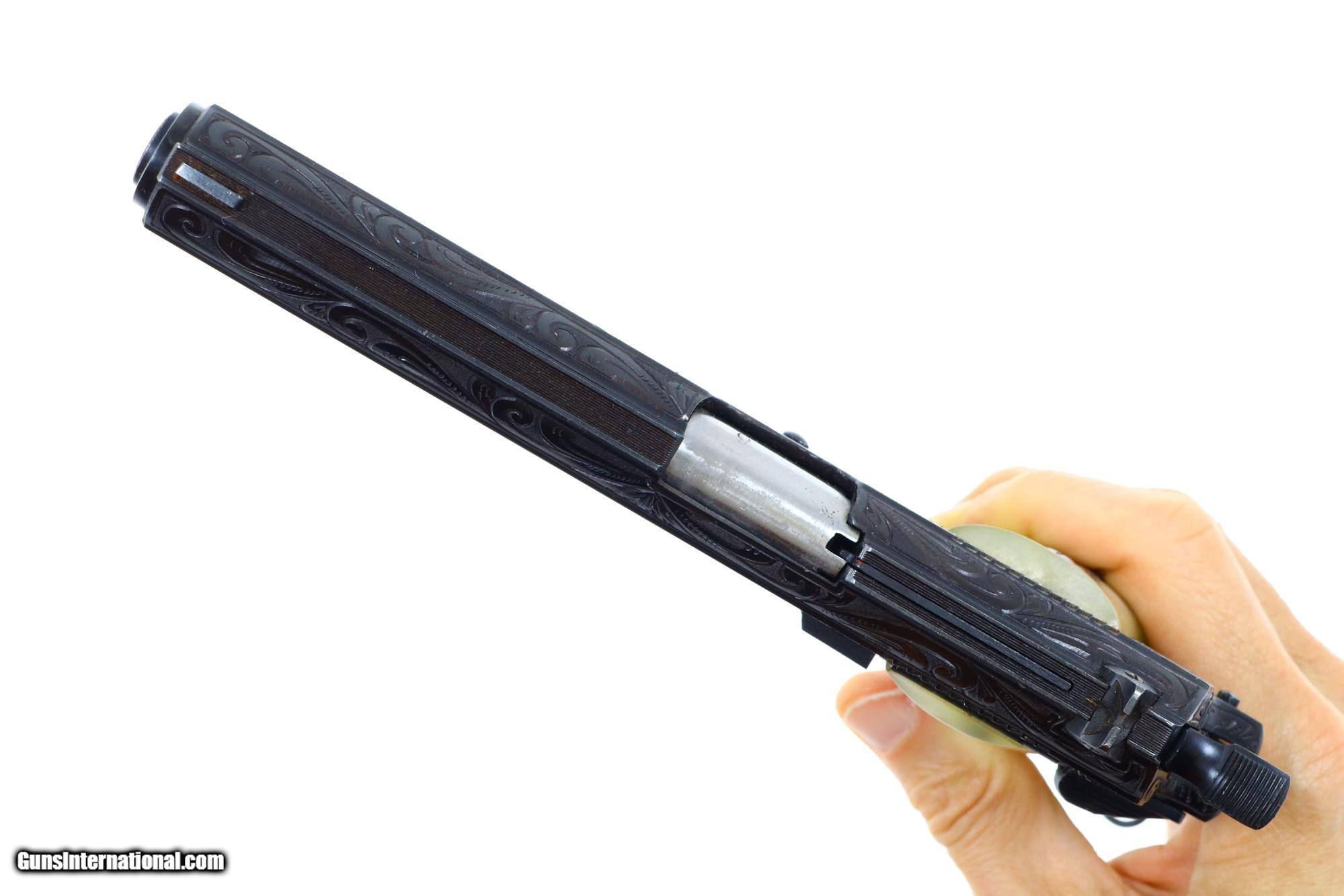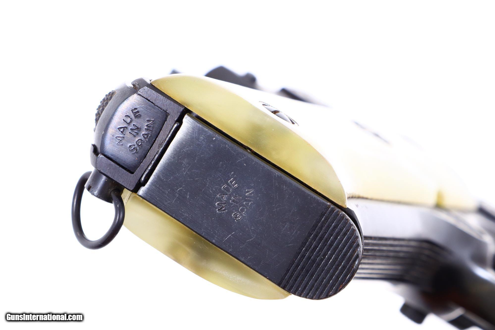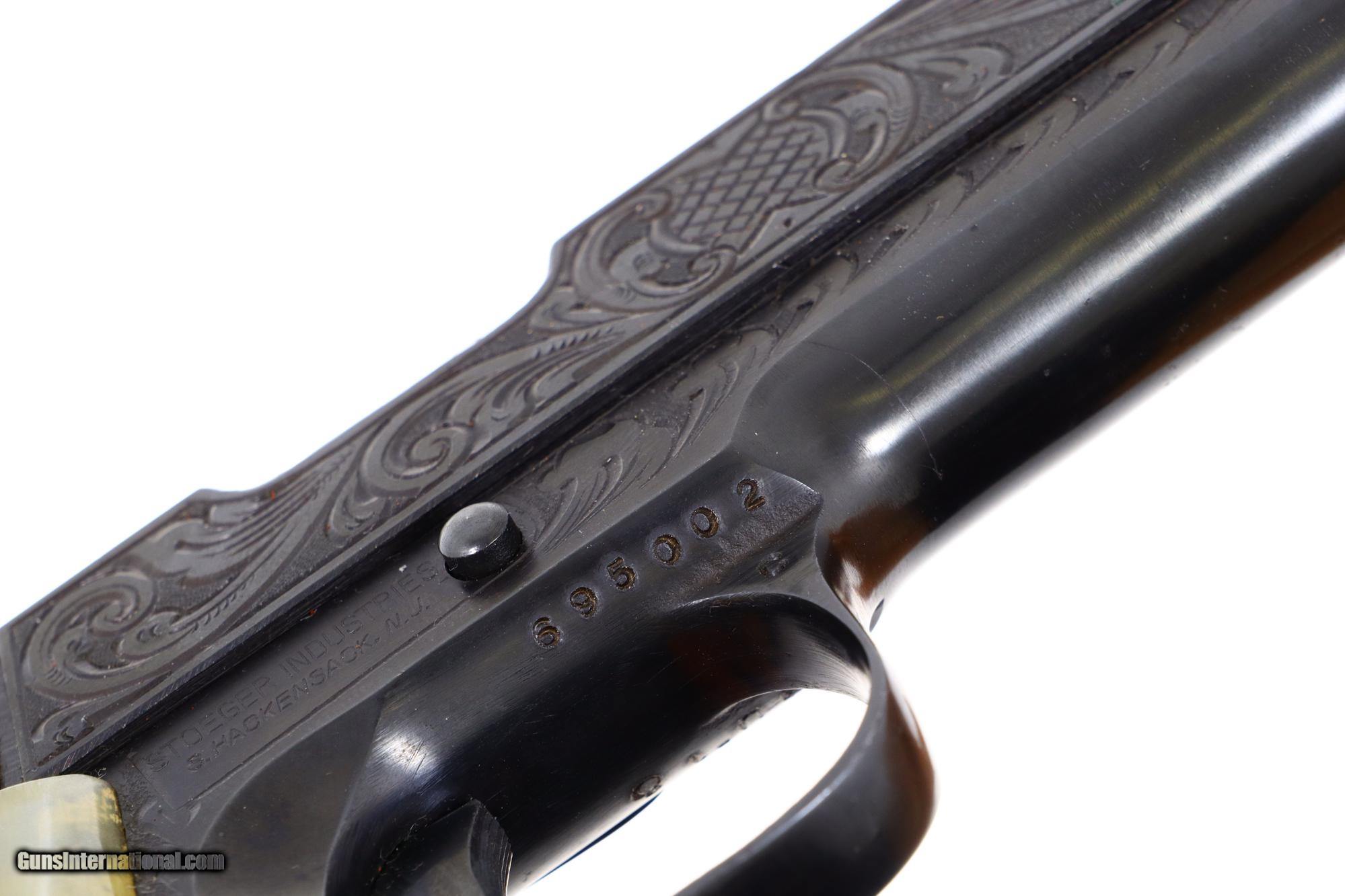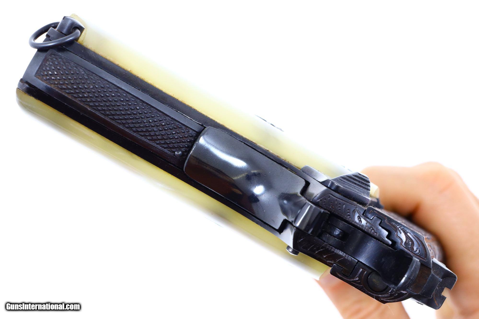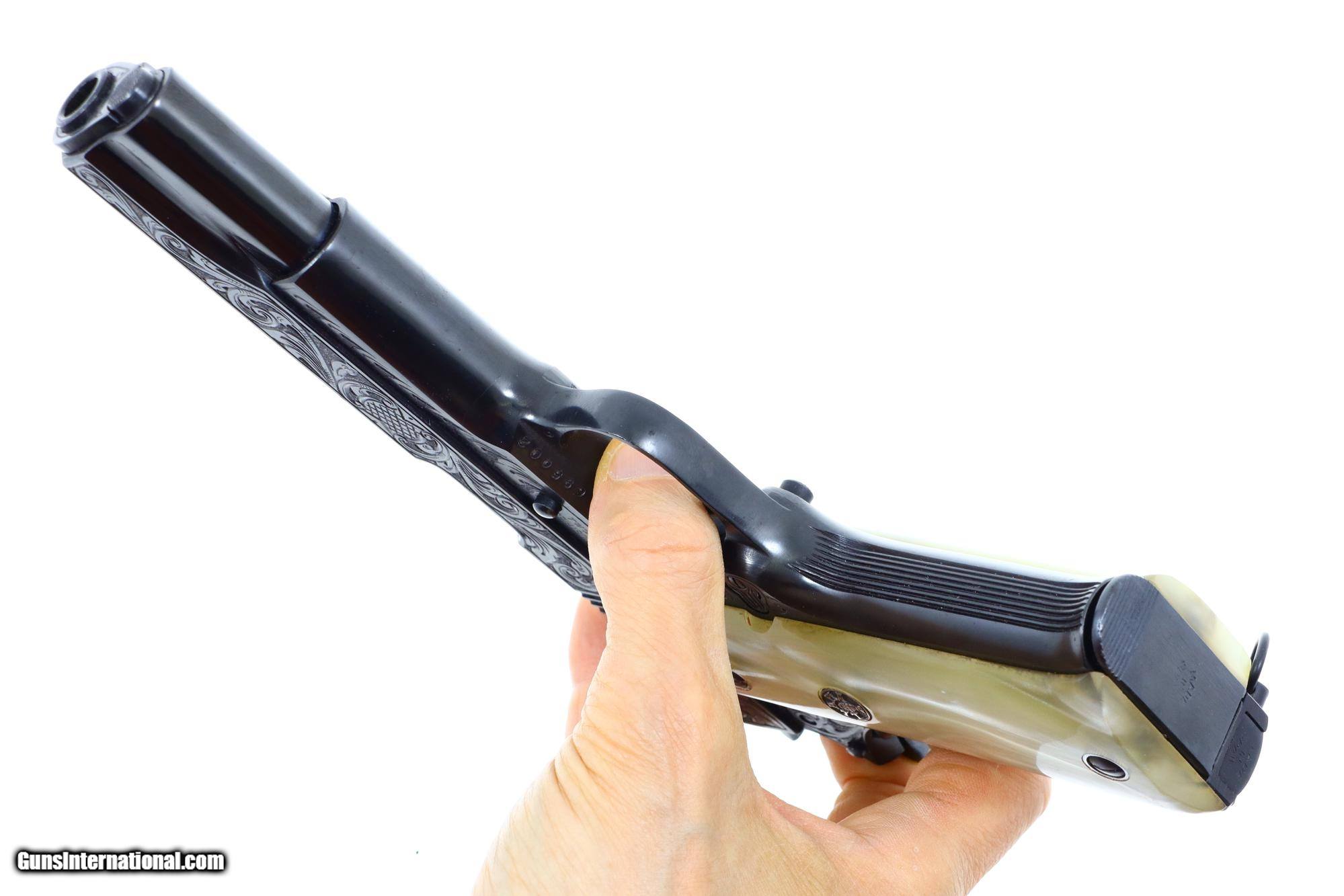 Description: Spectacular 99+% original finish, full size Llama pistol in 9mm Largo (.38), closely modeled after the Colt 1911A1 Government Model, with deep factory engraving, blued with Pearlite grips, in matching box. Pistol with 5 inch barrel, fixed front sight, drift adjustable rear sight with dual screw fixation, shallow ventilated rib, single action with serrated semi-beavertail hammer, grip safety, palm swell, lanyard ring, and correct magazine. The "LLAMA" notation in a hand inscribed banner on the left side of the slide. The left side of the frame marked with a proofing triad whereby U1 reflects production in 1976. Full serial number on the right side of the frame, along with "Stoeger Industries." The top and both sides are covered with deep factory engraving, the typical shield logo on the right side of the slide. Front strap with full vertical serrations. Fitted with the special pearlite grips, each panel with a silvered "LLAMA" escutcheon. Magazine with 8 indicator holes on the right side. Oversized detachable floor plate, forward serrations, marked "Made In Spain". Factory matching box marked with serial number and factory engraved status. Synopsis: Phenomenal, full sized, factory engraved Llama Gabilondo y Cia pistol with matching box. Condition: The pistol retains 99++% of its bright blue original finish, just a few small dings under the forward frame and a hairline scratch reflecting improper re-insertion of the slide stop. Grip straps, grips, and magazine are in the same impeccable condition. Mirror bore. Perfect manual mechanics. Tattered box with taped repairs. One of the most impressively engraved Llama pistols, this one nearly new in original box, being sold for 1/20th the cost of a comparable pre-war Colt. ~~Insured shipping fee of $75; most packages shipped using FedEx 2nd Day.~~ SOLD Manufacturer: Llama Serial Number: 695002 Caliber Info: 9mm Largo |